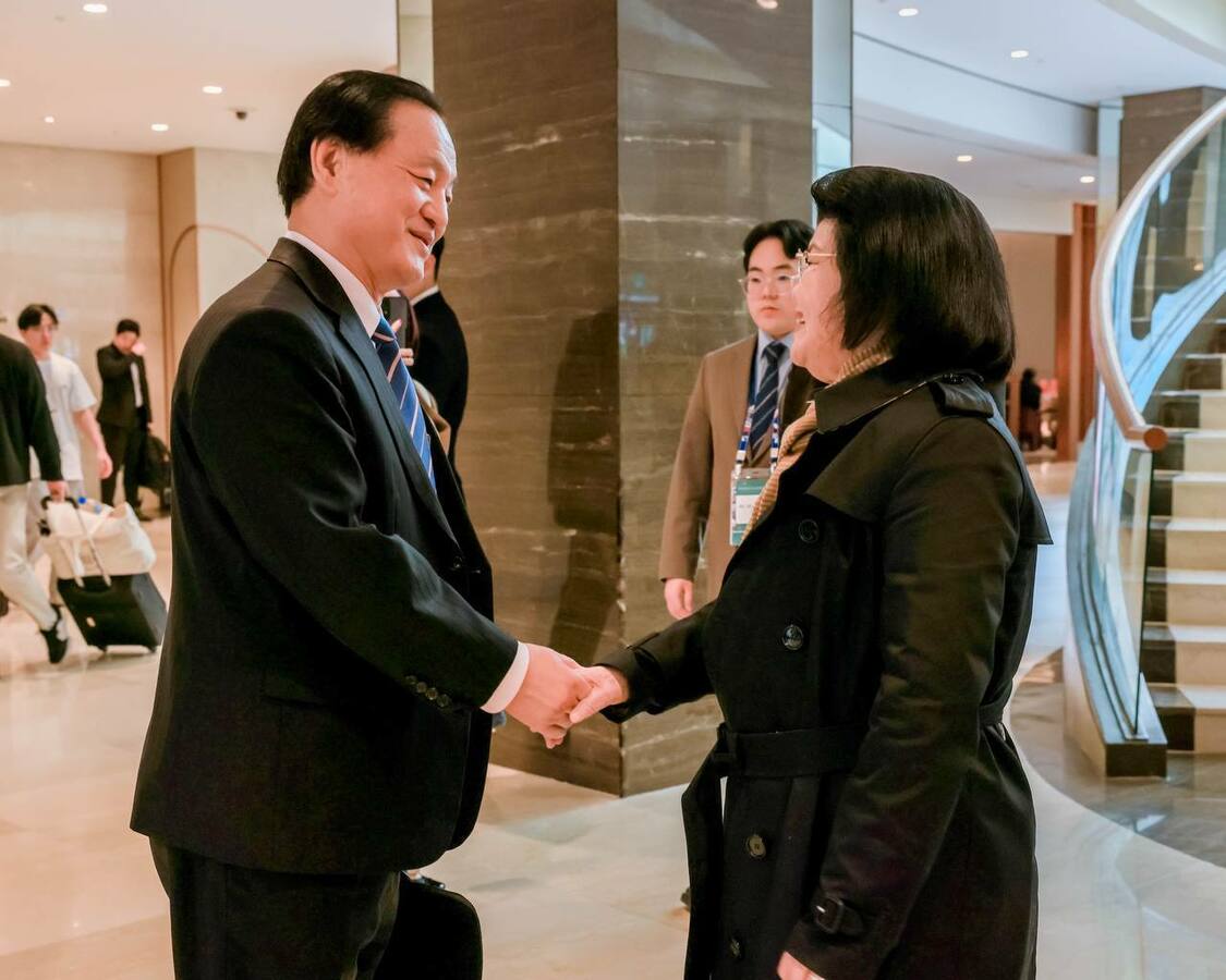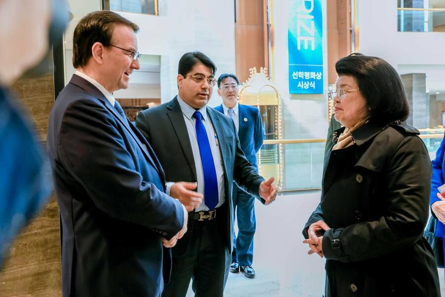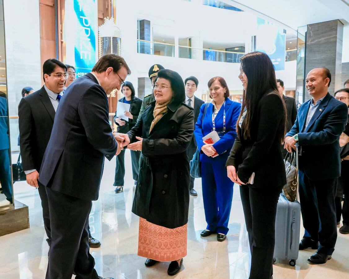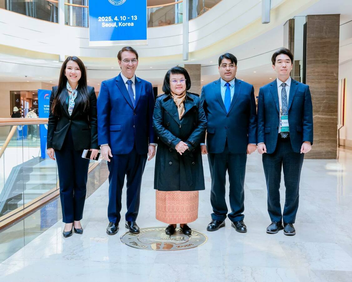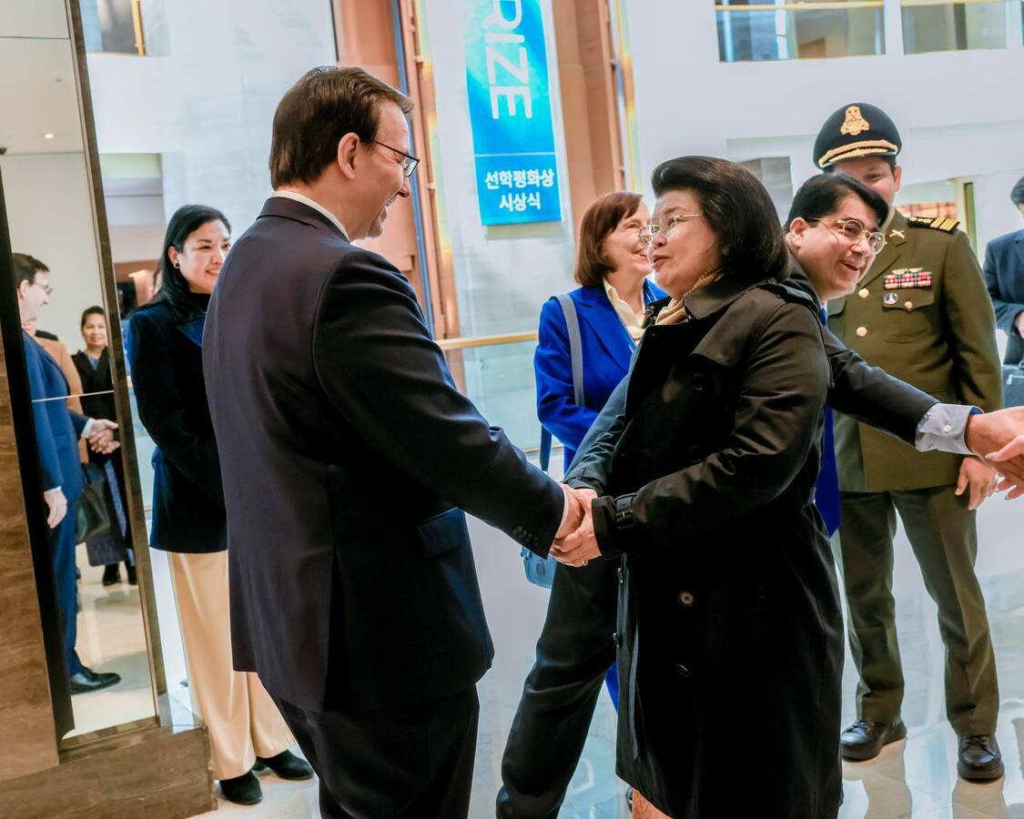 នៅអាកាសយានដ្ឋានអន្តរជាតិ អ៊ីឈុន នាទីក្រុងសេអ៊ូល គណៈប្រតិភូបានទទួលស្វាគមន៍យ៉ាងកក់ក្តៅ ពីថ្នាក់ដឹកនាំជាន់ខ្ពស់នៃស្ថាប័នរៀបចំកិច្ចប្រជុំកំពូលពិភពលោក២០២៥ និងមានវត្តមានលោកជំទាវ ជ្រឹង បុទុមរង្សី ឯកអគ្គរាជទូតកម្ពុជាប្រចាំសាធារណរដ្ឋកូរ៉េ និងសហការីជាច្រើនរូបទៀត។