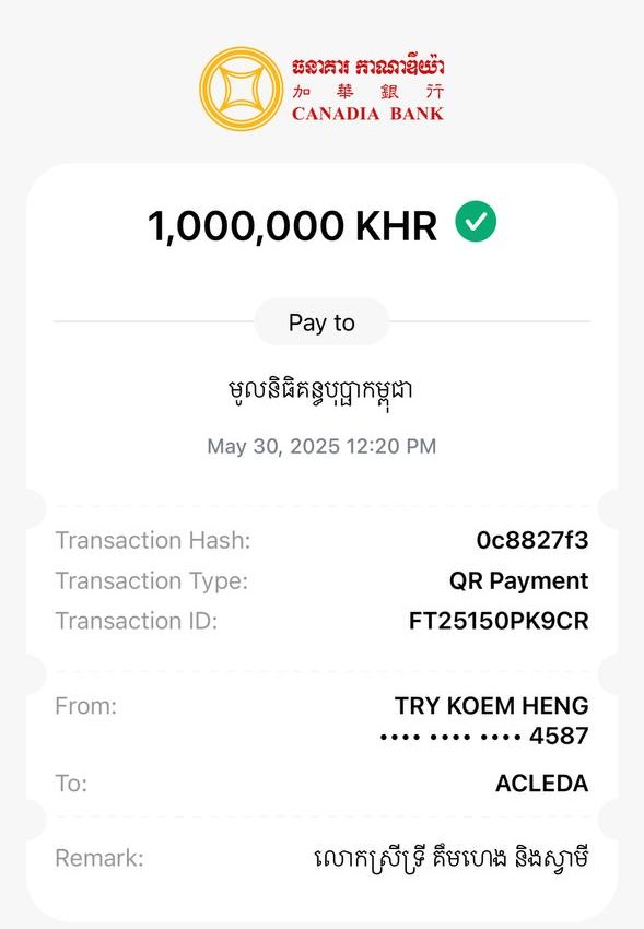 (ភ្នំពេញ)៖លោកស្រី ទ្រី គឹមហេង និងស្វាមីព្រមទាំងបុត្រ បានបរិច្ចាគថវិកា ១,០០០,០០០ លានរៀល ដើម្បីចូលរួមគាំទ្រយុទ្ធនាការ «១ម៉ឺនរៀល ១ម៉ឺននាក់»ឆ្នាំ២០២៥ របស់មូលនិធិគន្ធបុប្ផាកម្ពុជា ដែលផ្ដួចផ្ដើម និងដឹកនាំដោយលោកជំទាវបណ្ឌិត ពេជ ចន្ទមុន្នី ប្រធានកិត្តិយសនៃមូលនិធិគន្ធបុប្ផាកម្ពុជា។