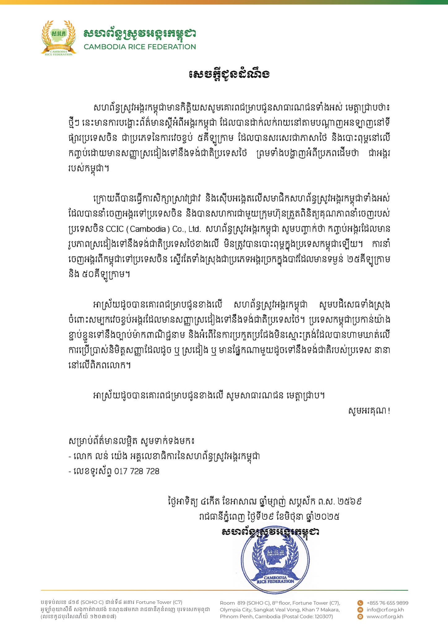 ភ្នំពេញ:សេចក្តីជូនដំណឹង សហព័ន្ធស្រូវអង្ករកម្ពុជាមានកិត្តិយសសូមគោរពជម្រាបជូនសាធារណជនទាំងអស់ មេត្តាជ្រាបថា៖ ថ្មីៗ នេះមានការបង្ហោះព័ត៌មានស្តីអំពីអង្ករកម្ពុជា ដែលបានដាក់លក់រាយនៅតាមបណ្តាញអនឡាញនៅទីផ្សារប្រទេសចិន ជាប្រភេទនៃការវេចខ្ចប់ ៥គីឡូក្រាម ដែលបានសរសេរជាភាសាថៃ និងបោះពុម្ពនៅលើកញ្ចប់ដោយមានសញ្ញាស្រដៀងទៅនឹងទង់ជាតិប្រទេសថៃ ព្រមទាំងបង្ហាញអំពីប្រភពដើមថា ជាអង្កររបស់កម្ពុជា។