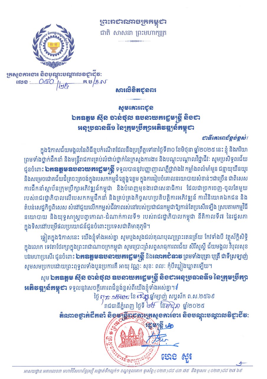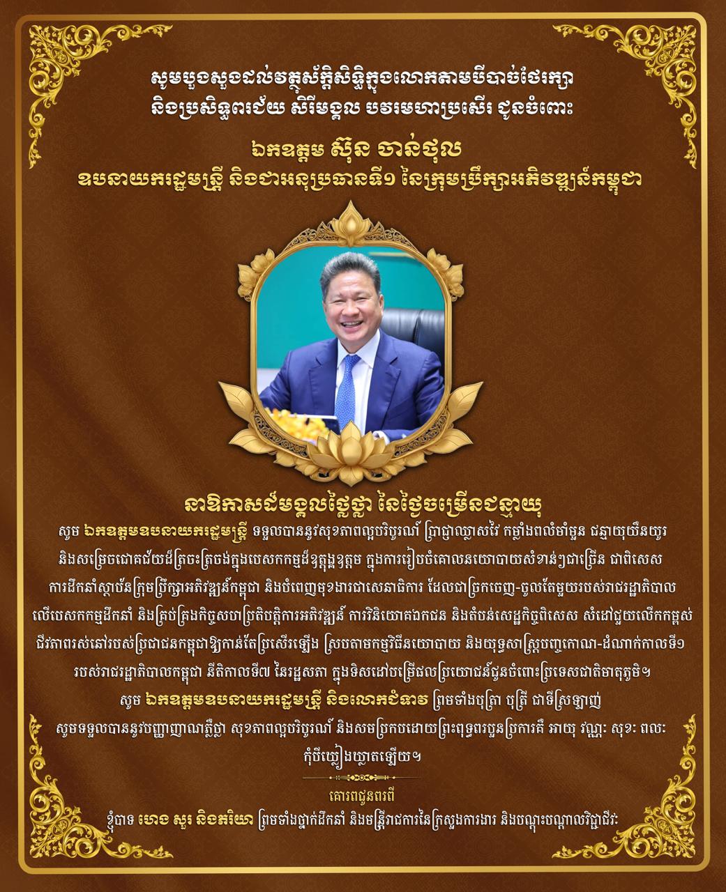 ឯកឧត្តម ហេង សួរ និងភរិយា ព្រមទាំងថ្នាក់ដឹកនាំ និង​មន្ត្រីរាជការ​គ្រប់​លំដាប់​ថ្នាក់​នៃ​ក្រសួងការងារ និងបណ្តុះបណ្តាលវិជ្ជាជីវៈ សូម​ប្រសិទ្ធ​ពរជ័យ​ជូន​ចំពោះ ឯកឧត្តម ស៊ុន ចាន់ថុល ឧបនាយករដ្ឋមន្ត្រី និង​ជា​អនុប្រធានទី១ នៃ​ក្រុម​ប្រឹក្សា​អភិវឌ្ឍន៍​កម្ពុជា ក្នុង​ឱកាស​ដ៏មង្គល​ថ្លៃថ្លា​នៃ​ថ្ងៃ​ចម្រើន​ជន្មាយុ​របស់​ឯកឧត្តម ដែល​ប្រព្រឹត្ត​ទៅ​នា​ថ្ងៃចន្ទ ទី៣០ ខែមិថុនា ឆ្នាំ២០២៥នេះ។
