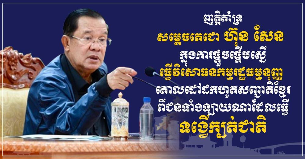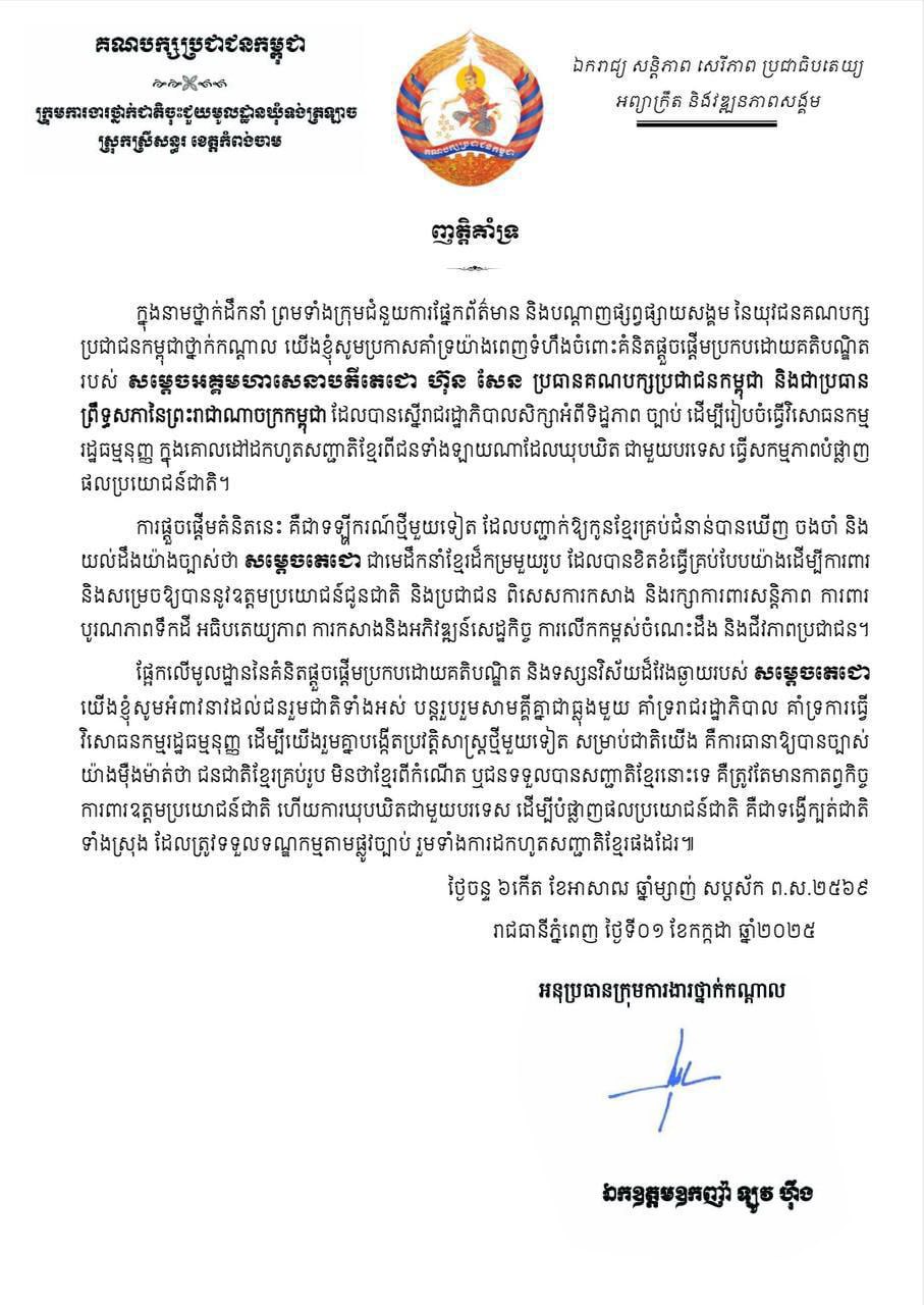យើងខ្ញុំ សូមប្រកាសគាំទ្រយ៉ាងពេញទំហឹងនូវការផ្តួចផ្តើមគំនិតរបស់ សម្តេចតេជោ ក្នុងការស្នើរាជរដ្ឋាភិបាល សិក្សាអំពីទិដ្ឋភាពច្បាប់ ដើម្បីរៀបចំធ្វើវិសោធនកម្មរដ្ឋធម្មនុញ្ញ ក្នុងគោលដៅដកហូតសញ្ជាតិខ្មែរពីជនទាំងឡាយណា ដែលឃុបឃិតជាមួយបរទេស ធ្វើសកម្មភាពបំផ្លាញផលប្រយោជន៍ជាតិ និងសូមអំពាវនាវដល់បងប្អូនប្រជាពលរដ្ឋគាំទ្រការធ្វើវិសោធនកម្មរដ្ឋធម្មនុញ្ញ៕