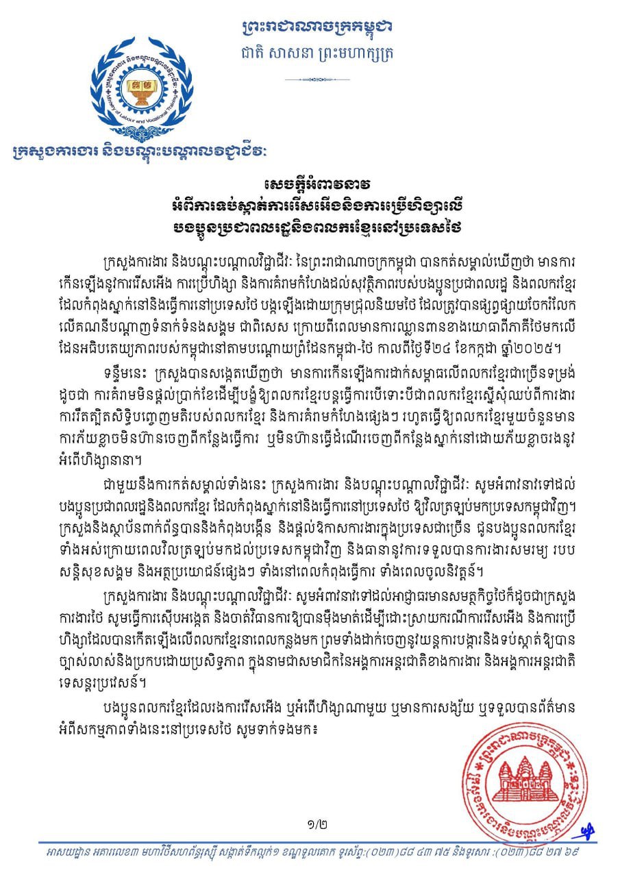 ក្នុងលិខិតចំហរដែលចុះហត្ថលេខាដោយ ឯកឧត្តម ហេង សួរ រដ្ឋមន្ត្រីក្រសួងការងារ និងបណ្តុះបណ្តាលវិជ្ជាជីវៈ បានឱ្យដឹងថា ចំពោះការកើនឡើងនៃករណីអំពើហឹង្សា និងការគំរាមកំហែងលើកម្មករចំណាកស្រុកនៅប្រទេសថៃ ដែលបានប្រព្រឹត្តឡើងថ្មីៗនេះដោយក្រុមជ្រុលនិយមថៃ សបញ្ជាក់តាមវីដេអូចាក់ផ្សាយអំពីហេតុការណ៍ច្រើនករណី អំពីការវាយប្រហារនិងធ្វើទុក្ខបុកម្និញបានចែករំលែកយ៉ាងទូលំទូលាយលើបណ្តាញសង្គម ដែល ជនរងគ្រោះភាគច្រើនគឺជាពលករខ្មែរ។