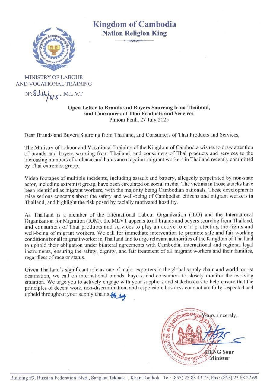 ក្រសួងការងារ និងបណ្តុះបណ្តាលវិជ្ជាជីវៈអំពាវនាវទៅម្ចាស់ម៉ាក អ្នកបញ្ជាទិញ និងអ្នកប្រើប្រាស់ផលិតផលថៃលើពិភពលោកការពារសិទ្ធិពលករខ្មែរខណៈកំណើននៃហិង្សាដែលប្រព្រឹត្តដោយក្រុមជ្រុលនិយមថៃ