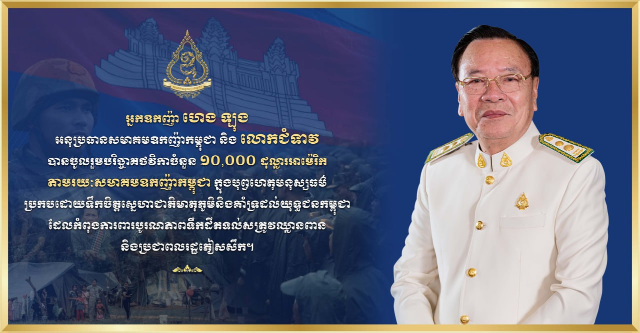 (ភ្នំពេញ)៖ តបតាមការអំពាវនាវរបស់ សម្តេចតេជោ ហ៊ុន សែន ប្រធានព្រឹទ្ធសភា, អ្នកឧកញ៉ា ហេង ឡុង អនុប្រធានសមាគមឧកញ៉ាកម្ពុជា និងលោកជំទាវ បានប្រកាសឧបត្ថម្ភថវិកា ១០,០០០ដុល្លារ (១មុឺនដុល្លារ) តាមរយៈសមាគមឧកញ៉ាកម្ពុជា ដល់កងទ័ពជួរមុខកម្ពុជា ដែលឈរជើងនៅបណ្តោយព្រំដែនកម្ពុជា-ថៃ។