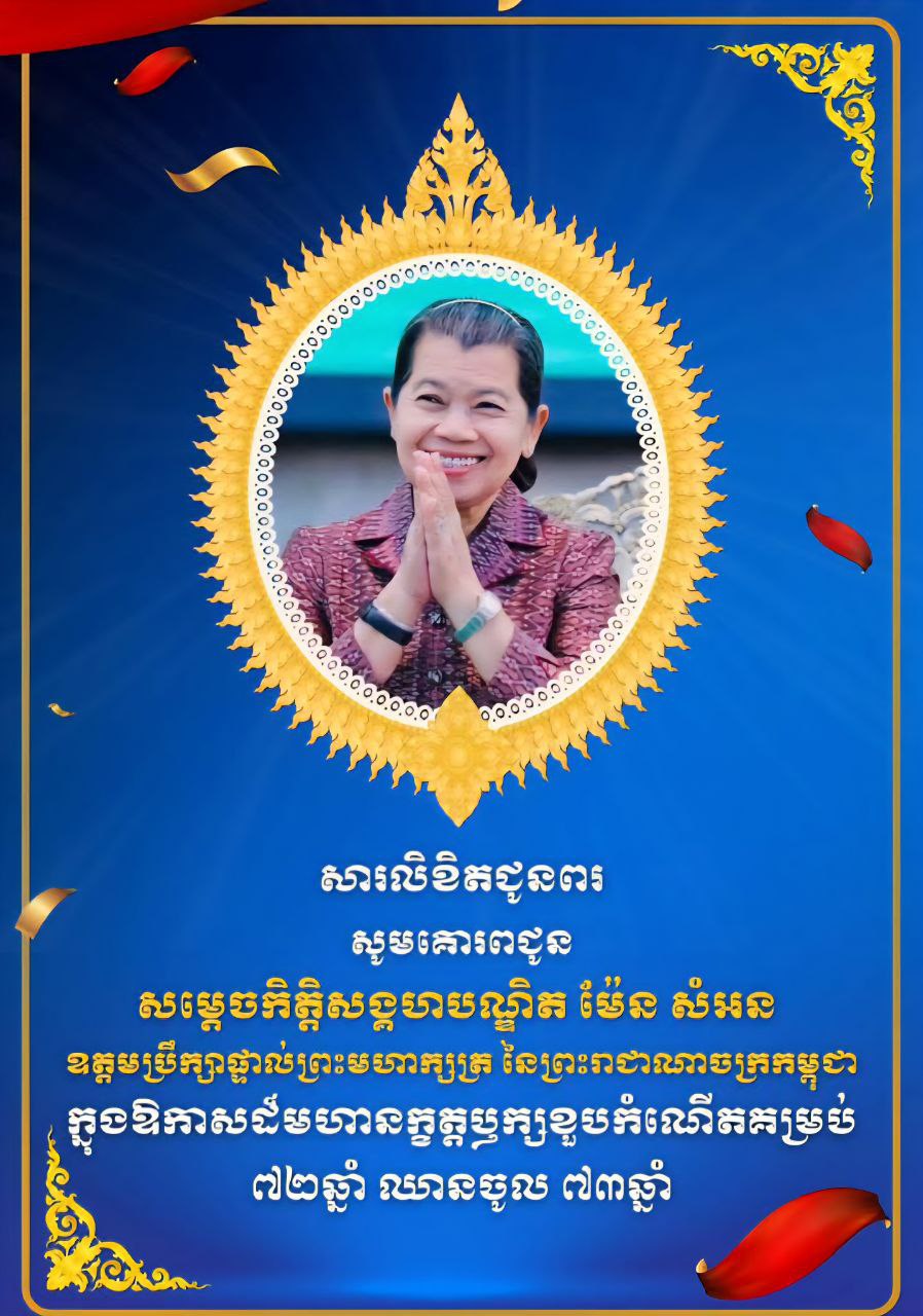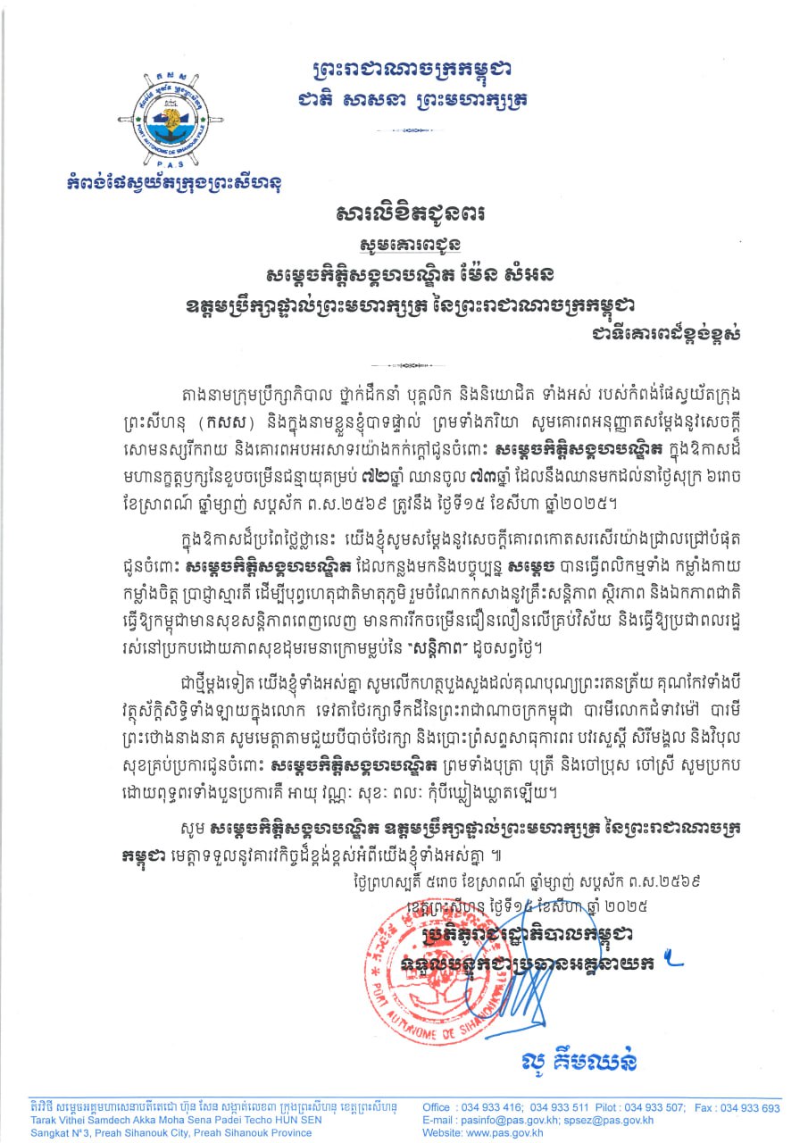 ក្រុងព្រះសីហនុ៖ តាងនាមក្រុមប្រឹក្សាភិបាល ថ្នាក់ដឹកនាំ បុគ្គលិក និងនិយោជិត ទាំងអស់ របស់កំពង់ផែស្វយ័តក្រុង ព្រះសីហនុ (កសស) និងក្នុងនាមខ្លួនខ្ញុំបាទផ្ទាល់ ព្រមទាំងភរិយា សូមគោរពអនុញ្ញាតសម្តែងនូវសេចក្តី សោមនស្សរីករាយ និងគោរពអបអរសាទរយ៉ាងកក់ក្តៅជូនចំពោះ សម្តេចកិត្តិសង្គហបណ្ឌិត ក្នុងឱកាសដ៏ មហានក្ខត្តឫក្សនៃខួបចម្រើនជន្មាយុគម្រប់ ៧២ឆ្នាំ ឈានចូល ៧៣ឆ្នាំ ដែលនឹងឈានមកដល់នាថ្ងៃសុក្រ ៦រោច ខែស្រាពណ៍ ឆ្នាំម្សាញ់ សប្តស័ក ព.ស.២៥៦៩ ត្រូវនឹង ថ្ងៃទី១៥ ខែសីហា ឆ្នាំ២០២៥។