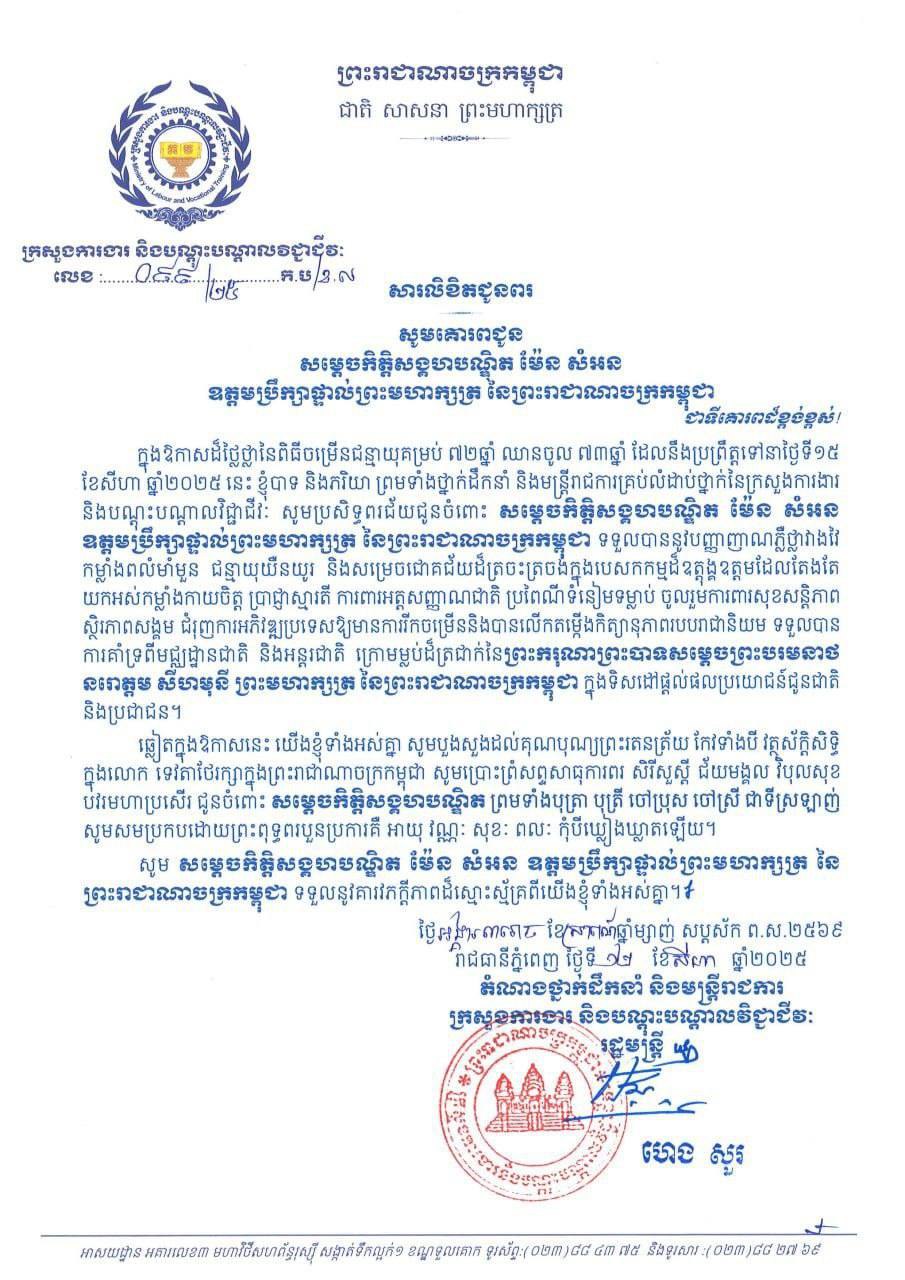 ភ្នំពេញ:ឯកឧត្តម ហេង សួរ និងភរិយា ព្រមទាំងថ្នាក់ដឹកនាំ និងមន្ត្រីរាជការគ្រប់លំដាប់ថ្នាក់នៃក្រសួងការងារ និងបណ្តុះបណ្តាលវិជ្ជាជីវៈ សូមប្រសិទ្ធពរជ័យ គោរពជូនចំពោះ សម្តេចកិត្តិសង្គហបណ្ឌិត ម៉ែន សំអន ឧត្តមប្រឹក្សាផ្ទាល់ព្រះមហាក្សត្រ នៃព្រះរាជាណាចក្រកម្ពុជា ក្នុងឱកាសដ៏មង្គលថ្លៃថ្លានៃថ្ងៃចម្រើនជន្មាយុរបស់ សម្ដេចកិត្តិសង្គហបណ្ឌិត ដែលប្រព្រឹត្តទៅនាថ្ងៃសុក្រ ទី១៥ ខែសីហា ឆ្នាំ២០២៥នេះ។