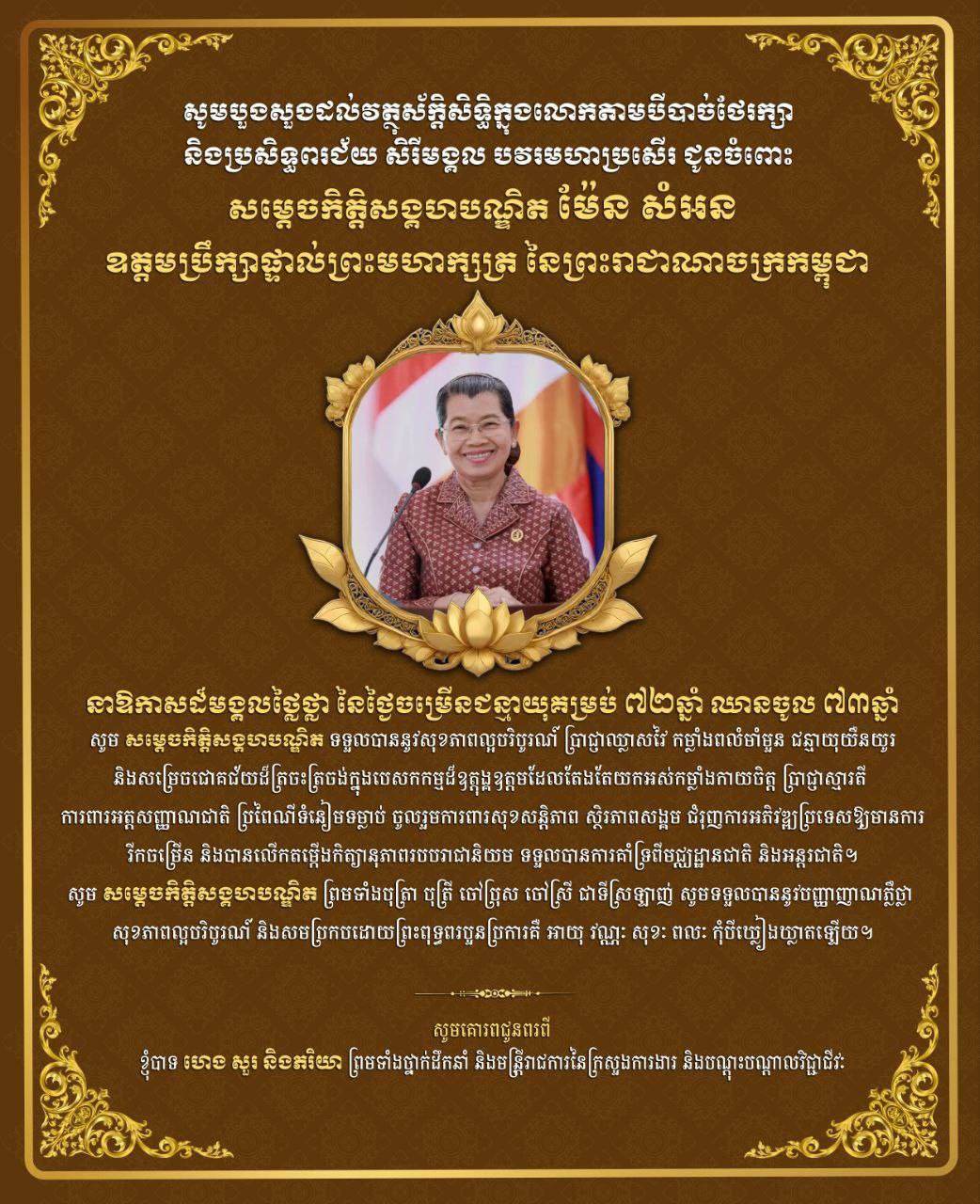 ឯកឧត្តម ហេង សួរ និងភរិយា សូមផ្ញើសារលិខិតគោរពជូនពរ សម្តេចកិត្តិសង្គហបណ្ឌិត ម៉ែន សំអន ឧត្តមប្រឹក្សាផ្ទាល់ព្រះមហាក្សត្រ នៃព្រះរាជាណាចក្រកម្ពុជា ក្នុងឱកាសដ៏មហានក្ខត្តឫក្សនៃខួបកំណើតគម្រប់ ៧២ឆ្នាំ ឈានចូល ៧៣ឆ្នាំ ដែលនឹងចូលមកដល់ នៅថ្ងៃទី១៥ ខែសីហា ឆ្នាំ២០២៥ នេះ ។