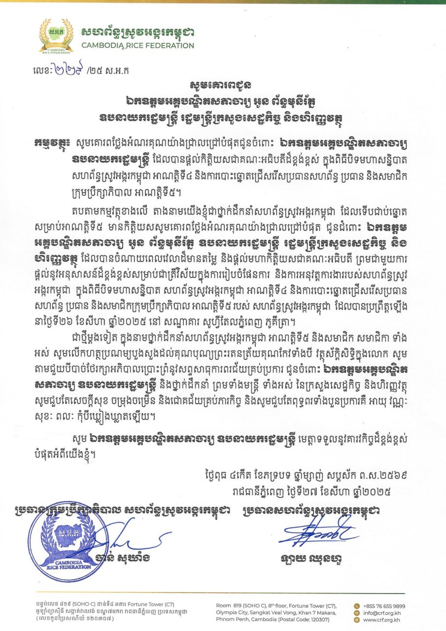 ភ្នំពេញ:ឧកញ៉ា ចាន់ សុឃាំង ប្រធានក្រុមប្រឹក្សាភិបាលសហព័ន្ធស្រូវអង្ករកម្ពុជាអាណត្តិទី៥ និងឧកញ៉ា ឡាយ ឈុនហួ ប្រធានសហព័ន្ធស្រូវអង្ករកម្ពុជាអាណត្តិទី៥ សូមថ្លែងអំណរគុណយ៉ាងជ្រាលជ្រៅបំផុតចំពោះ ឯកឧត្តមអគ្គបណ្ឌិតសភាចារ្យ អូន ព័ន្ធមុនីរ័ត្ន ឧបនាយករដ្ឋមន្រ្តី រដ្ឋមន្រ្តីក្រសួងសេដ្ឋកិច្ច និងហិរញ្ញវត្ថុ ដែលបានផ្ដល់កិត្តិយសជាគណៈធិបតីដ៏ខ្ពង់ខ្ពស់ ក្នុងពិធីបិទមហាសន្និបាតសហព័ន្ធស្រូវអង្ករកម្ពុជា អាណត្តិទី៤ និងការបោះឆ្នោតជ្រើសរើសប្រធានសហព័ន្ធ ប្រធាន និងសមាជិកក្រុមប្រឹក្សាភិបាលសហព័ន្ធស្រូវអង្ករកម្ពុជា អាណត្តិទី៥។ សូមគោរពជូនពរ ឯកឧត្តមអគ្គបណ្ឌិតសភាចារ្យ និងលោកជំទាវ សូមជួបតែពុទ្ធពរទាំងបួនប្រការ គឺអាយុ វណ្ណៈ សុខៈ ពលៈ កុំបីឃ្លៀងឃ្លាតឡើយ។