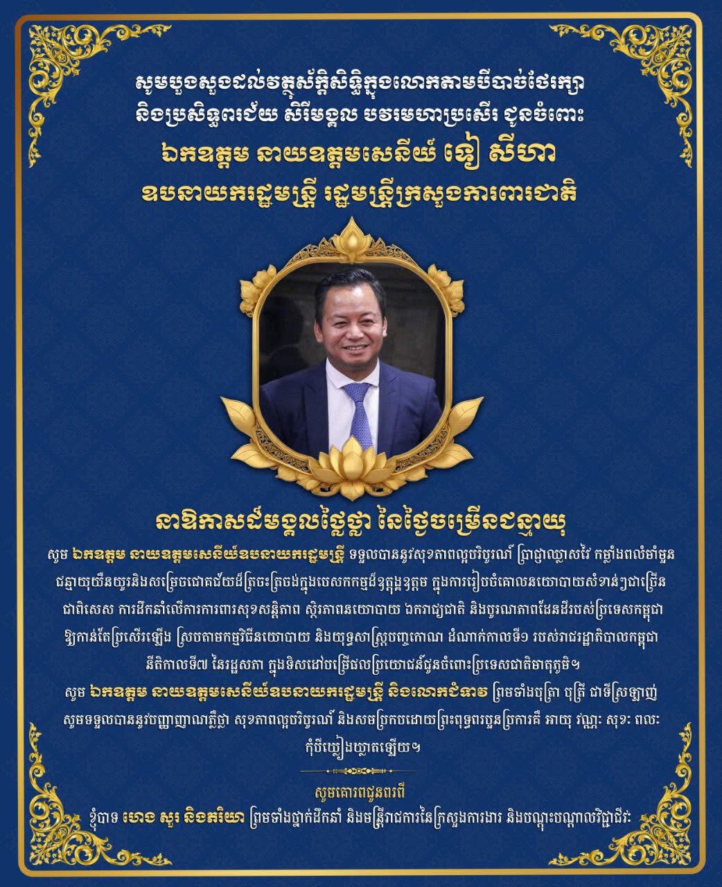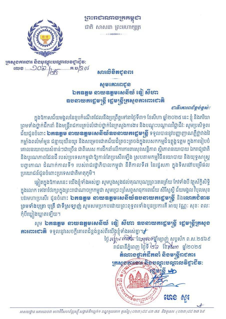 ភ្នំពេញ:ឯកឧត្តម ហេង សួរ និងភរិយា ព្រមទាំងថ្នាក់ដឹកនាំ និងមន្ត្រីរាជការគ្រប់លំដាប់ថ្នាក់នៃក្រសួងការងារ សូមប្រសិទ្ធពរជ័យគោរពជូនចំពោះ ឯកឧត្តម នាយឧត្តមសេនីយ៍ ទៀ សីហា ឧបនាយករដ្ឋមន្ត្រី រដ្ឋមន្ត្រីក្រសួងការពារជាតិ ក្នុងឱកាសជ័យមង្គលនៃខួបកំណើតរបស់ ឯកឧត្តម ដែលប្រព្រឹត្តទៅនាថ្ងៃទី៣១ ខែសីហា ឆ្នាំ២០២៥នេះបានផ្ញើសារលិខិតជូនពរ ឯកឧត្តម នាយឧត្តមសេនីយ៍ ទៀ សីហា ឧបនាយករដ្ឋមន្ត្រី រដ្ឋមន្ត្រីក្រសួងការពារជាតិ ក្នុងឱកាសថ្ងៃខួបកំណើតគម្រប់ ៤៤ឆ្នាំ ឈានចូល ៤៥ឆ្នាំ នាថ្ងៃសៅរ៍ ៧កើត ខែភទ្របទ ឆ្នាំម្សាញ់ សប្តស័ក ពុទ្ធសករាជ ២៥៦៩ ត្រូវនឹងថ្ងៃទី៣០ ខែសីហា ឆ្នាំ២០២៥។
