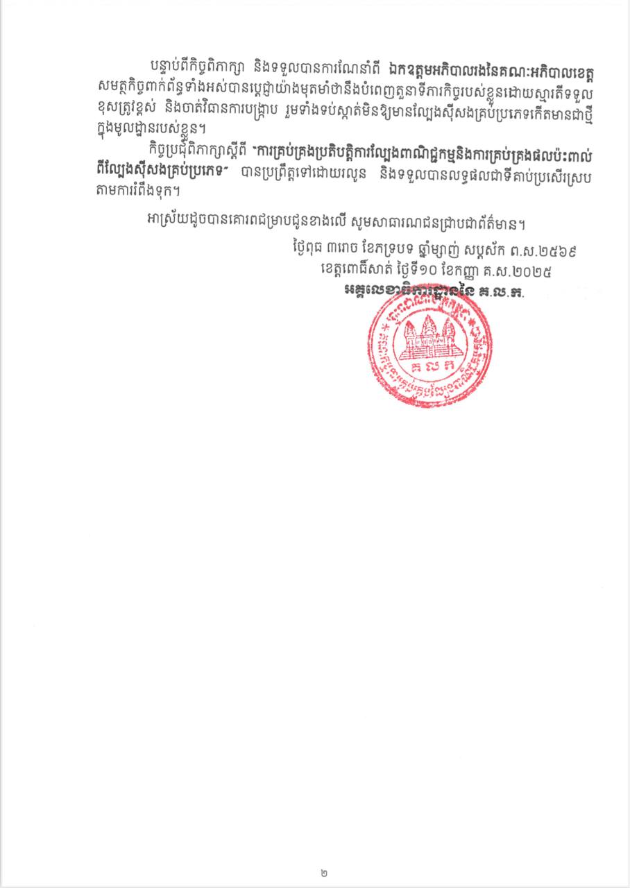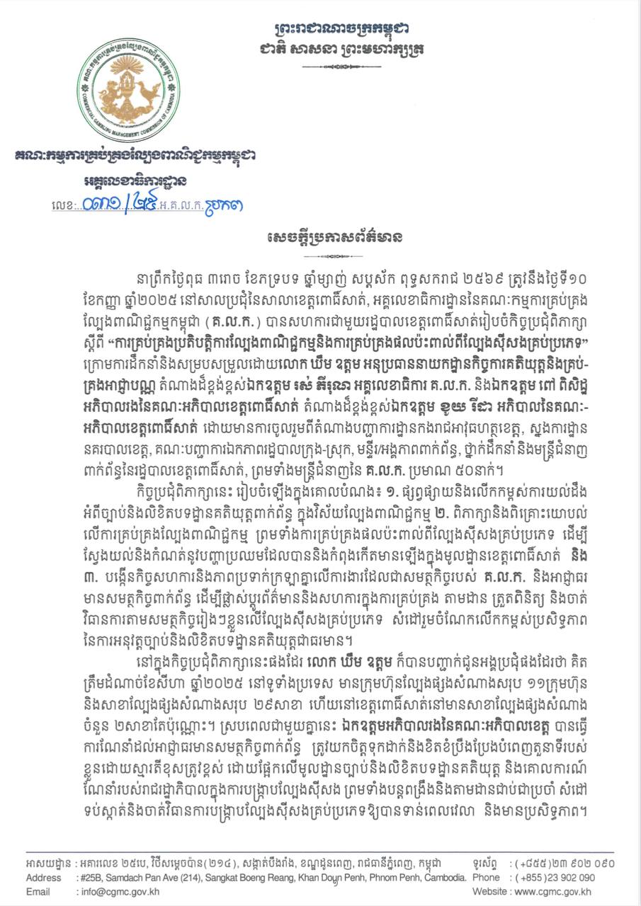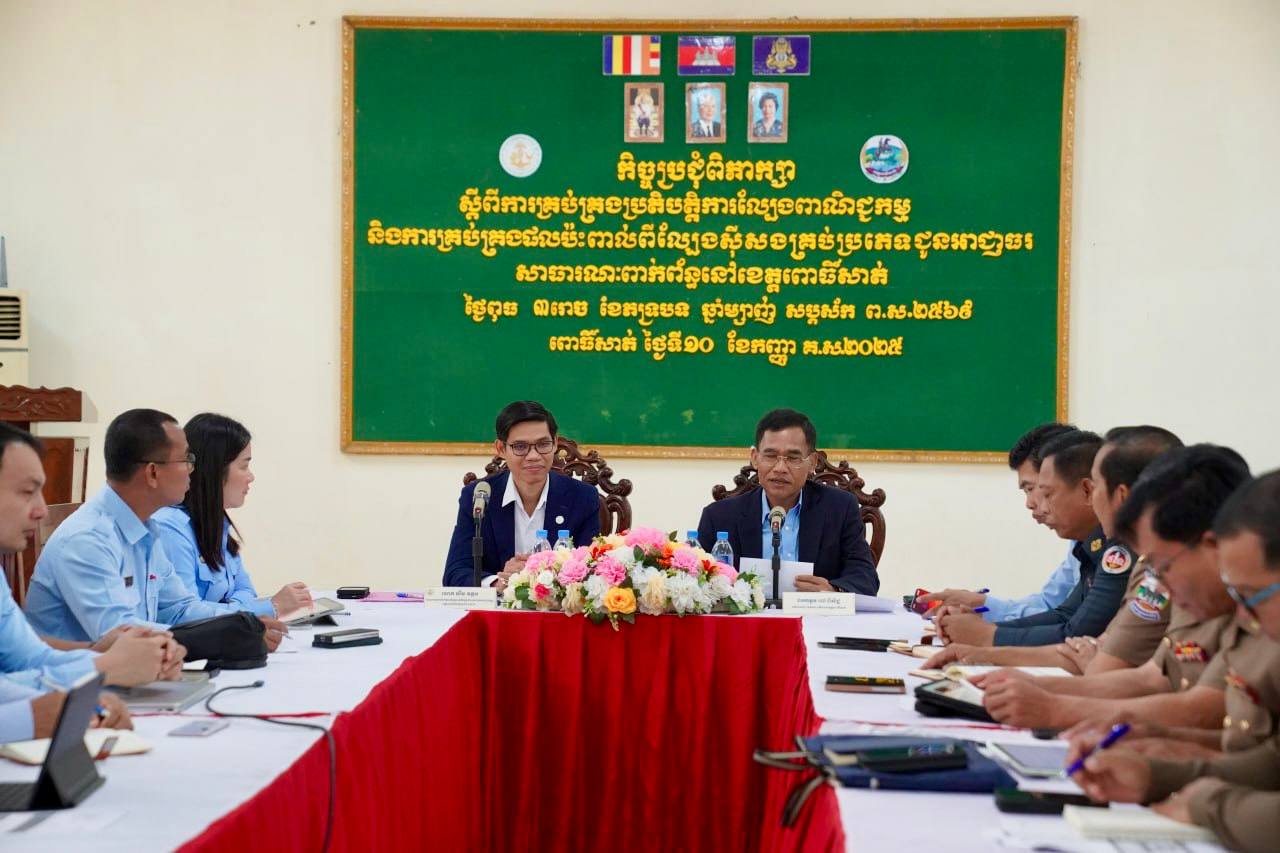 ពោធិសាត់:អគ្គលេខាធិការដ្ឋាននៃ គណៈកម្មការគ្រប់គ្រងល្បែងពាណិជ្ជកម្មកម្ពុជា(គ.ល.ក.)កាលពីព្រឹកថ្ងៃពុធទី១០ខែកញ្ញាឆ្នាំ២០២៥នេះ សហការជាមួយរដ្ឋបាលខេត្តពោធិ៍សាត់បានរៀបចំកិច្ចប្រជុំពិភាក្សាស្តីពី “ការគ្រប់គ្រងប្រតិបត្តិការល្បែងពាណិជ្ជកម្ម និងការគ្រប់គ្រងផលប៉ះពាល់ពីល្បែងស៊ីសងគ្រប់ប្រភេទ”។