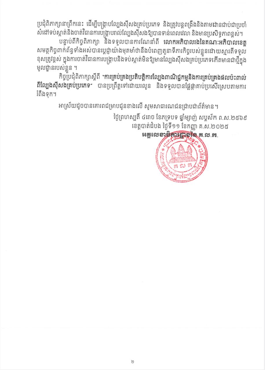 ខេត្តបាត់ដំបង: អគ្គលេខាធិការដ្ឋាននៃ គណៈកម្មការគ្រប់គ្រងល្បែងពាណិជ្ជកម្មកម្ពុជា(គ.ល.ក.) នៅព្រឹកថ្ងៃព្រហស្បតិ៍ទី១១ ខែកញ្ញាឆ្នាំ២០២៥នេះបានសហការជាមួយរដ្ឋបាលខេត្តបាត់ដំបង រៀបចំកិច្ចប្រជុំពិភាក្សាស្តីពី “ការគ្រប់គ្រងប្រតិបត្តិការល្បែងពាណិជ្ជកម្ម និងការគ្រប់គ្រងផលប៉ះពាល់ពីល្បែងស៊ីសងគ្រប់ប្រភេទ”។