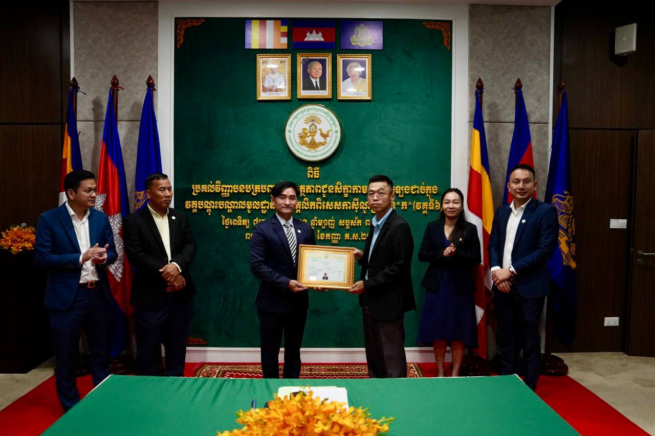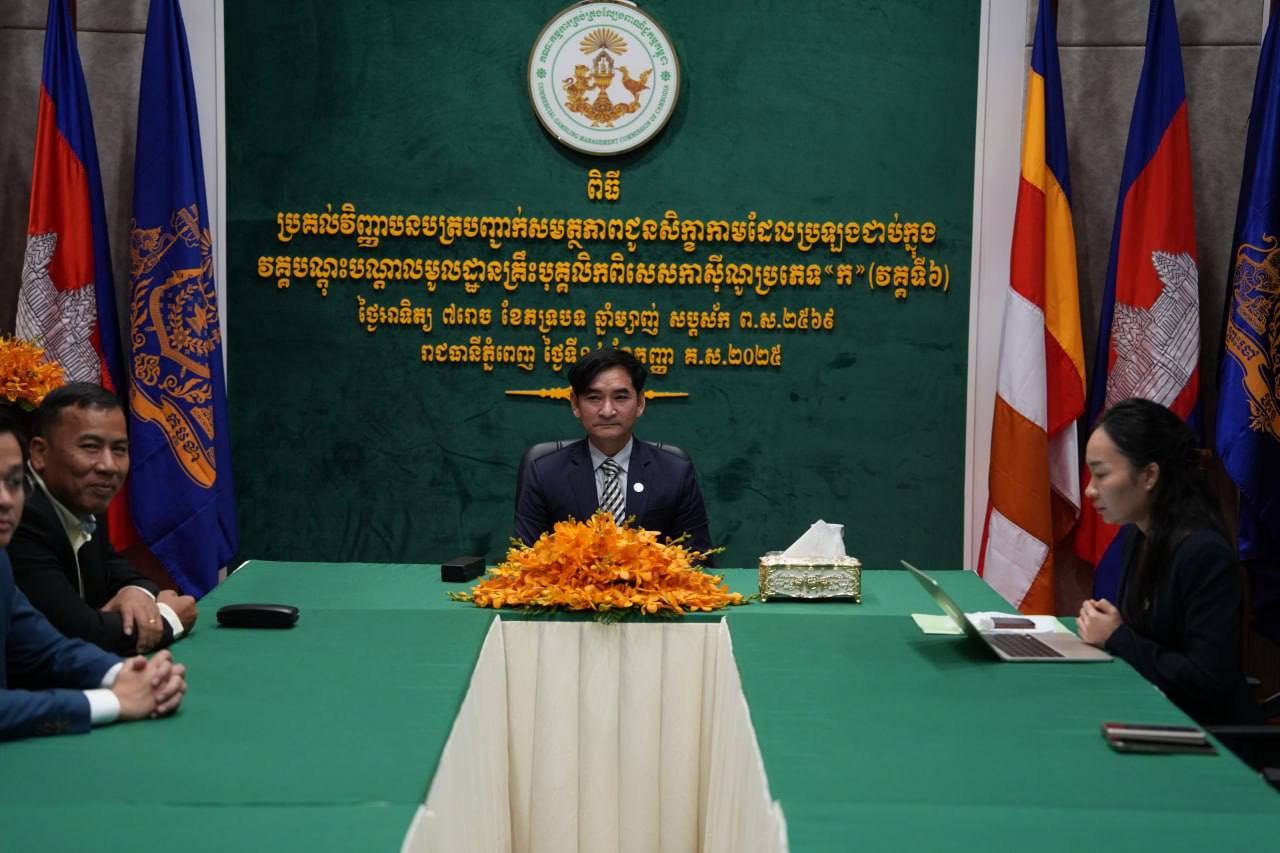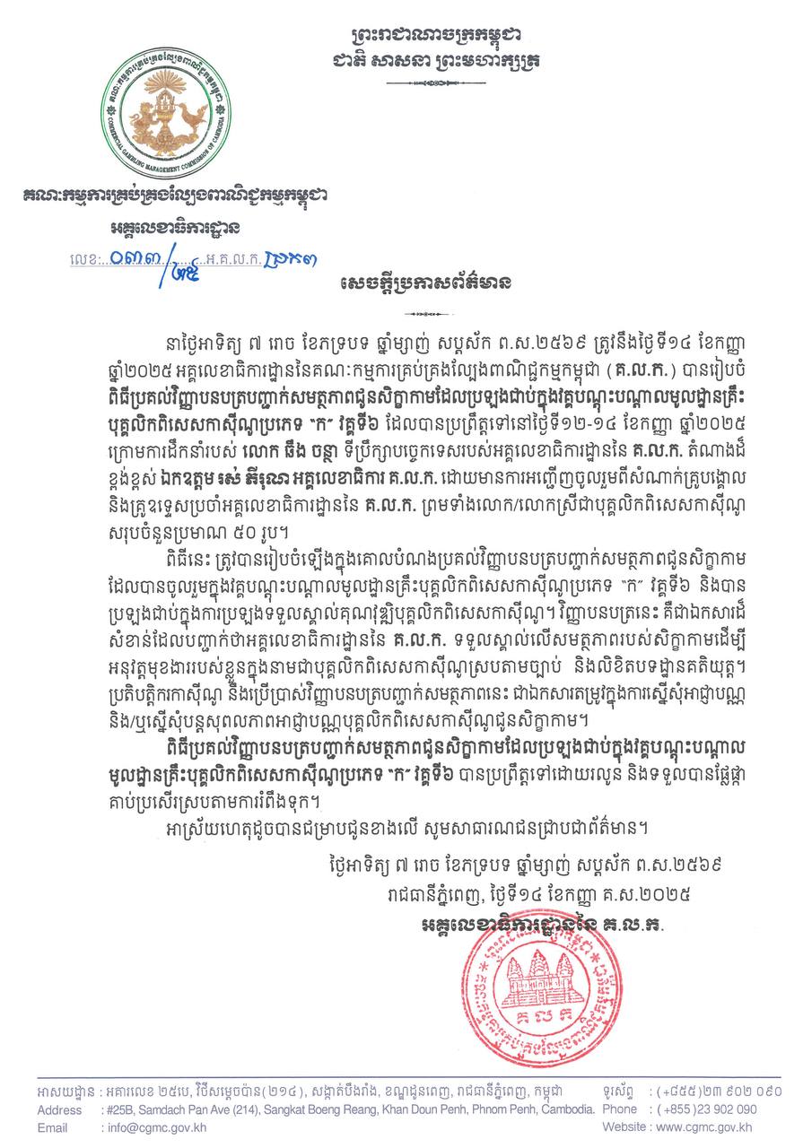 ភ្នំពេញ: អគ្គលេខាធិការដ្ឋាននៃគណៈកម្មការគ្រប់គ្រងល្បែងពាណិជ្ជកម្មកម្ពុជា (គ.ល.ក.)នៅថ្ងៃទី១៤ ខែកញ្ញា ឆ្នាំ២០២៥នេះបានរៀបចំ ពិធីប្រគល់វិញ្ញាបនបត្របញ្ជាក់សមត្ថភាពជូនសិក្ខាកាមដែលប្រឡងជាប់ក្នុងវគ្គបណ្តុះបណ្តាលមូលដ្ឋានគ្រឹះបុគ្គលិកពិសេសកាស៊ីណូប្រភេទ “ក” វគ្គទី៦ ដែលបានប្រព្រឹត្ដទៅនៅថ្ងៃទី១២-១៤ ខែកញ្ញា ឆ្នាំ២០២៥។