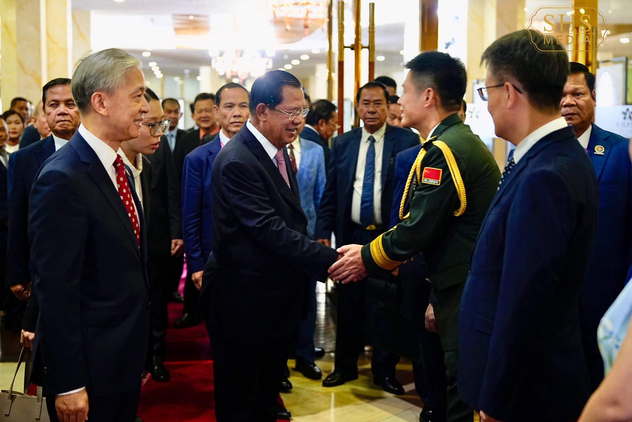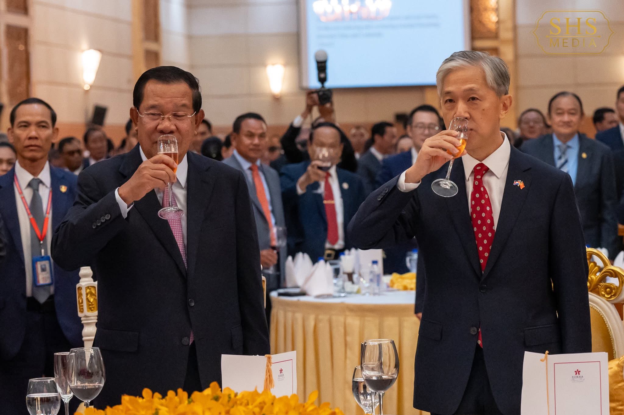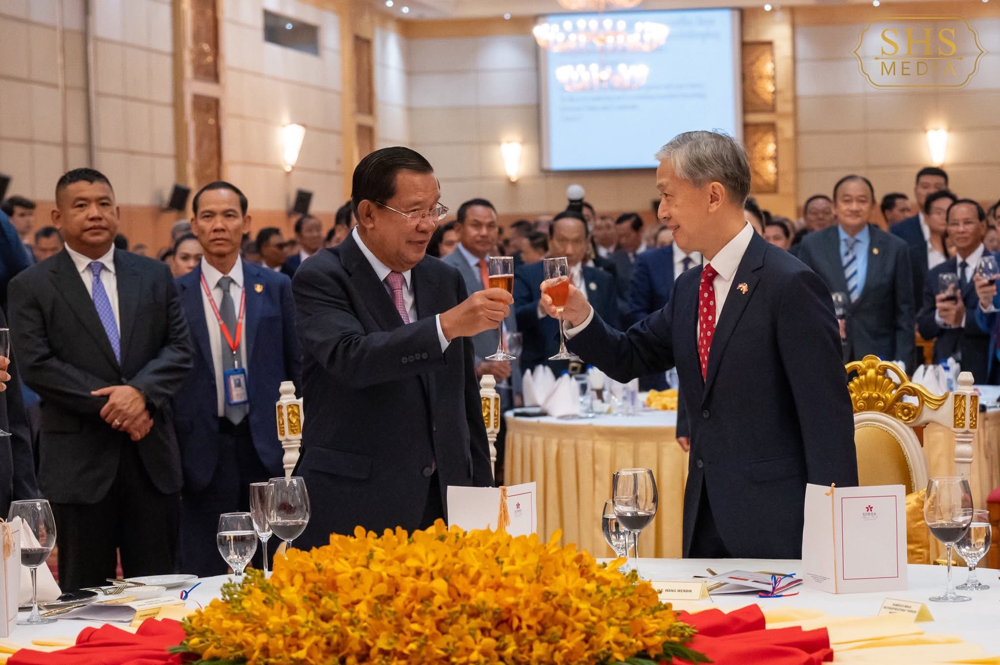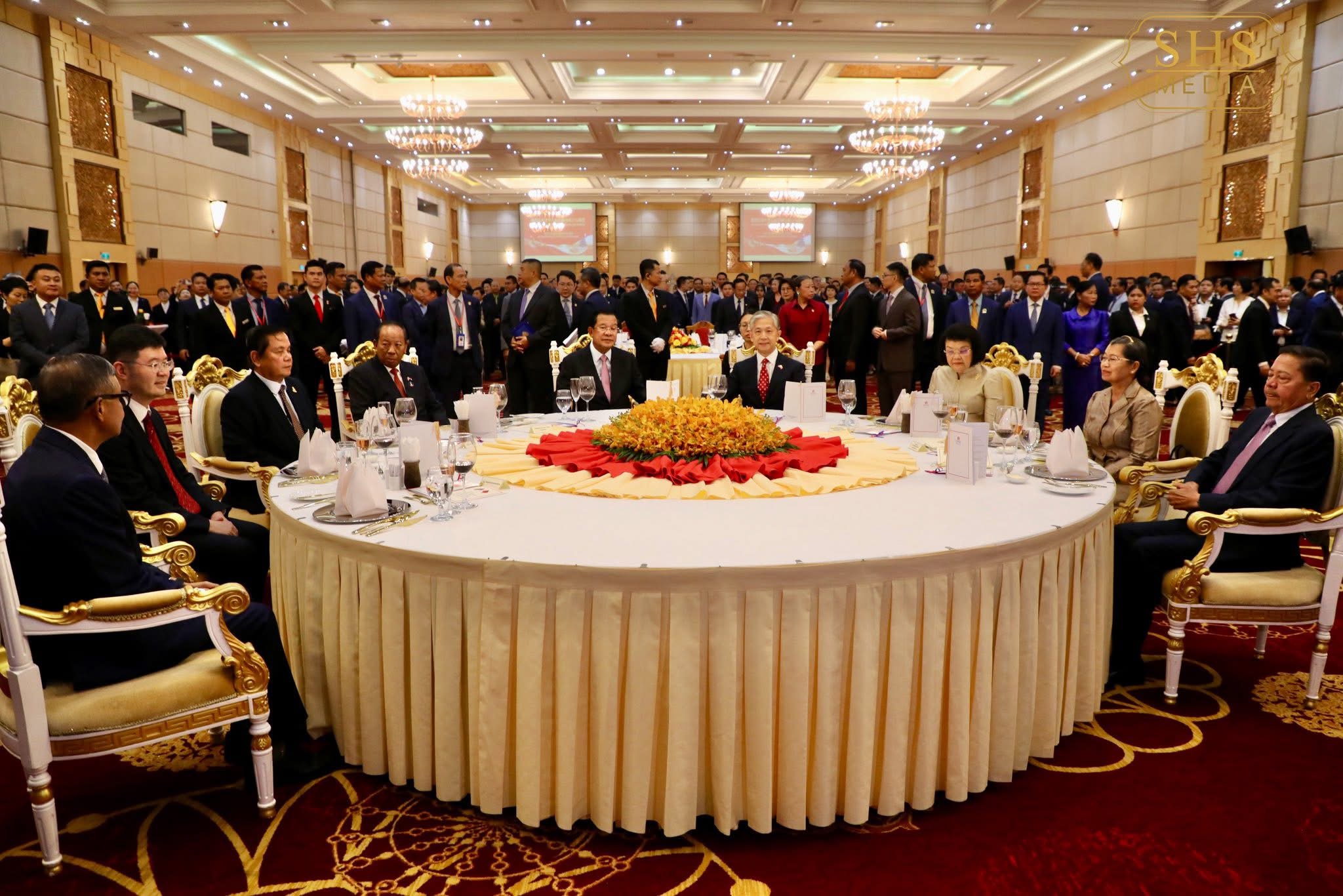 ភ្នំពេញ:នៅល្ងាចថ្ងៃសុក្រទី២៦ ខែកញ្ញា ឆ្នាំ២០២៥ សម្ដេចអគ្គមហាសេនាបតីតេជោ ហ៊ុន សែន ប្រមុខរដ្ឋស្ដីទីនៃព្រះរាជាណាចក្រកម្ពុជា បានអញ្ជើញចូលរួមក្នុងពិធីជប់លៀងអបអរសាទរខួប៧៦ នៃការបង្កើតសាធារណរដ្ឋប្រជាមានិតចិន ដែលពិធីនេះប្រារព្ធធ្វើឡើងនៅសណ្ឋាគារសុខាភ្នំពេញ។ ពិធីនេះមានការអញ្ជើញចូលរួមពីឯកឧត្តម វ៉ាង វិនពីន ឯកអគ្គរដ្ឋទូតវិសាមញ្ញ និងពេញសមត្ថភាព នៃសាធារណរដ្ឋប្រជាមានិតចិន ប្រចាំកម្ពុជា, សមាជិកព្រឹទ្ធសភា រដ្ឋសភា និងរាជរដ្ឋាភិបាល, តំណាងអង្គទូត នៃប្រទេសជាមិត្តប្រចាំកម្ពុជា ព្រមទាំងភ្ញៀវកិត្តិយសជាតិ និងអន្តរជាតិជាច្រើនរូបទៀត។