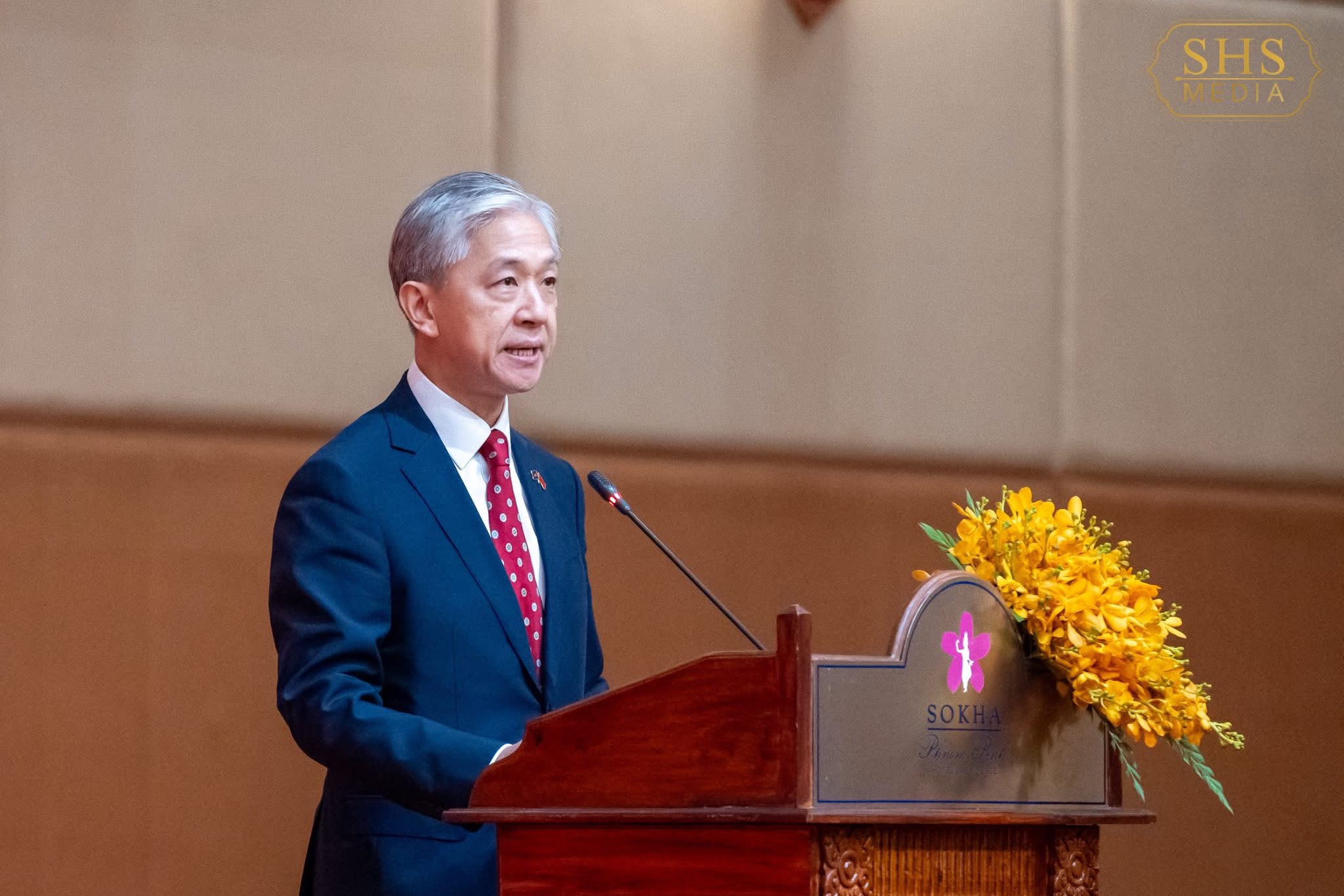 ឯកឧត្តម វ៉ាង វិនពីន បានសម្ដែងការ ស្វាគមន៍យ៉ាងកក់ក្តៅជូនចំពោះ សម្តេចតេជោ ហ៊ុន សែន ប្រមុខរដ្ឋស្ដី ទីនៃព្រះរាជាណាចក្រកម្ពុជា និងភ្ញៀវកិត្តិយសទាំងឡាយ ដែលបានអញ្ជើញចូលរួមក្នុងពិធីនាថ្ងៃនេះ និងសូមជូនពរចំពោះបងប្អូនជនរួមជាតិ និងបងប្អូនពលរដ្ឋខ្មែរជាប់សែស្រឡាយចិន ដែលកំពុងបម្រើការងារ និងរស់នៅក្នុងប្រទេសកម្ពុជា។ ឯកឧត្តមបន្តថា ឆ្នាំនេះជាឆ្នាំសំខាន់មួយសម្រាប់ដំណើរការអភិវឌ្ឍន៍ប្រជាជនចិន និងមនុស្សជាតិ ដើម្បីលើកកម្ពស់ប្រព័ន្ធអភិបាលកិច្ចសកលឱ្យកាន់តែល្អហើយរួមគ្នាឆ្ពោះទៅរកសហគមន៍ជោគវាសនារួមសម្រាប់ឆ្នាំនេះក៏ជាឆ្នាំសំខាន់មួយក្នុងប្រវត្តិសាស្ត្រទំនាក់ទំនងចិននិងកម្ពុជា។