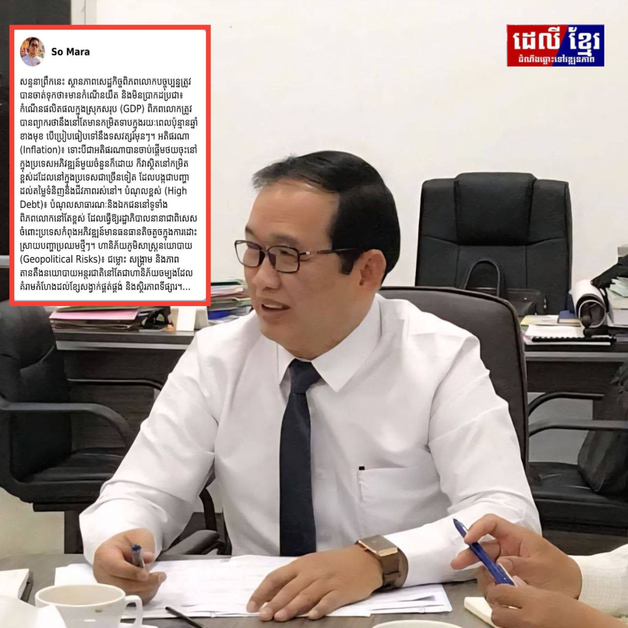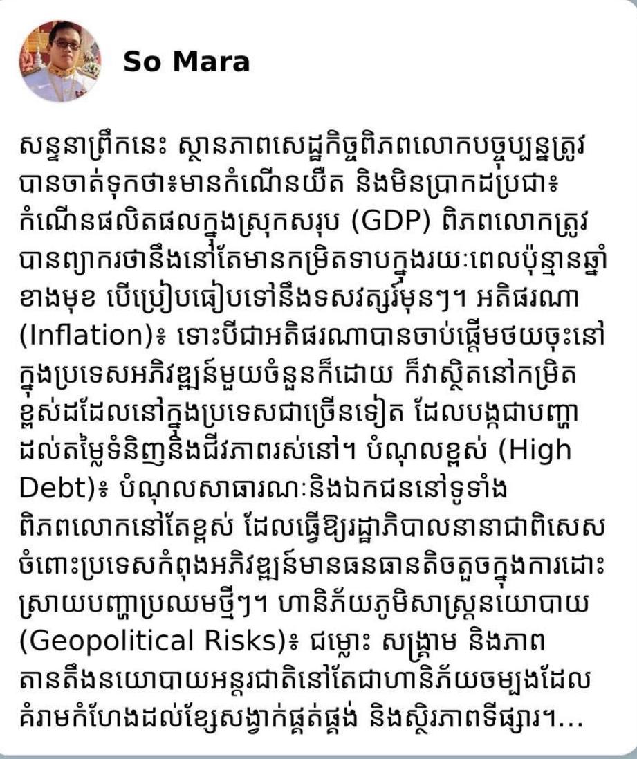 ភ្នំពេញ៖ ឯកឧត្តម សូ ម៉ារ៉ា រដ្ឋមន្ត្រីប្រតិភូអមនាយករដ្ឋមន្ត្រីបានមានប្រសាសន៍លើបណ្តាញហ្វេសប៊ុកផ្លូវការនៅថ្ងៃទី៧ខែតុលាឆ្នាំ២០២៥នេះ ស្តីពីស្ថានភាពសេដ្ឋកិច្ចពិភពលោកបច្ចុប្បន្នត្រូវបានចាត់ទុកថា៖មានកំណើនយឺត និងមិនប្រាកដប្រជា៖ កំណើនផលិតផលក្នុងស្រុកសរុប (GDP) ពិភពលោកត្រូវបានព្យាករថា នឹងនៅតែមានកម្រិតទាបក្នុងរយៈពេលប៉ុន្មានឆ្នាំខាងមុខ បើប្រៀបធៀបទៅនឹងទសវត្សរ៍មុនៗ។