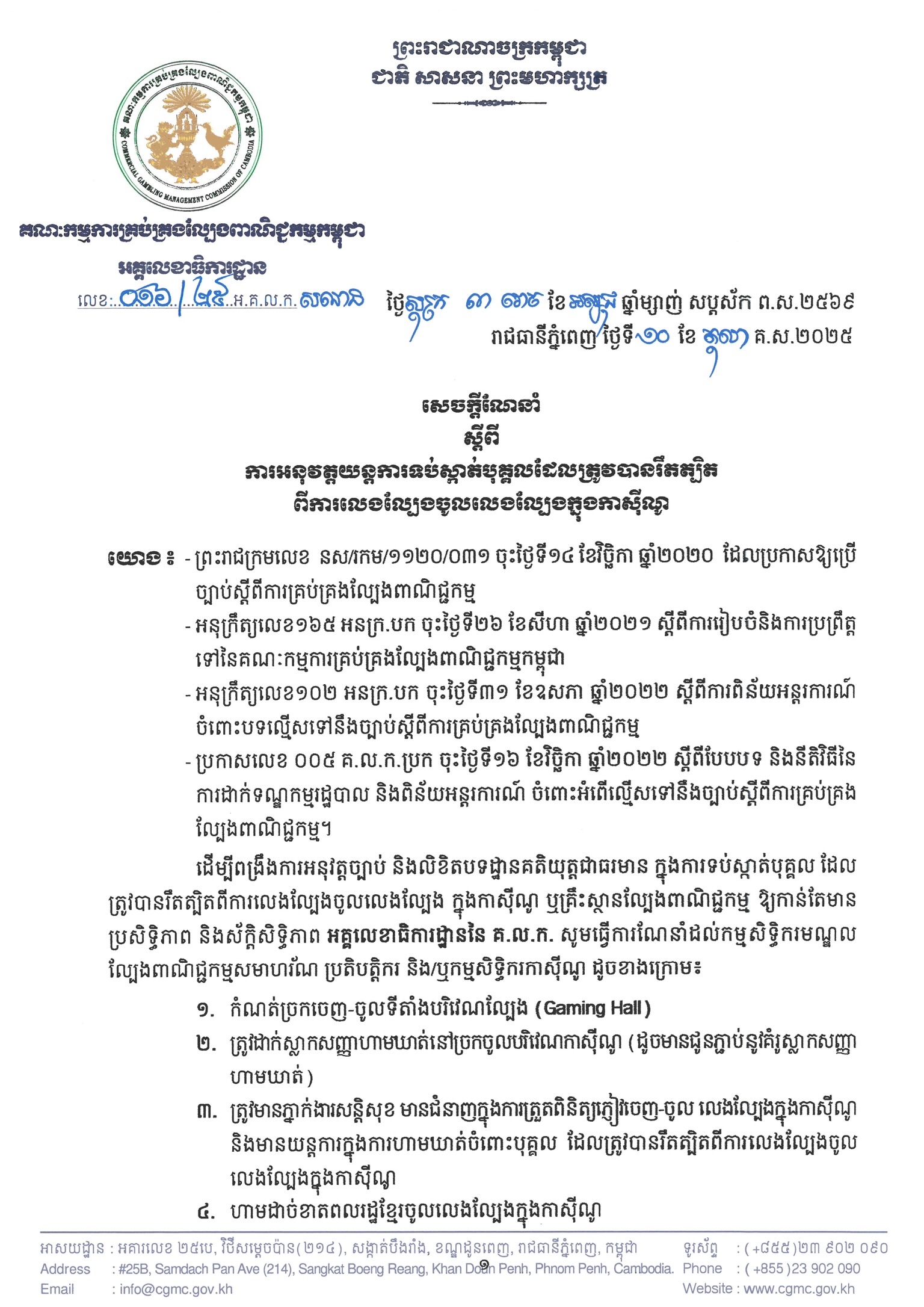 ស្តីពីការអនុវត្តយន្តការទប់ស្កាត់បុគ្គលដែលត្រូវបានរឹតត្បិត ពីការលេងល្បែងចូលលេងល្បែងក្នុងកាស៊ីណូ។