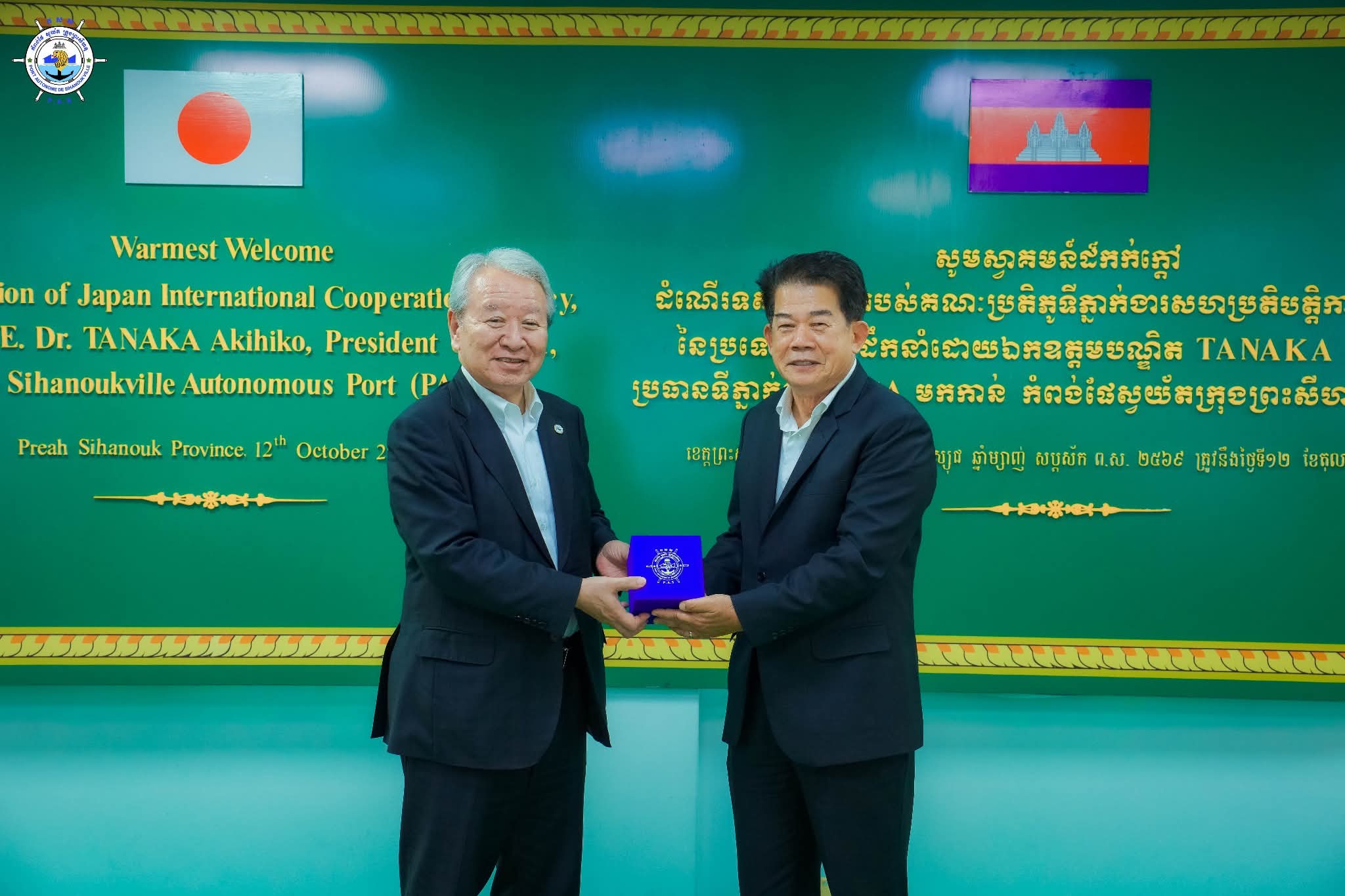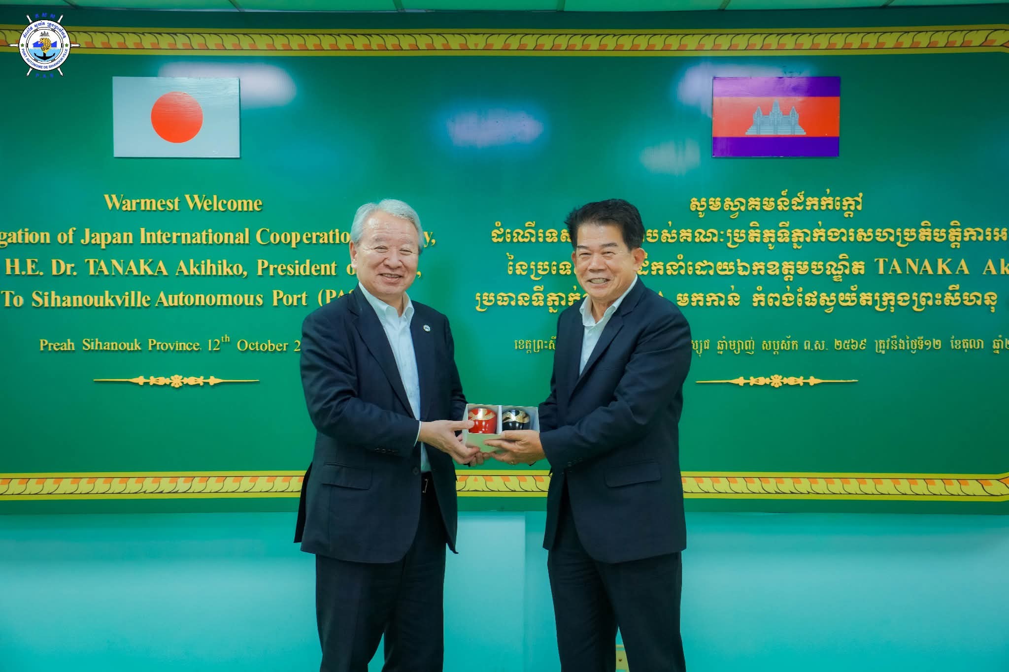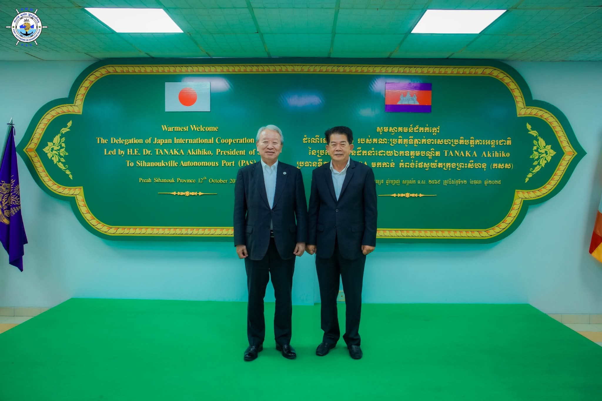 កំពង់ផែស្វយ័តក្រុងព្រះសីហនុ (កសស) ៖ នាថ្ងៃអាទិត្យ ទី១២ ខែតុលា ឆ្នាំ២០២៥ ឯកឧត្តម លូ គឹមឈន់ ប្រតិភូរាជរដ្ឋាភិបាលកម្ពុជា ទទួលបន្ទុកជាប្រធានអគ្គនាយក កំពង់ផែស្វយ័តក្រុងព្រះសីហនុ និងថ្នាក់ដឹកនាំ កសស បានទទួលស្វាគមន៍ ដំណើរទស្សនកិច្ចគណៈប្រតិភូទីភ្នាក់ងារសហប្រតិបត្តិការអន្តរជាតិ នៃប្រទេសជប៉ុន (JICA) ដឹកនាំដោយ ឯកឧត្តមបណ្ឌិត TANAKA Akihiko ប្រធានទីភ្នាក់ងារសហប្រតិបត្តិការអន្តរជាតិ នៃប្រទេសជប៉ុន (JICA) ក្នុងគោលបំណងស្វែងយល់ពី លំហូរប្រតិបត្តិការ សក្តានុពល វឌ្ឍនភាព និងការអភិវឌ្ឍរបស់ កសស។