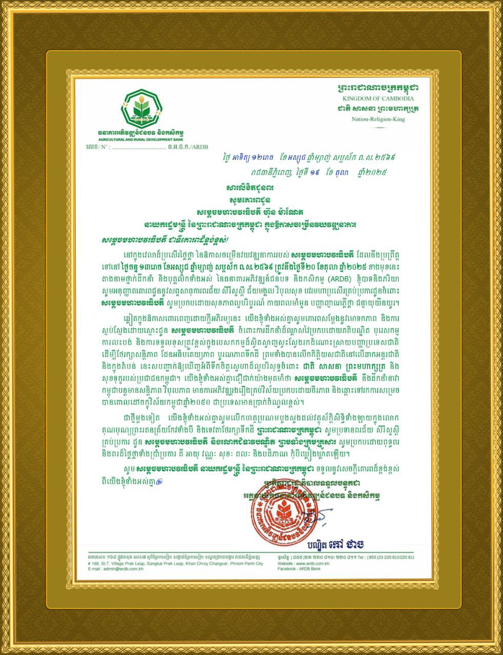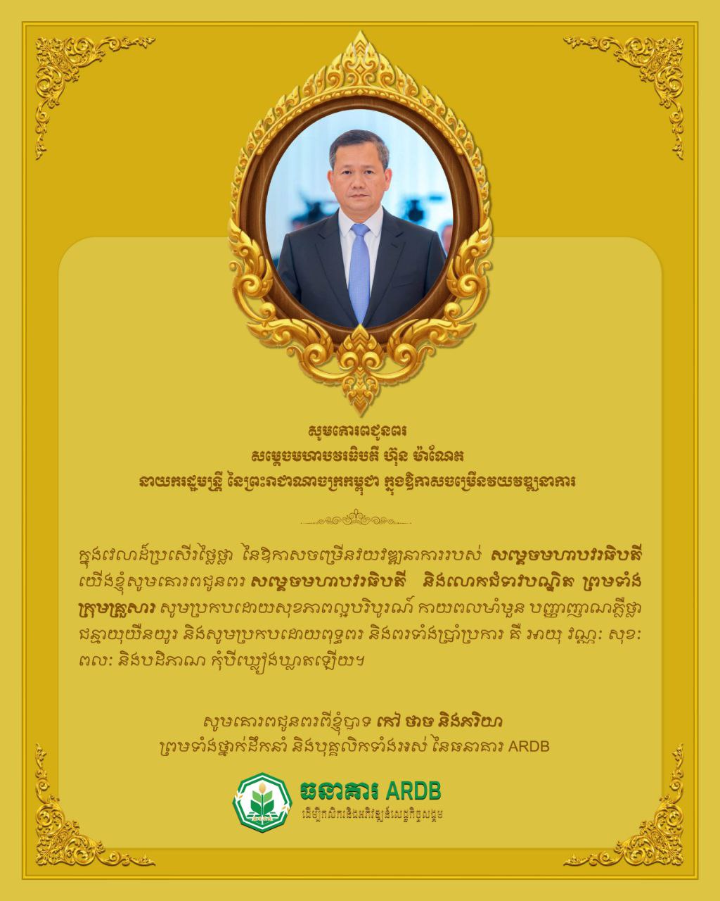 (ភ្នំពេញ)៖ ក្នុងឱកាសដ៏មង្គលសួស្តី នៃថ្ងៃខួបកំណើត សម្តេចមហាបវរធិបតី ហ៊ុន ម៉ាណែត នាយករដ្ឋមន្រ្តីនៃព្រះរាជាណាចក្រកម្ពុជា គម្រប់ ៤៨ឆ្នាំ ឈានចូល ៤៩ឆ្នាំ នាថ្ងៃទី២០ ខែតុលា ឆ្នាំ២០២៥, ឯកឧត្តមបណ្ឌិត កៅ ថាច ប្រតិភូរាជរដ្ឋាភិបាល ទទួលបន្ទុកជាអគ្គនាយកធនាគារអភិវឌ្ឍន៍ជនបទនិងកសិកម្ម ព្រមទាំងថ្នាក់ដឹកនាំនិងបុគ្គលិក សូមផ្ញើសារលិខិតគោរពជូនពរ សម្តេចមហាបវរធិបតី ទទួលបានសុខភាពល្អបរិបូរណ៍ បញ្ញាញាណភ្លឺថ្លា អាយុយឺនយូរ ដើម្បីបន្តបេសកកម្មដ៏ឧត្តុង្គឧត្តម ដើម្បីដឹកនាំកម្ពុជាឱ្យរីកចម្រើនរុងរឿងតទៅ។