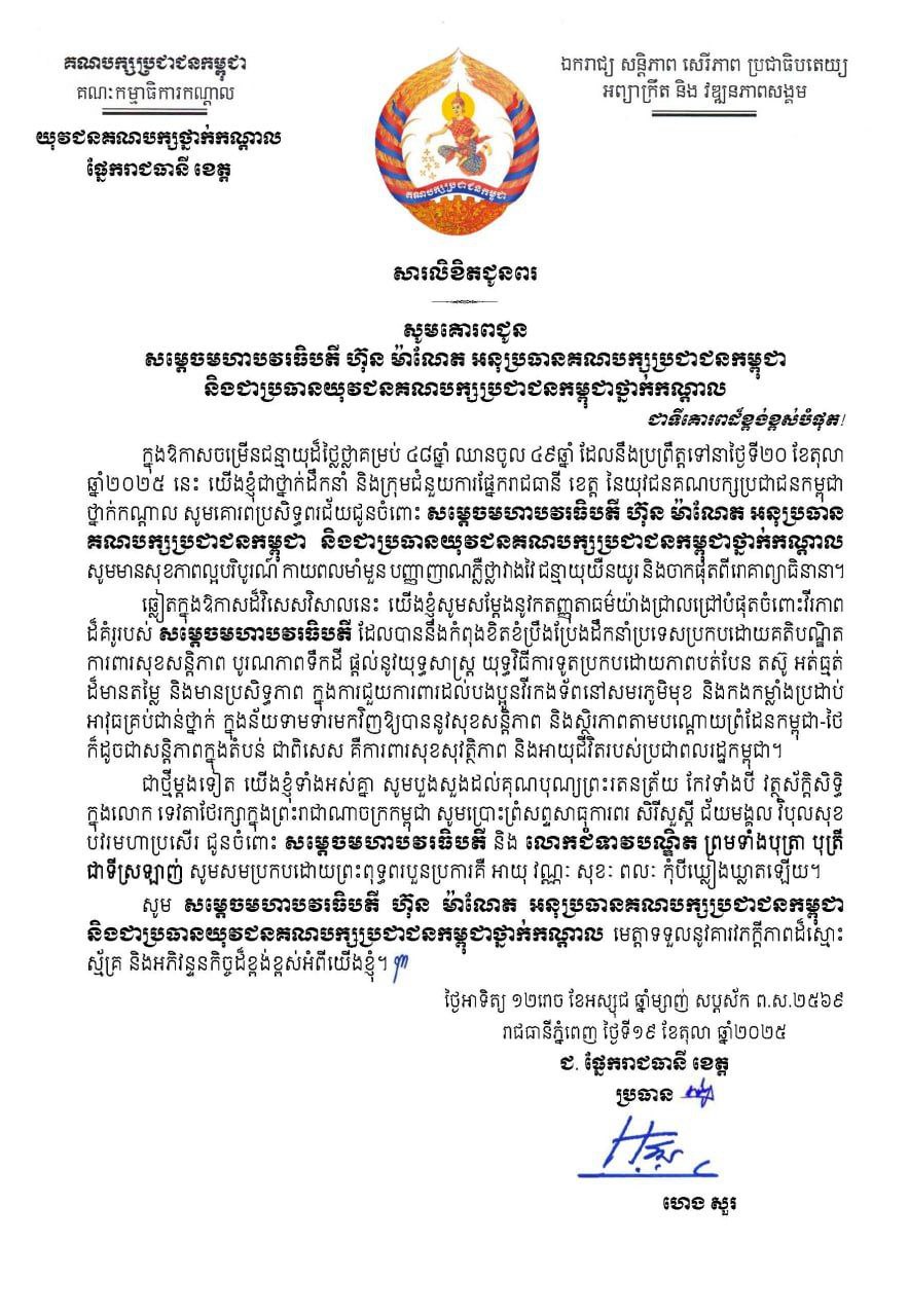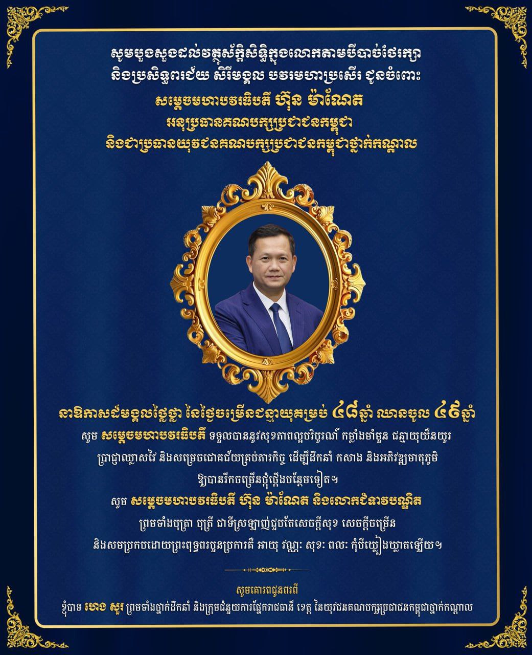 (ភ្នំពេញ)៖ ក្នុងឱកាសដ៏មង្គលសួស្តី នៃថ្ងៃខួបកំណើត សម្តេចមហាបវរធិបតី ហ៊ុន ម៉ាណែត នាយករដ្ឋមន្រ្តីនៃព្រះរាជាណាចក្រកម្ពុជា គម្រប់ ៤៨ឆ្នាំ ឈានចូល ៤៩ឆ្នាំ នាថ្ងៃទី២០ ខែតុលា ឆ្នាំ២០២៥, ឯកឧត្តម ហេង សួរ ព្រមទាំងថ្នាក់ដឹកនាំ និងសហការី ផ្នែករាជធានីខេត្ត នៃយុវជនគណបក្សប្រជាជនកម្ពុជាថ្នាក់កណ្តាល សូមប្រសិទ្ធពរជ័យគោរពជូនចំពោះ សម្តេចមហាបវរធិបតី ហ៊ុន ម៉ាណែត អនុប្រធានគណបក្សប្រជាជនកម្ពុជា និងជាប្រធានយុវជនគណបក្សប្រជាជនកម្ពុជាថ្នាក់កណ្ដាល ក្នុងឱកាសចម្រើនជន្មាយុដ៏ថ្លៃថ្លាគម្រប់ ៤៨ឆ្នាំ ឈានចូល ៤៩ឆ្នាំ ដែលប្រព្រឹត្តទៅនាថ្ងៃចន្ទ ទី២០ ខែតុលា ឆ្នាំ២០២៥នេះ។