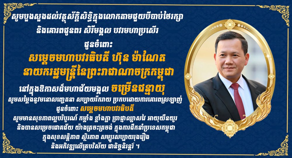 (ភ្នំពេញ)៖ ក្នុងឱកាសដ៏មង្គលសួស្តី នៃថ្ងៃខួបកំណើត សម្តេចមហាបវរធិបតី ហ៊ុន ម៉ាណែត នាយករដ្ឋមន្រ្តីនៃព្រះរាជាណាចក្រកម្ពុជា គម្រប់ ៤៨ឆ្នាំ ឈានចូល ៤៩ឆ្នាំ នាថ្ងៃទី២០ ខែតុលា ឆ្នាំ២០២៥, ឯកឧត្តម