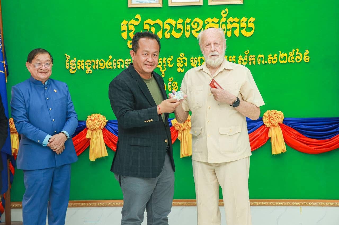 កែប:រដ្ឋបាលខេត្តកែប រៀបចំពិធីប្រគល់ព្រះរាជក្រឹត្យផ្ដល់សញ្ជាតិខ្មែរ ជូនលោក ក្លែន ន័បឺត ហាន់ (KLEIN NORBERT HANS) ជនជាតិអាល្លឺម៉ង់ សញ្ជាតិអាល្លឺម៉ង់ បន្ទាប់ពីលោកបានកសាងស្នាដៃជាច្រើនជួយរាជរដ្ឋាភិបាលកម្ពុជា និងសង្គមជាតិកម្ពុជាជាច្រើនឆ្នាំកន្លងមក ក្រោមអធិបតីភាព ឯកឧត្ដម ខៀវ កាញារីទ្ធ សមាជិកសភា និងជាឧត្ដមប្រឹក្សាផ្ទាល់ព្រះមហាក្សត្រ និងលោកជំទាវ ខៀវ ទេពរង្ស៊ី កាញារីទ្ធ ព្រមទាំងឯកឧត្តមបណ្ឌិត សោម ពិសិដ្ឋ អភិបាលនៃគណៈអភិបាលខេត្តកែប នាព្រឹកថ្ងៃទី២១ ខែតុលា ឆ្នាំ២០២៥។