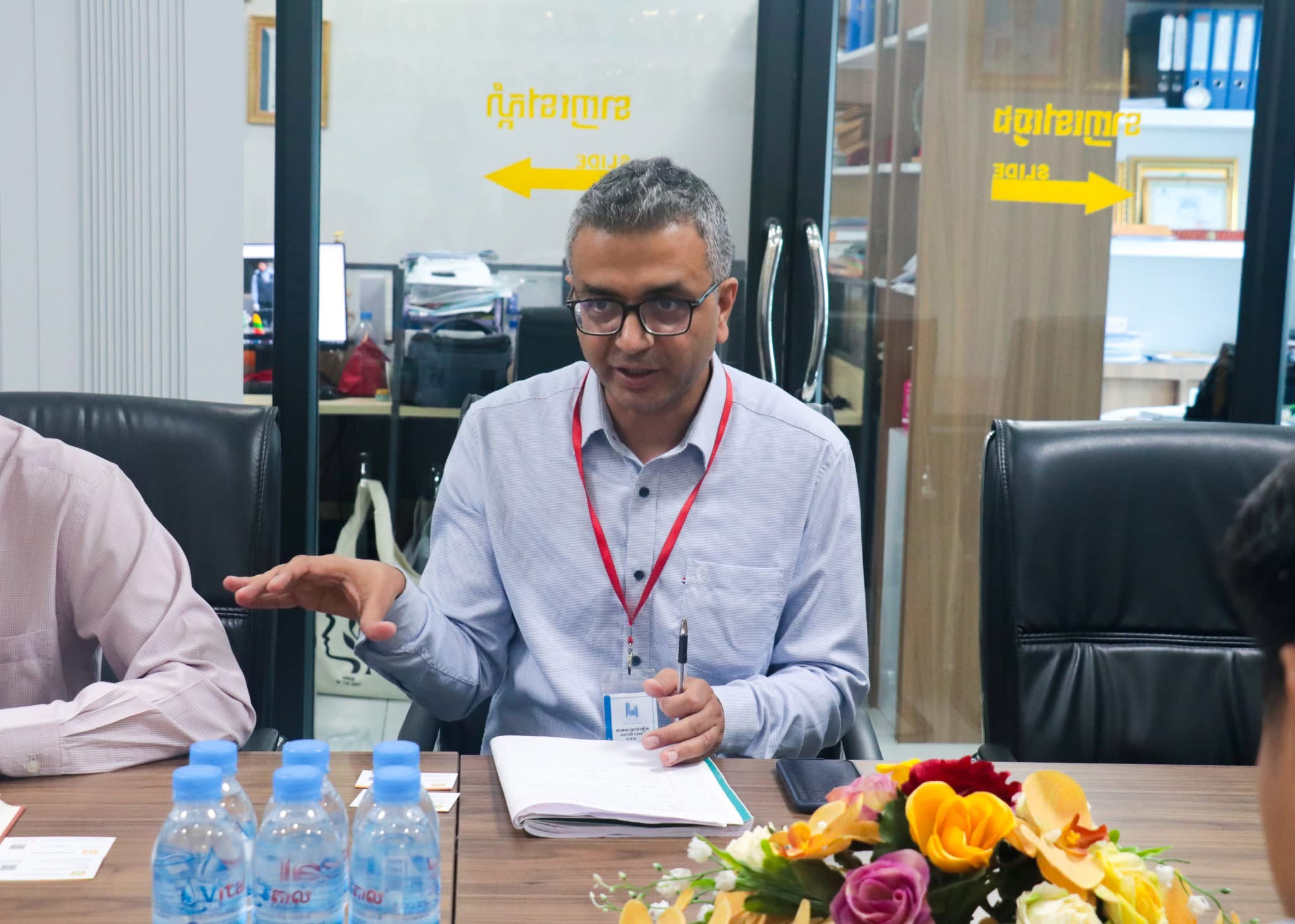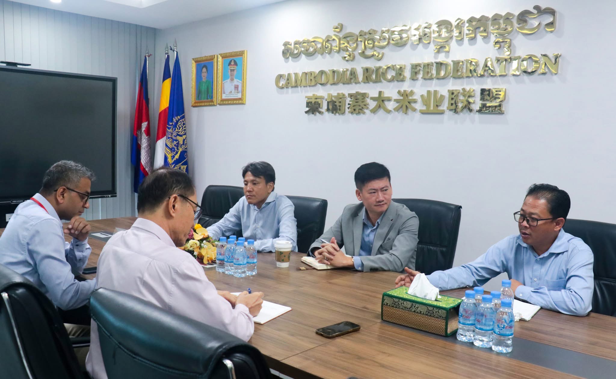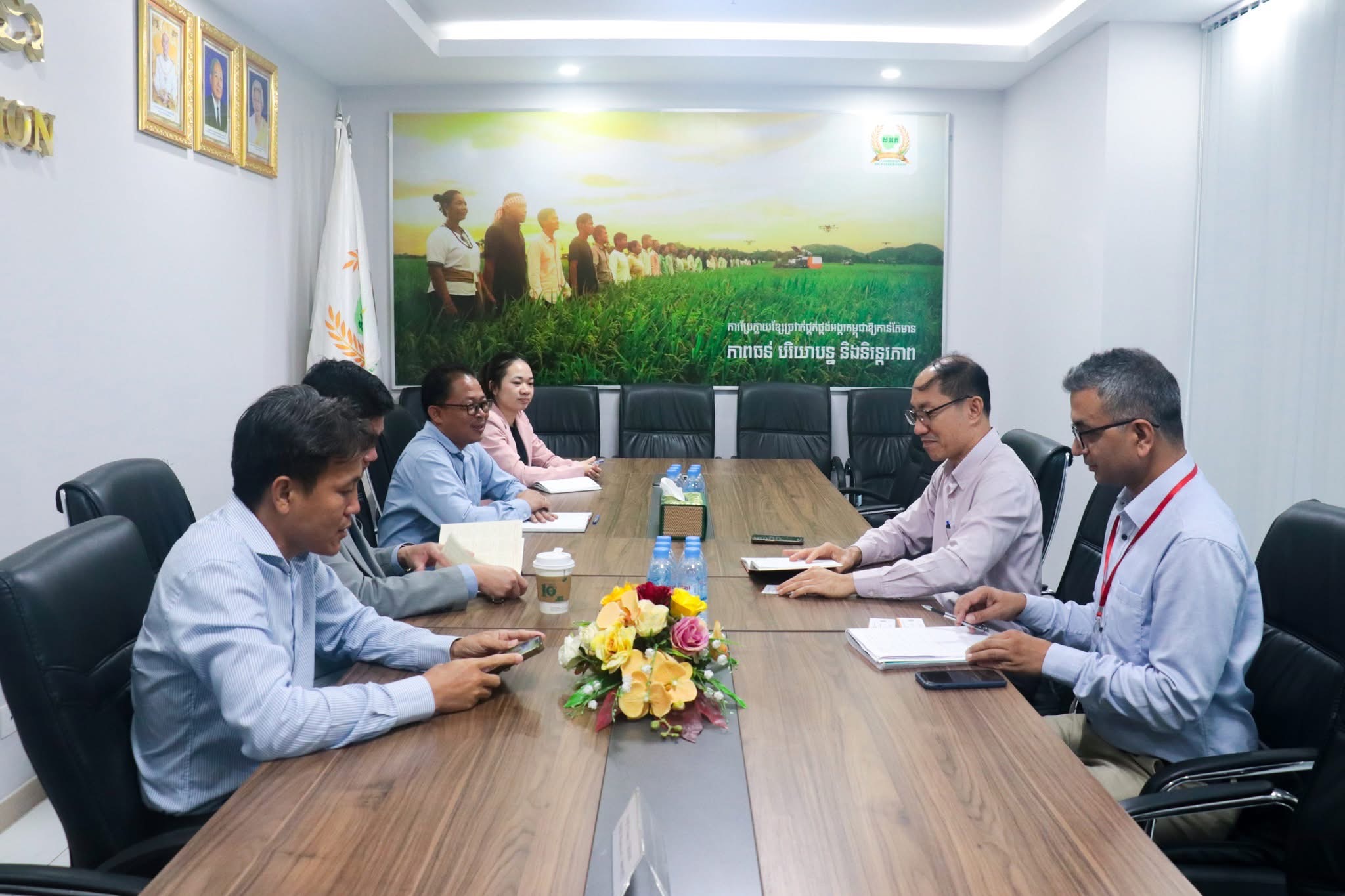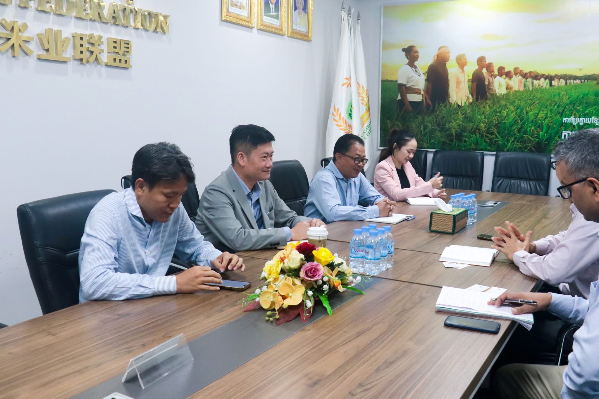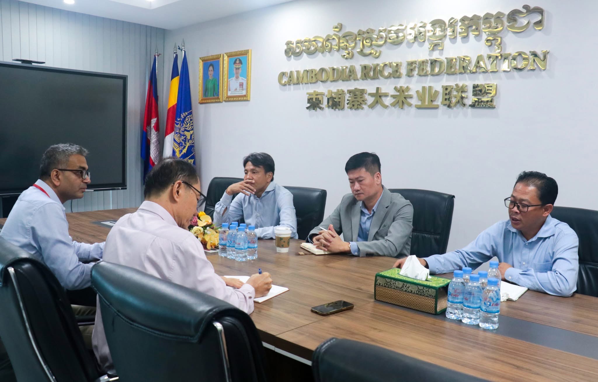 On Tuesday morning of 28 October, 2025, at the Cambodia Rice Federation, Oknha Lay Chhun Hour, president of the Cambodia Rice Federation, and Mr. Chan Pich, vice president of the Cambodia Rice Federation, join a meeting with the team of the Smallholder Resilient Economic Development (SRED) Project of the Asian Development Bank to discuss financial products, risk management in the agricultural sector, and its challenges.