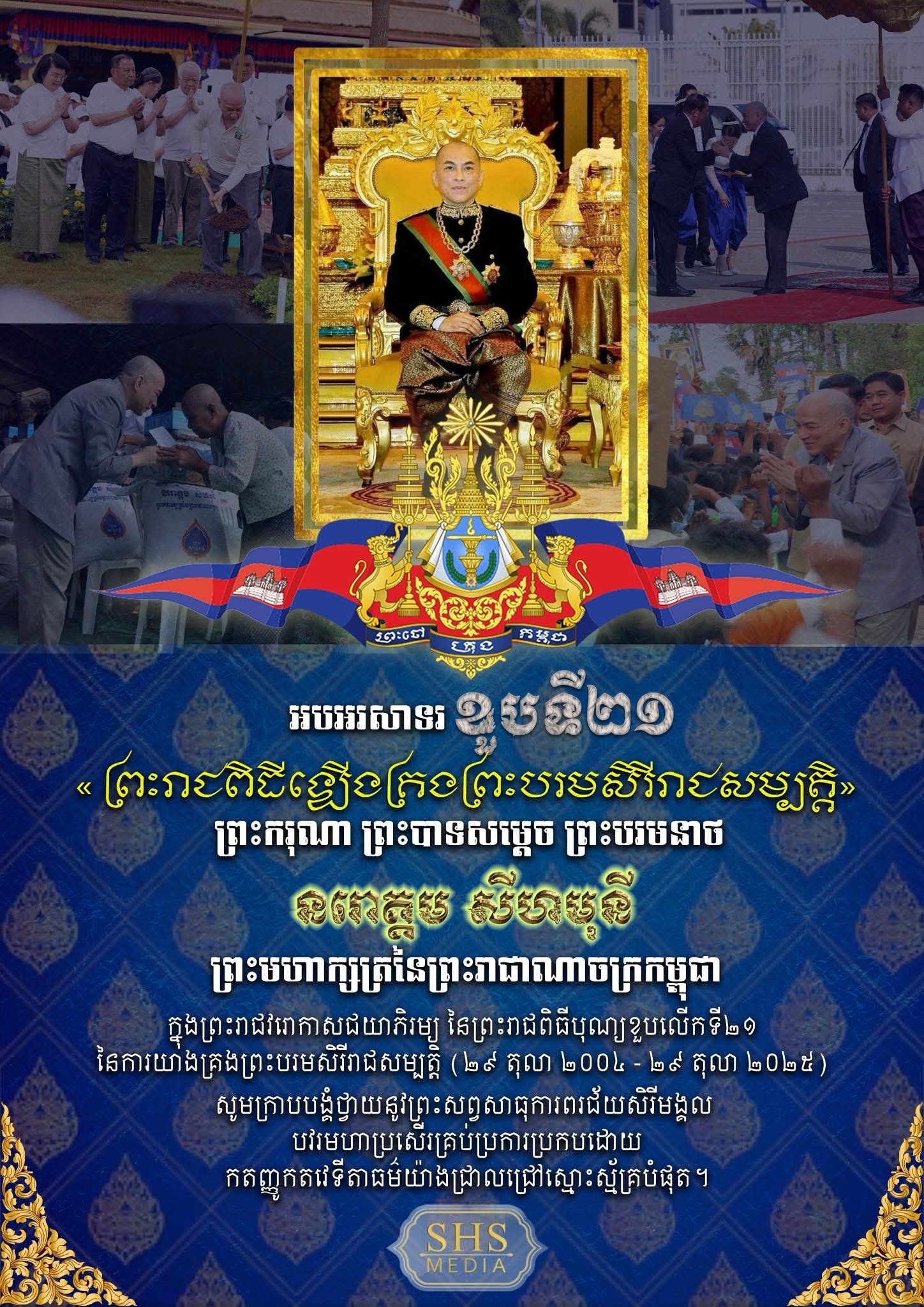 (ភ្នំពេញ)៖ ក្នុងឱកាសដ៏មហានក្ខត្តឫក្ស សិរីសួស្តី ជ័យមង្គល ប្រសើរថ្លៃថ្លា ឧត្តុង្គឧត្តមប្រកបដោយសេចក្តីសោមនស្សរីករាយ ខួបលើកទី២១ នៃព្រះរាជពិធីគ្រងព្រះបរមរាជសម្បត្តិ របស់ព្រះករុណា ព្រះបាទសម្តេច ព្រះបរមនាថ នរោត្តម សីហមុនី ព្រះមហាក្សត្រនៃព្រះរាជាណាចក្រកម្ពុជា ជាទីគោរពសក្ការៈដ៏ខ្ពង់ខ្ពស់បំផុត ដែលប្រព្រឹត្តទៅនៅថ្ងៃពុធ ៨កើត ខែកត្តិក ឆ្នាំម្សាញ់ សប្តស័ក ព.ស.២៥៦៩ ត្រូវនឹងថ្ងៃទី២៩ ខែតុលា ឆ្នាំ២០២៥,