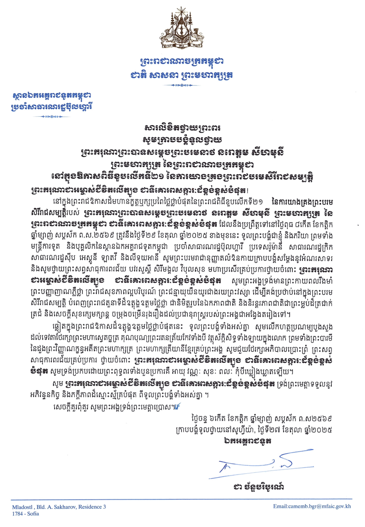 ឯកឧត្តម ជា ច័ន្ទបរិបូរណ៍ ឯកអគ្គរាជទូតឯកអគ្គរាជទូតកម្ពុជាប្រចាំសាធារណៈរដ្ឋប៊ុលហ្គារី ប្រទេសរ៉ូម៉ានី និងភរិយា ព្រមទាំងមន្ត្រីការទូត សូមព្រះបរមរាជានុញ្ញាត ផ្ញើសារថ្វាយព្រះពរព្រះមហាក្សត្រ ក្នុងឱកាសខួបលើកទី២១នៃព្រះរាជពិធីគ្រងព្រះបរមរាជសម្បត្តិ