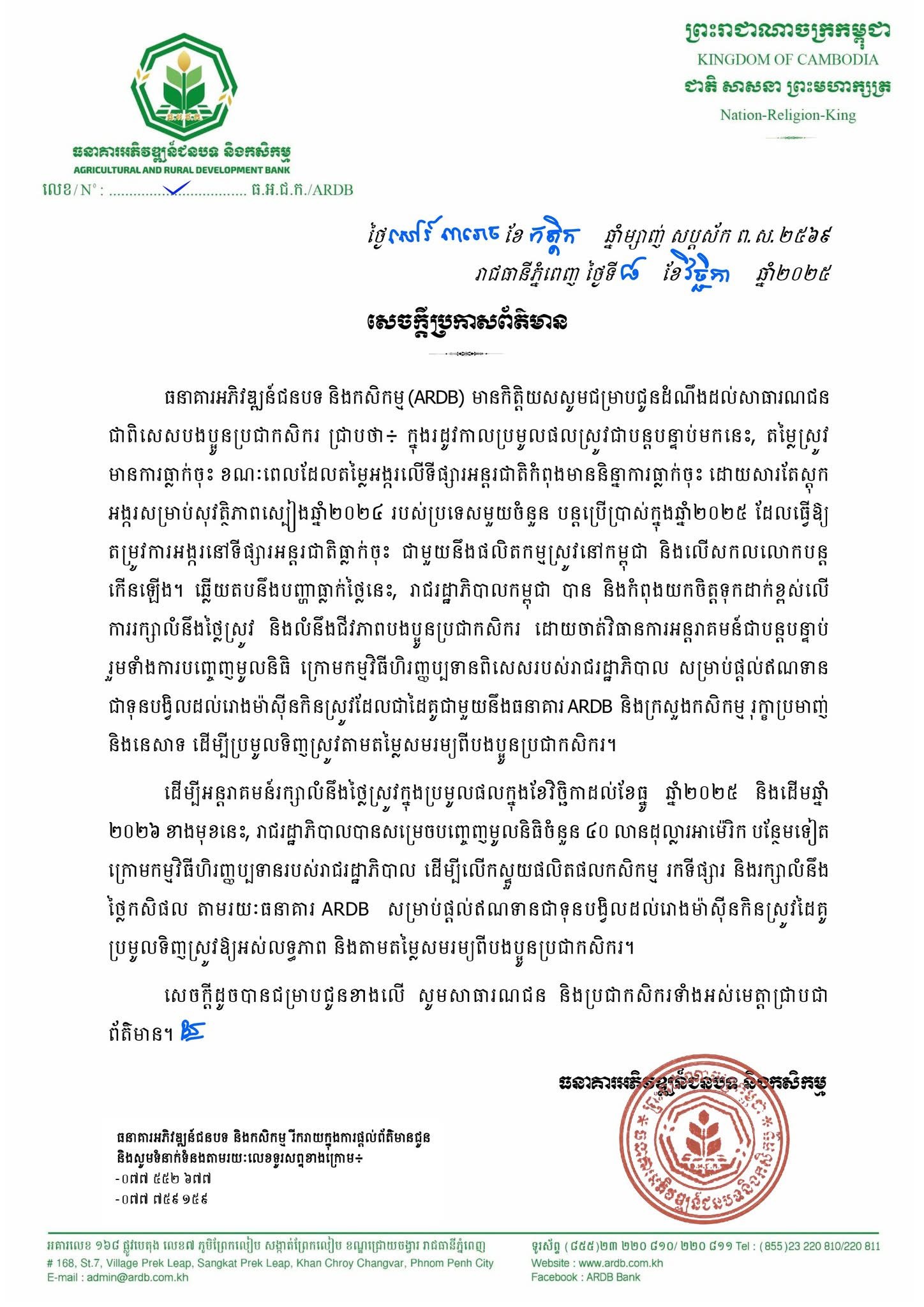 ដើម្បីអន្តរាគមន៍រក្សាលំនឹងថ្លៃស្រូវក្នុងប្រមូលផលក្នុងខែវិច្ឆិកាដល់ខែធ្នូ ឆ្នាំ២០២៥ និងដើមឆ្នាំ ២០២៦ ខាងមុខនេះ រាជរដ្ឋាភិបាលបានសម្រេចបញ្ចេញមូលនិធិចំនួន៤០ លានដុល្លារអាម៉េរិកបន្ថែមទៀត ក្រោមកម្មវិធីហិរញ្ញប្បទានរបស់រាជរដ្ឋាភិបាល ដើម្បីលើកស្ទួយផលិតផលកសិកម្ម រកទីផ្សារ និងរក្សាលំនឹង ថ្លៃកសិផល តាមរយៈធនាគារ ARDB សម្រាប់ផ្តល់ឥណទានជាបង្វិលដល់រោងម៉ាស៊ីនកិនស្រូវដៃគូ ប្រមូលទិញស្រូវឱ្យអស់លទ្ធភាព និងតាមតម្លៃសមរម្យពីបងប្អូនប្រជាកសិករ៕