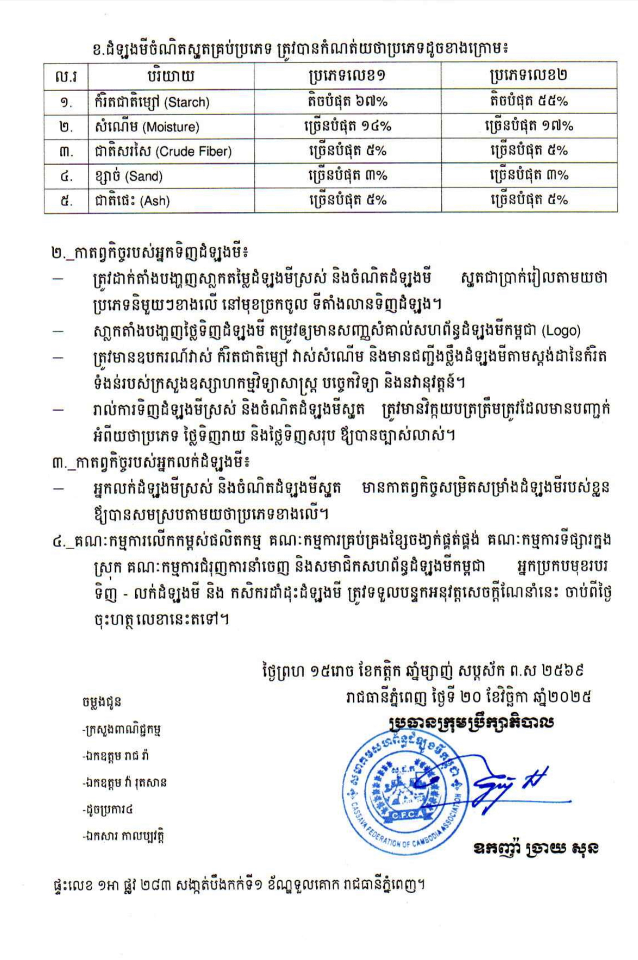 ភ្នំពេញ:សហព័ន្ធដំឡូងមីកម្ពុជាចេញសេចក្តីណែនាំស្តីពីក្រមប្រតិបត្តិរួមនិងនិតិវិធីនៃការទិញ-លក់ដំឡូងមីនៅកម្ពុជានៅថ្ងៃទី២០ខែវិច្ឆិកាឆ្នាំ២០២៥។