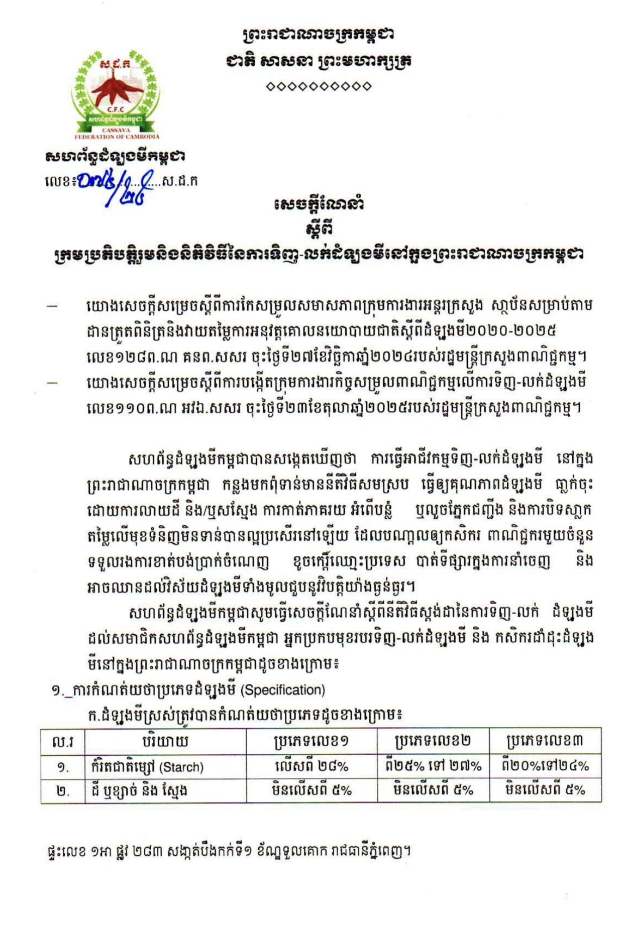 សហព័ន្ធដំឡូងមីកម្ពុជាសូមធ្វើសេចក្តីណែនាំស្តីពីនីតិវិធីស្តង់ដានៃការទិញ-លក់ ដំឡូងមី ដល់សមាជិកសហព័ន្ធដំឡូងមីកម្ពុជា អ្នកប្រកបមុខរបរទិញ-លក់ដំឡូងមី និង កសិករដាំដុះដំឡូង មីនៅក្នុងព្រះរាជាណាចក្រកម្ពុជាដូចខាងក្រោម៖
