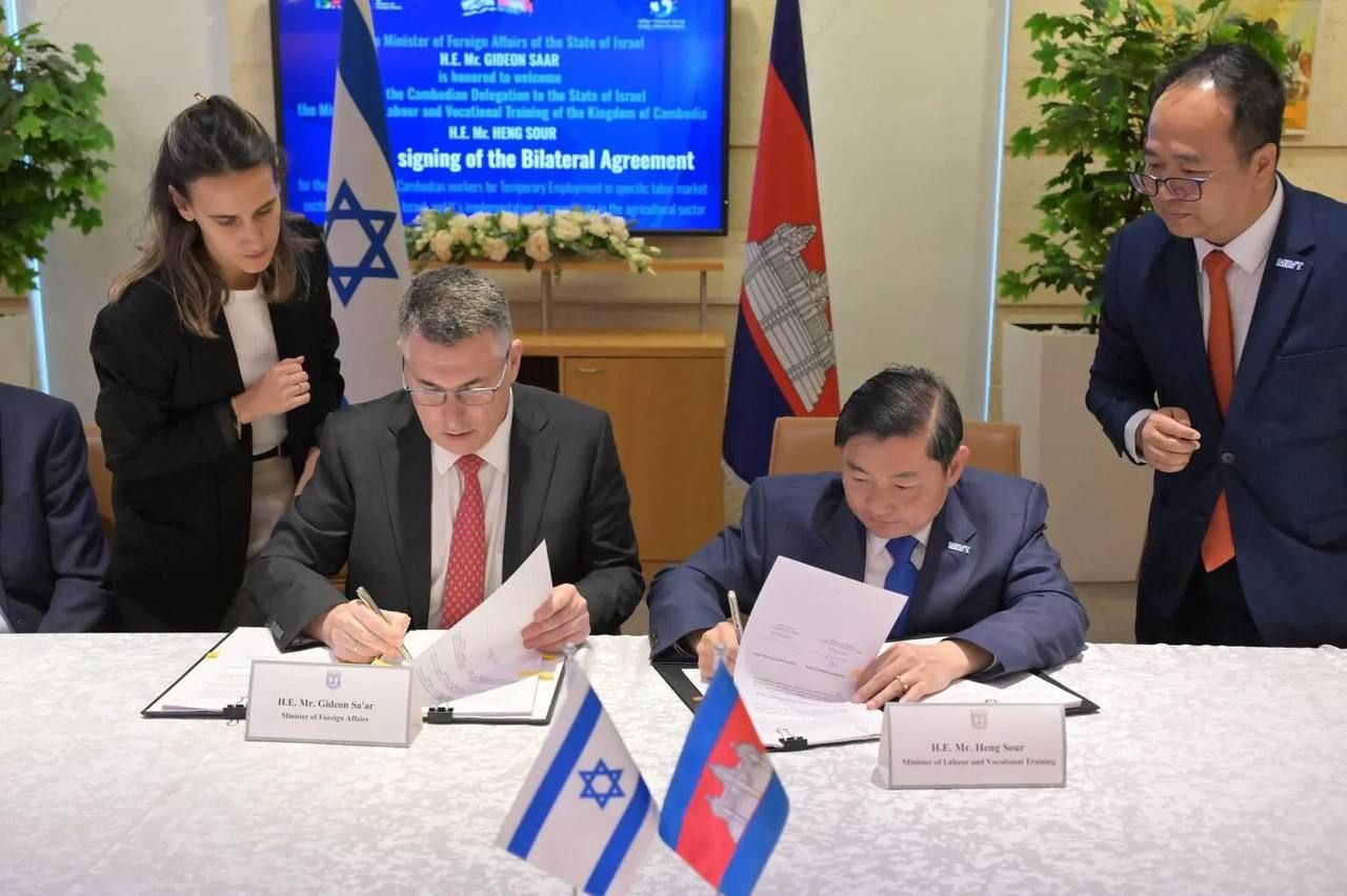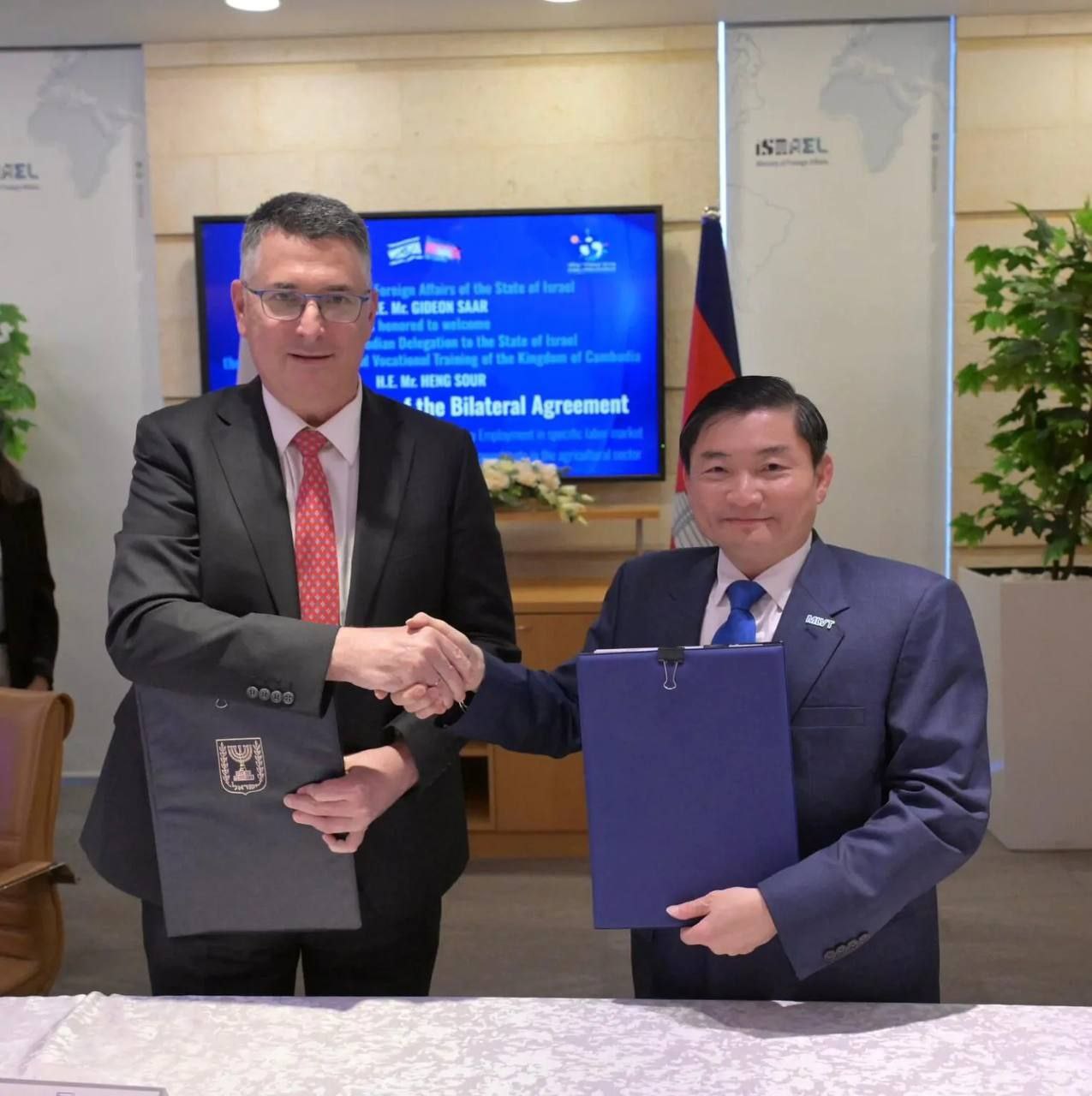 (ហ៊្សេរុយសាឡិម)៖ នៅរសៀលថ្ងៃទី១ ខែធ្នូ ឆ្នាំ២០២៥ ឯកឧត្តម ហេង សួរ រដ្ឋមន្ត្រីក្រសួងការងារ និងបណ្តុះបណ្តាលវិជ្ជាជីវៈ និងឯកឧត្តម ហ្គីដន សាអា (Gideon Sa’ar) រដ្ឋមន្រ្តីក្រសួងការបរទេស នៃរដ្ឋអុីស្រាអែល បានចុះហត្ថលេខាលើកិច្ចព្រមព្រៀងស្តីពីកិច្ចសហប្រតិបត្តិការលើវិស័យការងារ ដែលបើកទំព័រដំបូងនៃការផ្លាស់ប្តូរកម្លាំងពលកម្មជាមួយគ្នាទៅវិញទៅមក ដែលនឹងកំណត់នូវយន្តការ និងអាចផ្តល់ឱកាសដល់ប្រជាពលរដ្ឋកម្ពុជាអាចពិចារណាក្នុងការទៅធ្វើការងារលើវិស័យកសិកម្ម និងវិស័យផ្សេងទៀតនៅពេលដ៏ខ្លីខាងមុខនេះ។