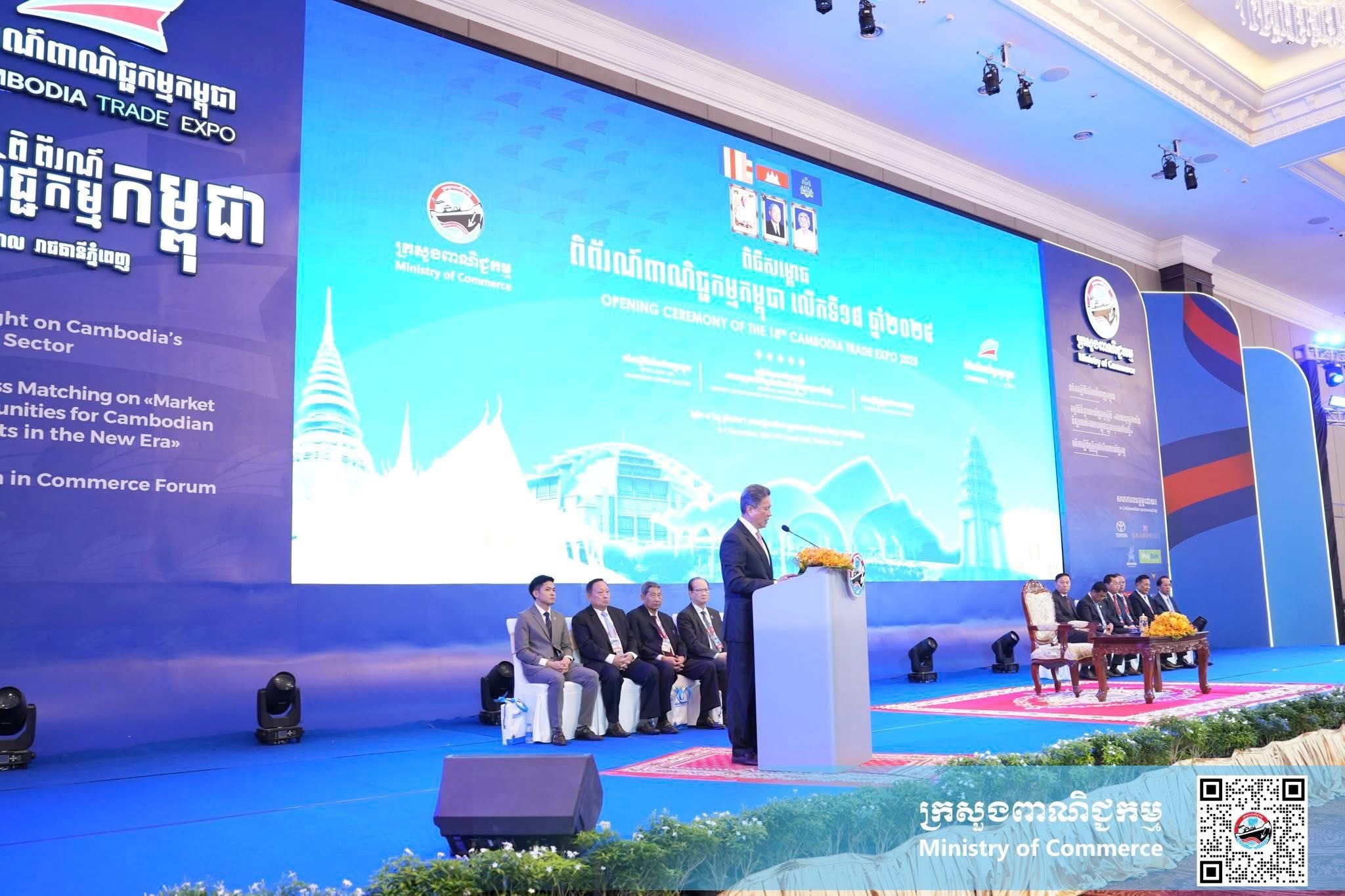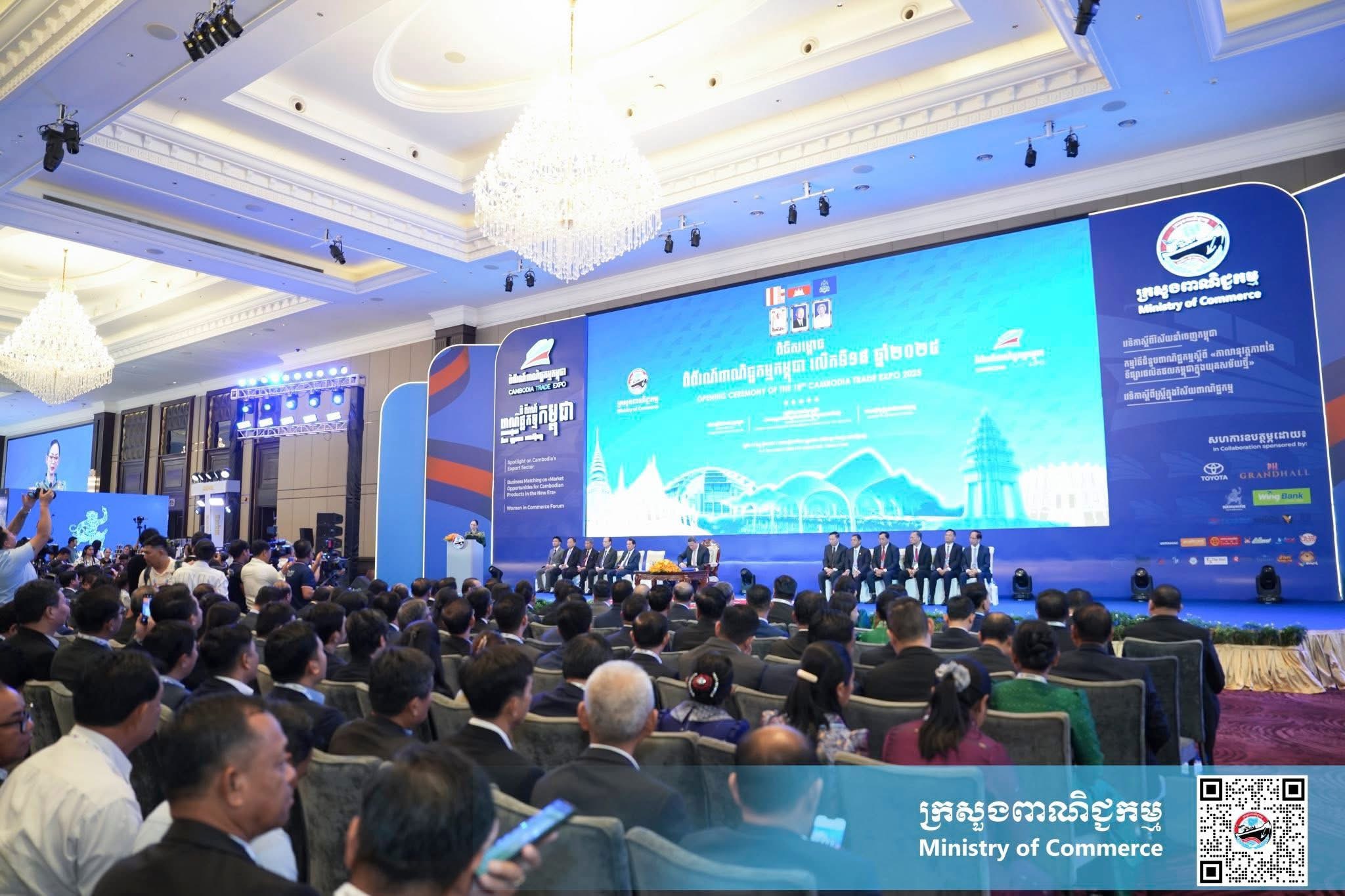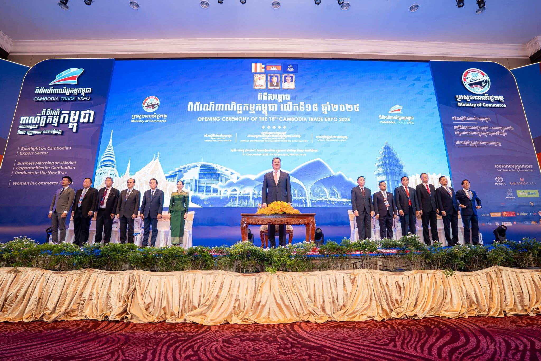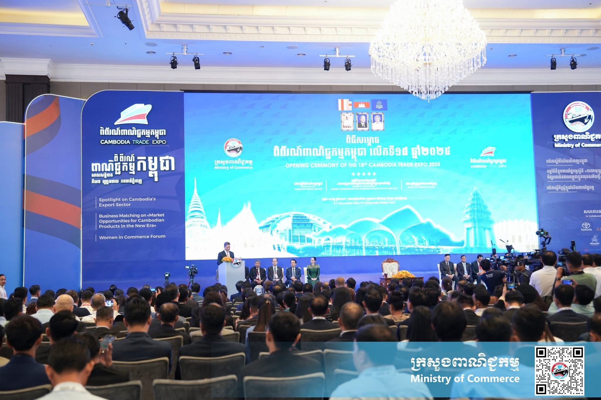 (ភ្នំពេញ)៖ នាព្រឹកថ្ងៃព្រហស្បតិ៍ ទី៤ ខែធ្នូ ឆ្នាំ២០២៥ សាលសន្និបាត ភីអេច ហ្គ្រេនហល បុរីប៉េងហួត បឹងស្នោ រាជធានីភ្នំពេញ ក្រសួងពាណិជ្ជកម្ម បានរៀបចំពិធីសម្ពោធ “ពិព័រណ៍ពាណិជ្ជកម្មកម្ពុជា” លើកទី១៨ ឆ្នាំ២០២៥ ក្រោមមូលបទ “យុគសម័យថ្មីនៃពាណិជ្ជកម្ម៖ បង្កើនកិត្យានុភាពផលិតផលក្នុងស្រុក” ក្រោមអធិបតីភាព ឯកឧត្តម ស៊ុន ចាន់ថុល ឧបនាយករដ្ឋមន្ត្រី អនុប្រធានទី១ ក្រុមប្រឹក្សាអភិវឌ្ឍន៍ កម្ពុជាតំណាងដ៏ខ្ពង់ខ្ពស់ សម្តេចមហាបវរធិបតី ហ៊ុន ម៉ាណែត នាយករដ្ឋមន្ត្រី នៃព្រះរាជាណាចក្រកម្ពុជា។