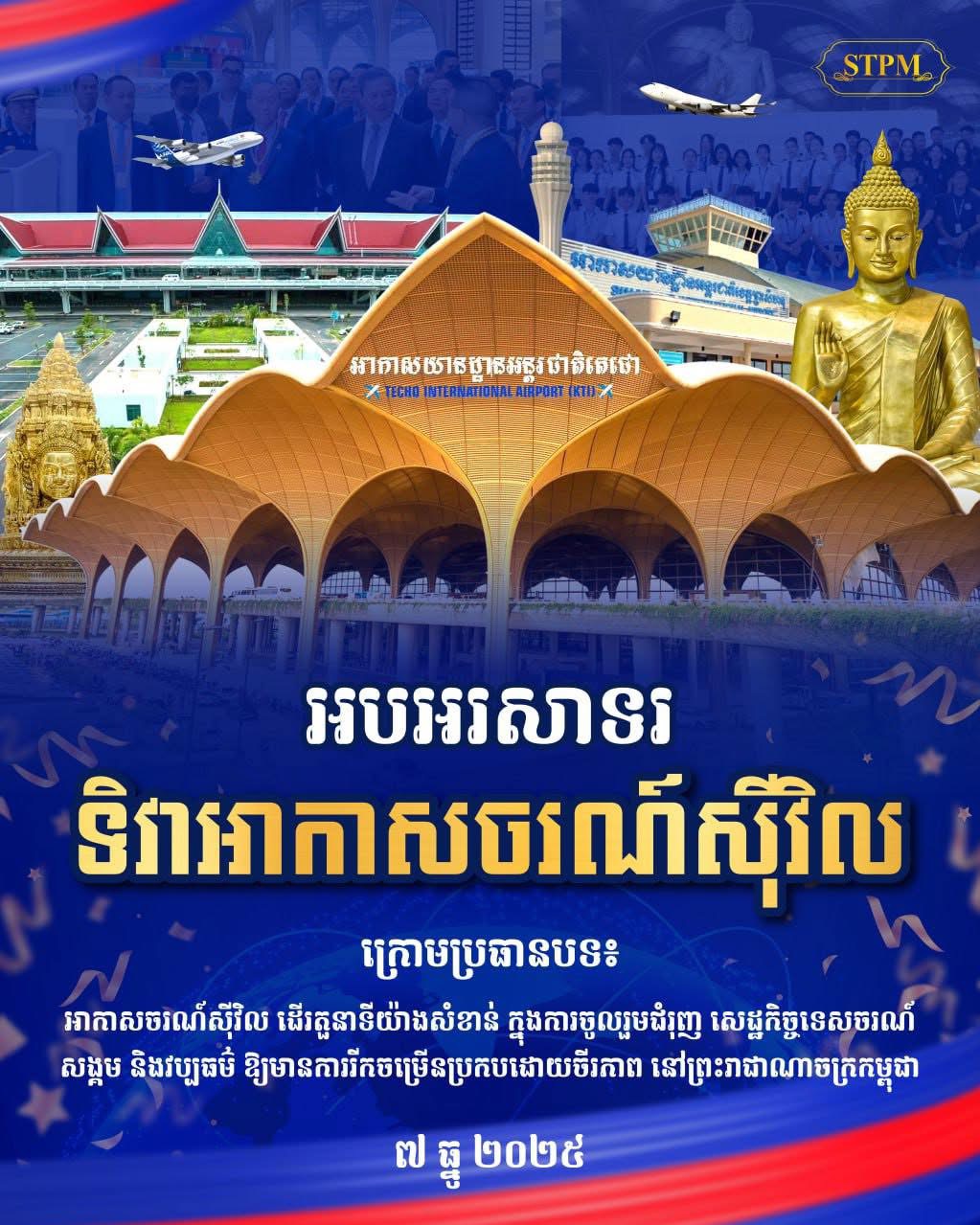 ភ្នំពេញ:អបអរសាទរ ទិវាជាតិអាកាសចរណ៍ស៊ីវិលលើកទី១ ក្រោមប្រធានបទ «អាកាសចរណ៍ស៊ីវិល ដើរតួនាទីយ៉ាងសំខាន់ ក្នុងការចូលរួមជំរុញសេដ្ឋកិច្ច ទេសចរណ៍ សង្គមនិងវប្បធម៌ ឱ្យមានការរីកចម្រើនប្រកប ដោយចីរភាពនៅព្រះរាជាណាចក្រកម្ពុជា» ដែលជាប្រធានបទដ៏សំខាន់មួយសម្រាប់បង្កើនការយល់ដឹងកាន់តែ ទូលំទូលាយក្នុងចំណោមពលរដ្ឋទូទាំងប្រទេស បណ្តាស្ថាប័នរដ្ឋាភិបាល ស្ថាប័ននីតិប្បញ្ញត្តិ ស្ថាប័នតុលាការ និង បណ្តាភាគីពាក់ព័ន្ធផ្សេងៗទៀត អំពីសារៈសំខាន់នៃវិស័យអាកាសចរណ៍ស៊ីវិល មិនគ្រាន់តែចូលរួមចំណែកក្នុងការ រក្សាបាន និងលើកកម្ពស់នូវសុវត្ថិភាពនិងសន្តិសុខដល់បងប្អូនជនរួមជាតិក្នុងការធ្វើដំណើរតាមផ្លូវអាកាសប៉ុណ្ណោះទេ វិស័យអាកាសចរណ៍ស៊ីវិលថែមទាំងបានជួយលើកកម្ពស់វិស័យទេសចរណ៍ ដែលជាវិស័យគន្លឹះសំខាន់មួយនៃ សេដ្ឋកិច្ចជាតិ តាមរយៈការកែលម្អសេវាកម្មអាកាសចរណ៍ និងការសាងសង់អាកាសយានដ្ឋានទំនើបៗ បានធ្វើ ឱ្យមានការទាក់ទាញភ្ញៀវទេសចរច្រើនជាងមុន មកពីបណ្តាប្រទេសនានាជុំវិញពិភពលោក ដោយជួយបង្កើន ចំណូលជាតិ បង្កើតការងារ និងឱកាសអាជីវកម្មថ្មីៗ។