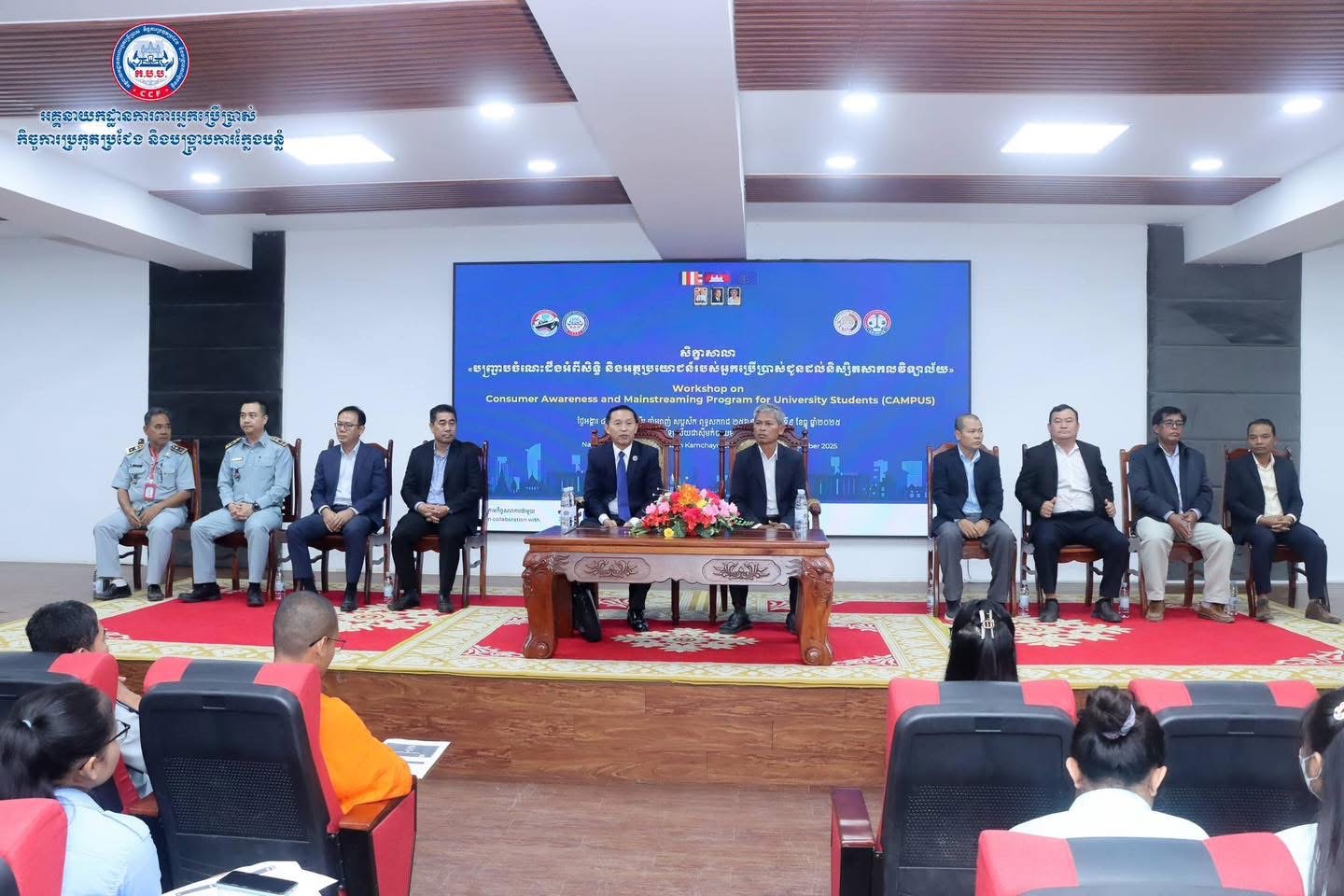 (ខេត្តព្រៃវែង)៖ នាព្រឹកថ្ងៃចន្ទ ទី៩ ខែធ្នូ ឆ្នាំ២០២៥ អគ្គនាយកដ្ឋានកិច្ចការពារអ្នកប្រើប្រាស់ និងការប្រកួតប្រជែង នៃក្រសួងពាណិជ្ជកម្ម ក្រោមគម្រោង EU-German GATE បានរៀបចំសិក្ខាសាលាស្ដីពី «បញ្ជ្រាបចំណេះដឹងអំពីសិទ្ធិ និងអត្ថប្រយោជន៍របស់អ្នកប្រើប្រាស់ជូនដល់និស្សិតសាកលវិទ្យាល័យ (CAMPUS)» ជូនដល់និស្សិតសាកលវិទ្យាល័យជាតិជាស៊ីមកំចាយមារ ក្រោមអធិបតីភាព លោក ង៉ែត ចេក អគ្គនាយករង តំណាង ឯកឧត្តម គឹម មាសសុខសីហា អគ្គនាយកនៃអគ្គនាយកដ្ឋានកិច្ចការពារអ្នកប្រើប្រាស់ និងការប្រកួតប្រជែង និង លោកសាស្ត្រាចារ្យ មាស ធឿន សាកលវិទ្យាធិការរង នៃសាកលវិទ្យាល័យជាតិជាស៊ីមកំចាយមារ។
