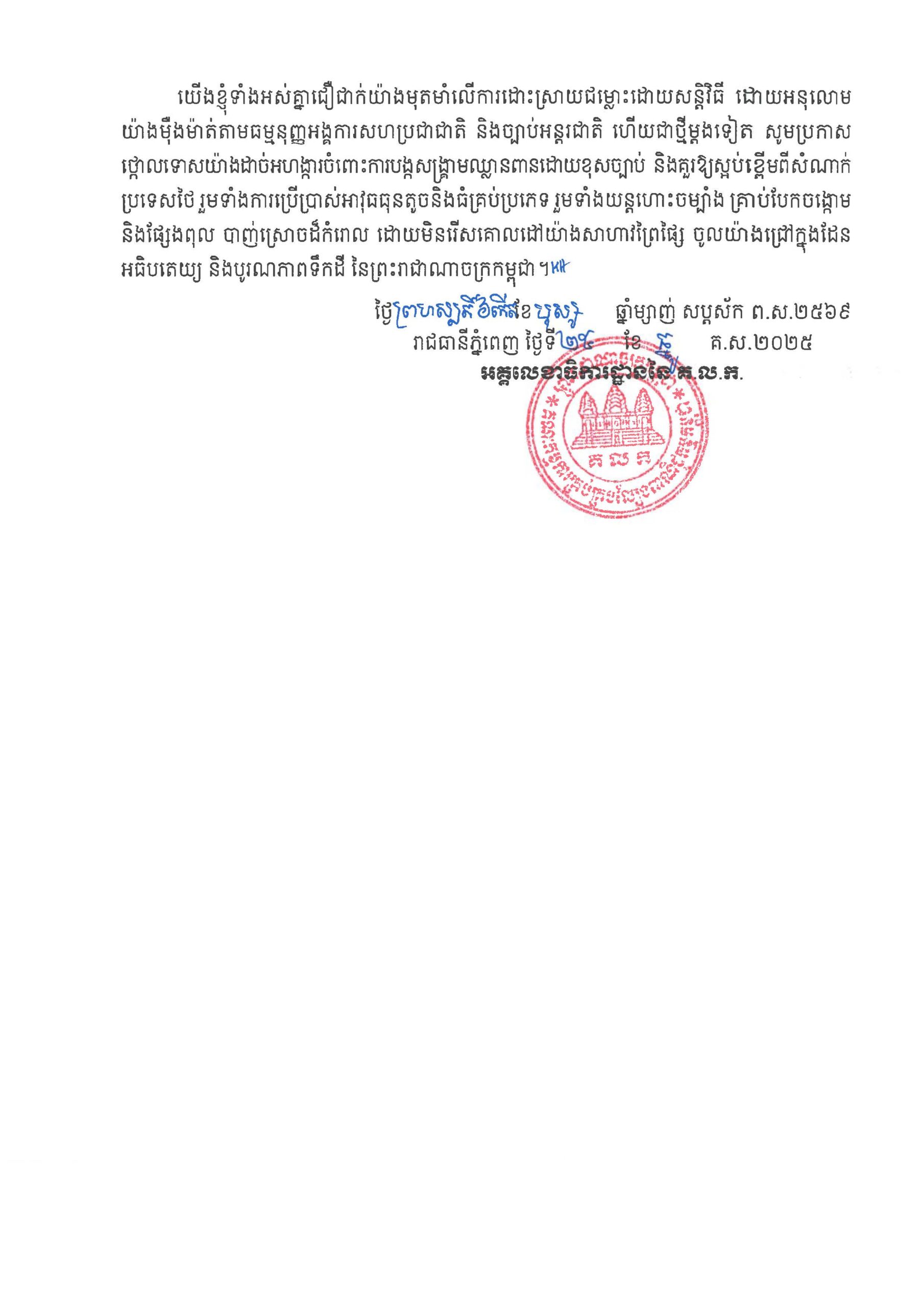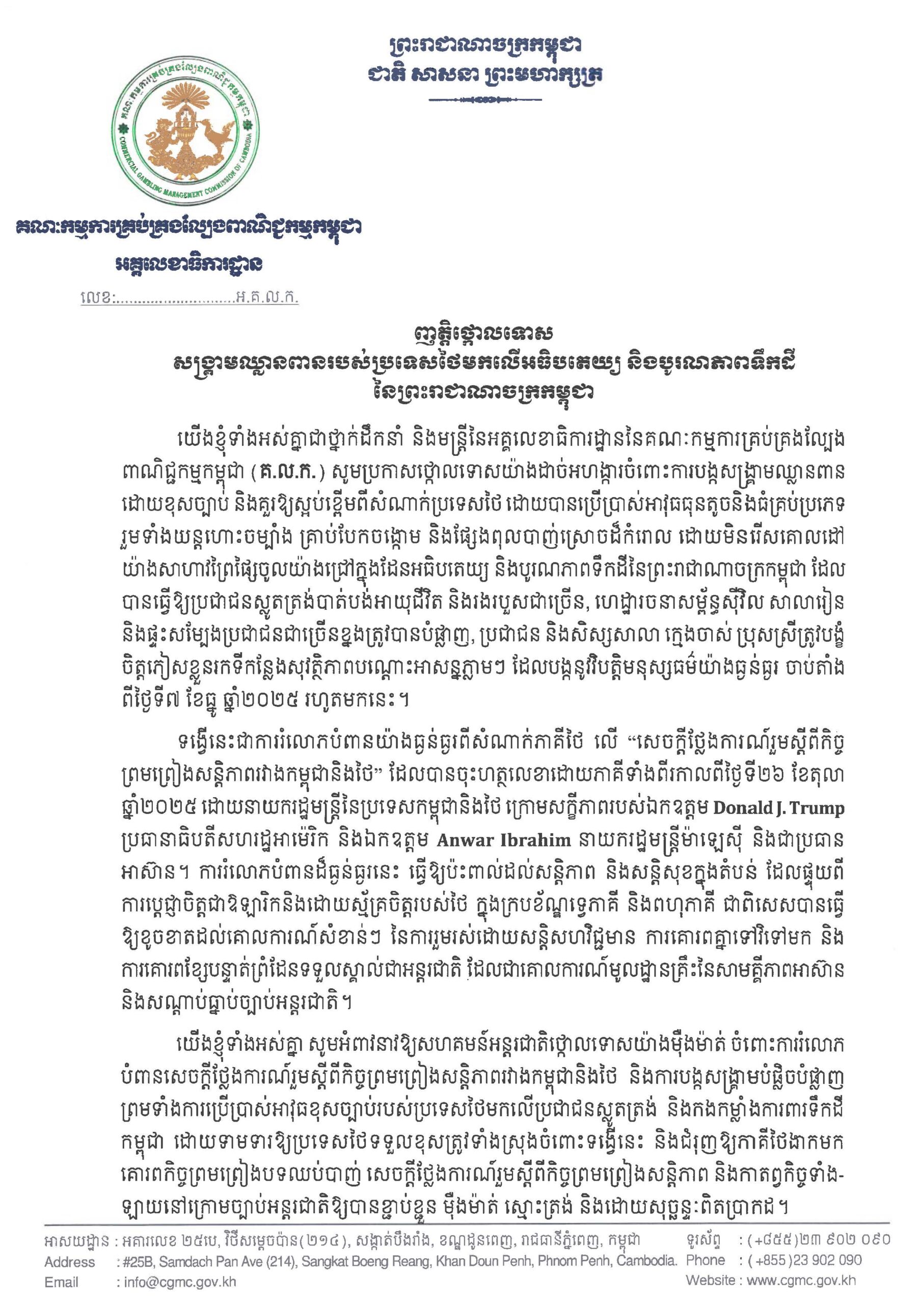 ភ្នំពេញ៖អគ្គលេខាធិការដ្ឋាននៃគណៈកម្មការគ្រប់គ្រងល្បែងពាណិជ្ជកម្មកម្ពុជា(គ.ល.ក.) ទាំងអស់គ្នាជាថ្នាក់ដឹកនាំ និងមន្ត្រីនៃអគ្គលេខាធិការដ្ឋាននៃគណៈកម្មការគ្រប់គ្រងល្បែង ពាណិជ្ជកម្មកម្ពុជា (គ.ល.ក.) សូមប្រកាសថ្កោលទោសយ៉ាងដាច់អហង្ការចំពោះការបង្កសង្គ្រាមឈ្លានពាន ដោយខុសច្បាប់ និងគួរឱ្យស្អប់ខ្ពើមពីសំណាក់ប្រទេសថៃ ដោយបានប្រើប្រាស់អាវុធធុនតូចនិងធំគ្រប់ប្រភេទ រួមទាំងយន្តហោះចម្បាំង គ្រាប់បែកចង្កោម និងផ្សែងពុលបាញ់ស្រោចដ៏កំរោល ដោយមិនរើសគោលដៅយ៉ាងសាហាវព្រៃផ្សៃចូលយ៉ាងជ្រៅក្នុងដែនអធិបតេយ្យ និងបូរណភាពទឹកដីនៃព្រះរាជាណាចក្រកម្ពុជា ដែល បានធ្វើឱ្យប្រជាជនស្លូតត្រង់បាត់បង់អាយុជីវិត និងរងរបួសជាច្រើន, ហេដ្ឋារចនាសម្ព័ន្ធស៊ីវិល សាលារៀន និងផ្ទះសម្បែងប្រជាជនជាច្រើនខ្នងត្រូវបានបំផ្លាញ, ប្រជាជន និងសិស្សសាលា ក្មេងចាស់ ប្រុសស្រីត្រូវបង្ខំ ចិត្តភៀសខ្លួនរកទីកន្លែងសុវត្ថិភាពបណ្តោះអាសន្នភ្លាមៗ ដែលបង្កនូវវិបត្តិមនុស្សធម៌យ៉ាងធ្ងន់ធ្ងរ ចាប់តាំង ពីថ្ងៃទី៧ ខែធ្នូ ឆ្នាំ២០២៥ រហូតមកនេះ។