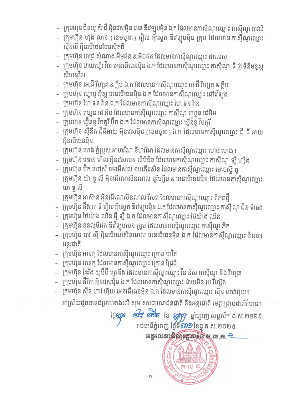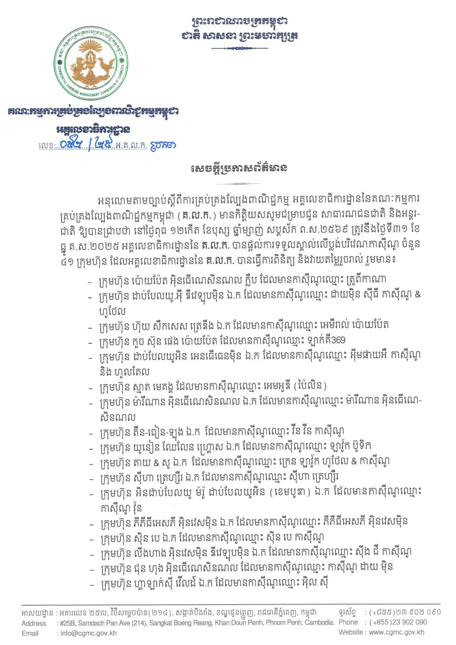 ភ្នំពេញ៖ សេចក្តីប្រកាសព័ត៌មាន អនុលោមតាមច្បាប់ស្តីពីការគ្រប់គ្រងល្បែងពាណិជ្ជកម្ម អគ្គលេខាធិការដ្ឋាននៃគណៈកម្មការ គ្រប់គ្រងល្បែងពាណិជ្ជកម្មកម្ពុជា (គ.ល.ក.) មានកិត្តិយសសូមជម្រាបជូន សាធារណជនជាតិ និងអន្តរ ជាតិ ឱ្យបានជ្រាបថា នៅថ្ងៃពុធ ១២កើត ខែបុស្ស ឆ្នាំម្សាញ់ សប្តស័ក ព.ស.២៥៦៩ ត្រូវនឹងថ្ងៃទី៣១ ខែ ធ្នូ គ.ស.២០២៥ អគ្គលេខាធិការដ្ឋាននៃ គ.ល.ក. បានផ្តល់ការទទួលស្គាល់លើប្លង់បរិវេណកាស៊ីណូ ចំនួន ៤១ ក្រុមហ៊ុន ដែលអគ្គលេខាធិការដ្ឋាននៃ គ.ល.ក. បានធ្វើការពិនិត្យ និងវាយតម្លៃរួចរាល់ហើយ។