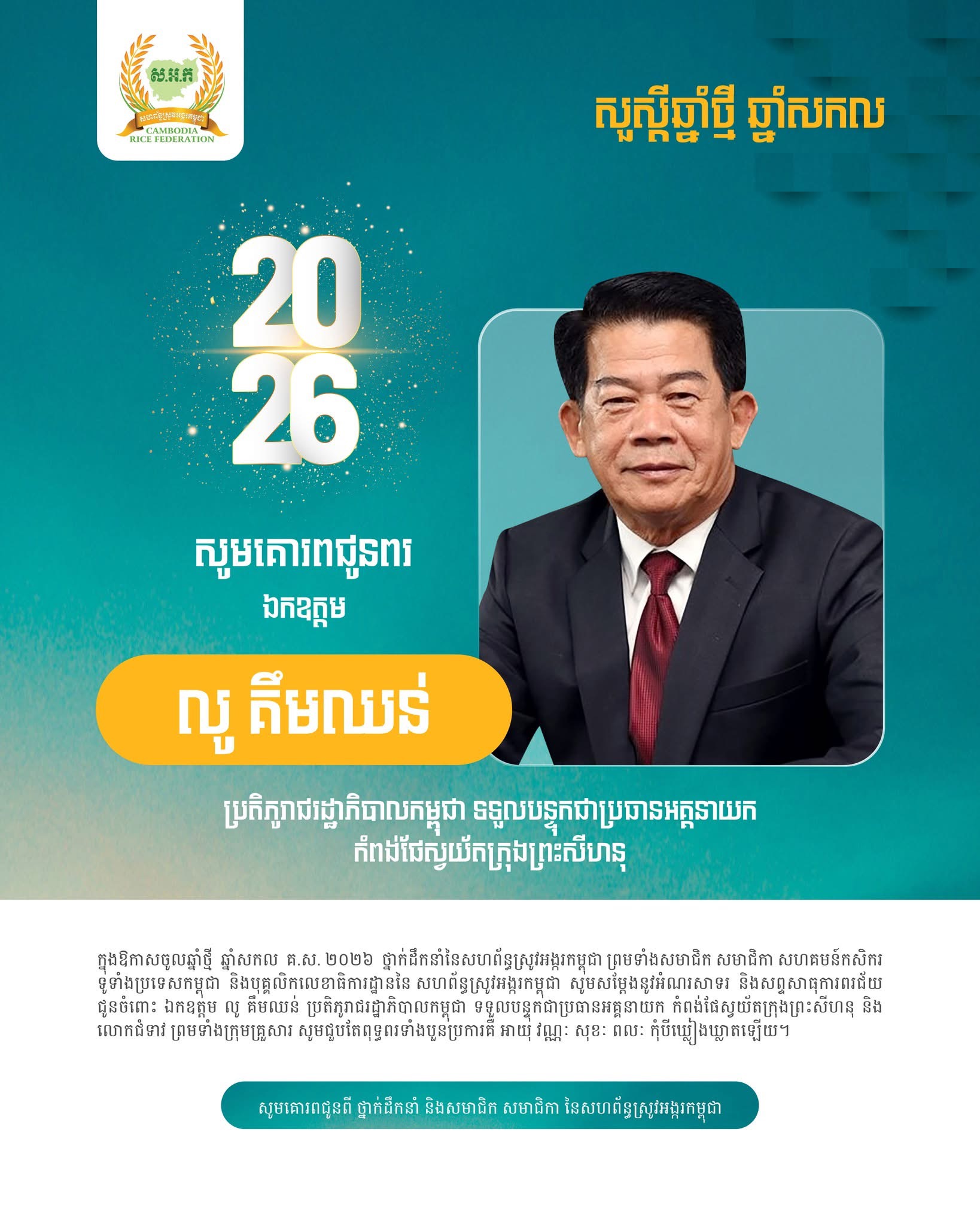 ភ្នំពេញ:ក្នុងឱកាសចូលឆ្នាំថ្មី ឆ្នាំសកល គ.ស ២០២៦ ថ្នាក់ដឹកនាំនៃសហព័ន្ធស្រូវអង្ករកម្ពុជា ព្រមទាំងសមាជិក សមាជិកា សហគមន៍កសិករទូទាំងប្រទេសកម្ពុជា និងបុគ្គលិកលេខាធិការដ្ឋាននៃសហព័ន្ធស្រូវអង្ករកម្ពុជា សូមសម្ដែងនូវអំណរសាទរ និងសព្ទសាធុការពរជ័យ ជូនចំពោះ ឯកឧត្តម លូ គឺមឈន់ ប្រតិភូរាជារដ្ឋាភិបាលកម្ពុជា ទទួលបន្ទុកជាប្រធានអគ្គនាយកកំពង់ផែស្វយ៍តក្រុងព្រះសីហនុ និងលោកជំទាវ សូមជួបតែពុទ្ធពរទាំងបួនប្រការគឺ អាយុ វណ្ណៈ សុខៈ ពលៈ កុំបីឃ្លៀងឃ្លាតឡើយ។