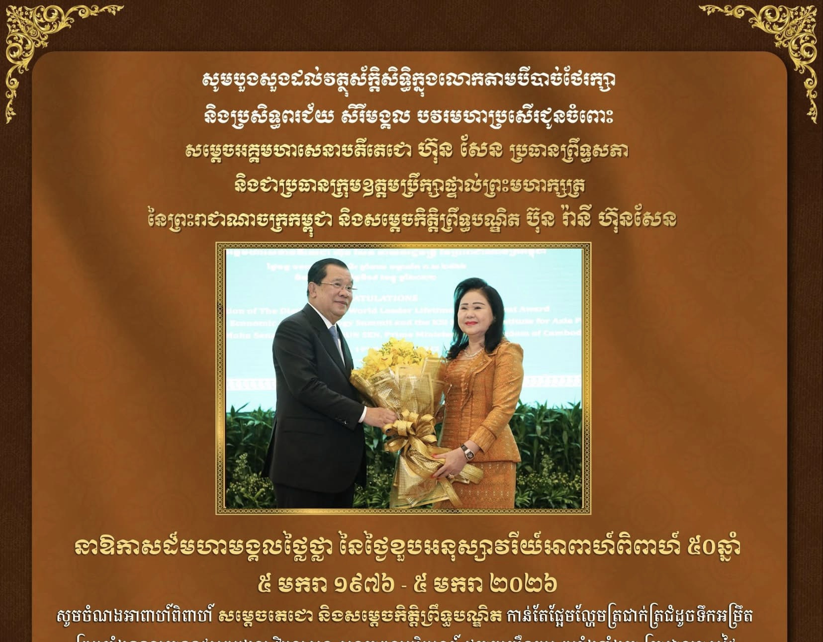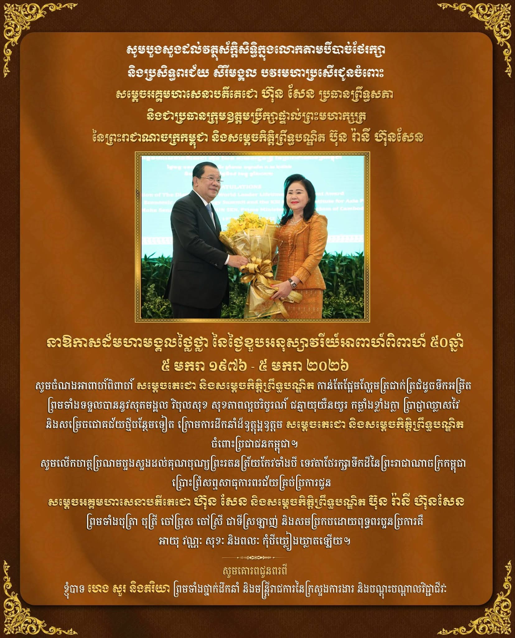 ភ្នំពេញ: ឯកឧត្តម ហេង សួរ រដ្ឋមន្រ្តីក្រសួងការងារ និងបណ្តុះបណ្តាលវិជ្ជាជីវៈនិងលោកជំទាវ សូមគោរពជូនពរ សម្តេចអគ្គមហាសេនាបតីតេជោ ហ៊ុន សែន ប្រធានព្រឹទ្ធសភា និងជាប្រធានក្រុមឧត្តមប្រឹក្សាផ្ទាល់ព្រះមហាក្សត្រ នៃព្រះរាជាណាចក្រកម្ពុជា និងសម្តេចកិត្តិព្រឹទ្ធបណ្ឌិត ប៊ុន រ៉ានី ហ៊ុនសែន ប្រធានកាកបាទក្រហមកម្ពុជា ក្នុងឱកាសដ៏សិរីមង្គលាភិរម្យប្រសើរថ្លៃថ្លាប្រកបដោយទឹកចិត្តសោមនស្សរីករាយនៃខួបអាពាហ៍ពិពាហ៍ គម្រប់ ៥០ឆ្នាំ របស់ សម្តេចអគ្គមហាសេនាបតីតេជោ និងសម្តេចកិត្តិព្រឹទ្ធបណ្ឌិត។