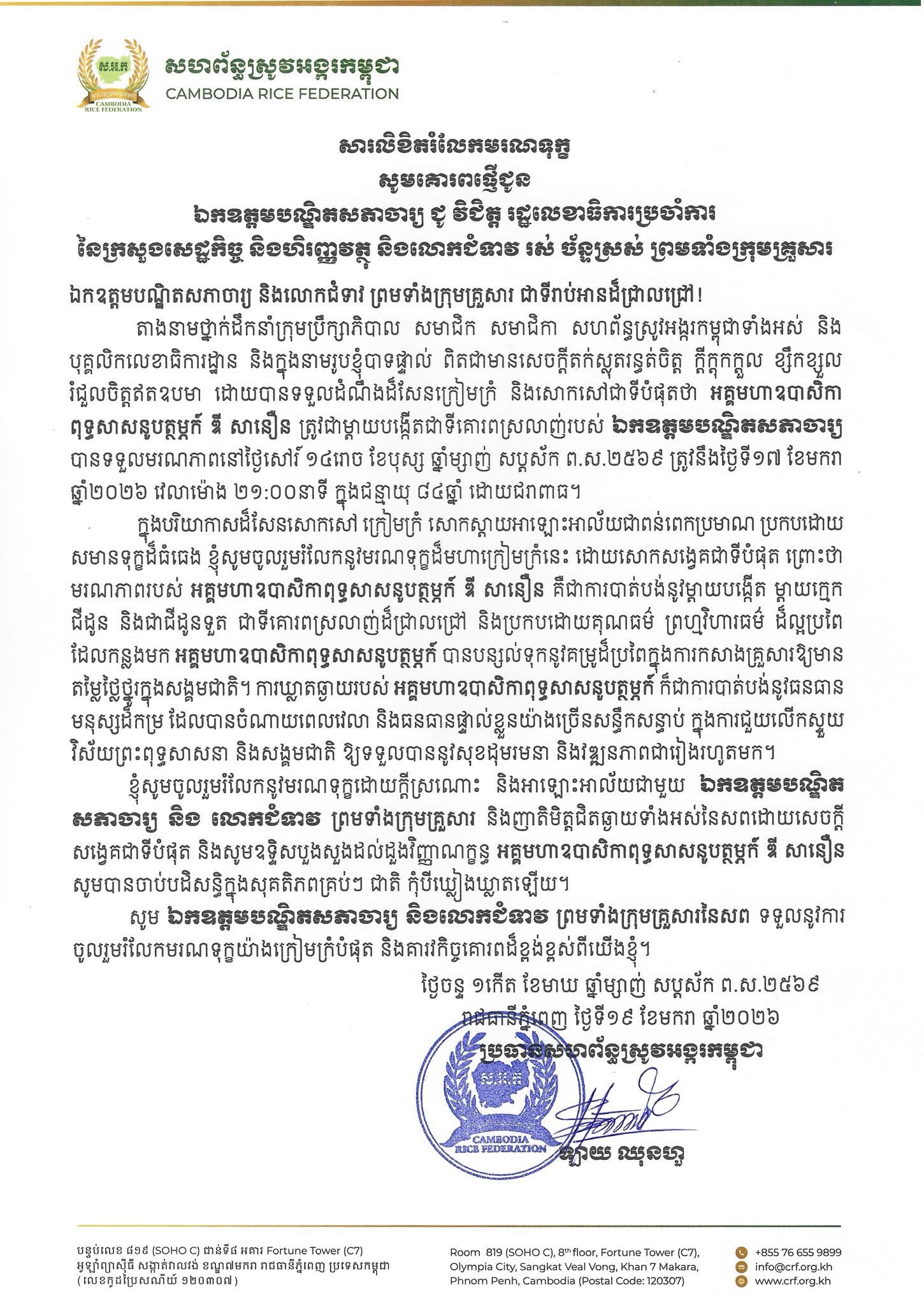 ថ្នាក់ដឹកនាំក្រុមប្រឹក្សាភិបាល សមាជិក សមាជិកា សហព័ន្ធស្រូវអង្ករកម្ពុជាទាំងអស់ និងបុគ្គលិកលេខាធិការដ្ឋាន សូមចូលរួមរំលែកនូវមរណទុក្ខដោយក្តីស្រណោះ និងអាឡោះអាល័យជាមួយ ឯកឧត្តមបណ្ឌិតសភាចារ្យ និង លោកជំទាវ ព្រមទាំងក្រុមគ្រួសារ និងញាតិមិត្តជិតឆ្ងាយទាំងអស់នៃសពដោយសេចក្តីសង្វេគជាទីបំផុត និងសូមឧទ្ទិសបួងសួងដល់ដួងវិញ្ញាណក្ខន្ធ អគ្គមហាឧបាសិកាពុទ្ធសាសនូបត្ថម្ភក៍ ឌី សានឿន សូមបានចាប់បដិសន្ធិក្នុងសុគតិភពគ្រប់ៗ ជាតិ កុំបីឃ្លៀងឃ្លាតឡើយ។