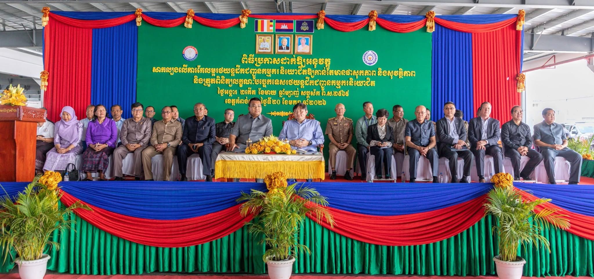 (កំពង់ឆ្នាំង)៖ ពិធីប្រកាសដាក់ឱ្យអនុវត្តសាកល្បង លើការកែលម្អរថយន្តដឹកជញ្ជូនកម្មករនិយោជិតឱ្យកាន់តែមានផាសុកភាព និងសុវត្ថិភាព និងការត្រួតពិនិត្យលក្ខណៈបច្ចេកទេសរថយន្តដឹកជញ្ជូនកម្មករនិយោជិត ជាលើកទី២ ត្រូវបានរៀបចំឡើងដោយបេឡាជាតិសន្តិសុខសង្គម ក្រោមសហអធិបតីភាពដ៏ខ្ពង់ខ្ពស់របស់ ឯកឧត្តម ហេង សួរ រដ្ឋមន្ត្រីក្រសួងការងារ និងបណ្ដុះបណ្ដាលវិជ្ជាជីវៈ និង ឯកឧត្តម ប៉េង ពោធិ៍នា រដ្ឋមន្ត្រីក្រសួងសាធារណការ និងដឹកជញ្ជូន នារសៀលថ្ងៃអង្គារ ទី២០ ខែមករា ឆ្នាំ២០២៦ នៅរោងចក្រ ស៊ិនគី អឹភែរឹល (SHINKI APPAREL (CAMBODIA)) ក្នុងខេត្តកំពង់ឆ្នាំង ស្របតាមអនុសាសន៍ដ៏ខ្ពង់ខ្ពស់របស់សម្ដេចមហាបវរធិបតី ហ៊ុន ម៉ាណែត នាយករដ្ឋមន្ត្រី ឱ្យសិក្សាយន្តការគាំទ្រ និងលើកទឹកចិត្តឱ្យមានការកែលម្អមធ្យោបាយដឹកជញ្ជូនកម្មករនិយោជិតឱ្យមានផាសុកភាព និងសុវត្ថិភាពជាងមុន ឱ្យបានមុនដំណាច់ឆ្នាំ២០២៧។