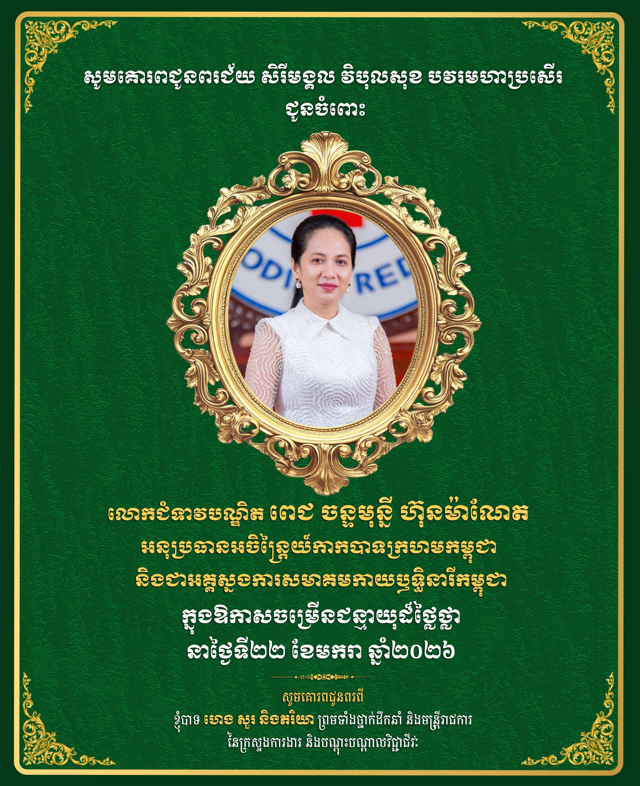 សារលិខិតជូនពរសូមគោរពជូន លោកជំទាវបណ្ឌិត ពេជ ចន្ទមុន្នី ហ៊ុន ម៉ាណែត អនុប្រធានអចិន្ត្រៃយ៍ កាកបាទក្រហមកម្ពុជា និងជាអគ្គស្នងការ នៃសមាគមកាយឫទ្ធិនារីកម្ពុជាក្នុងឱកាសដ៏ ថ្លៃថ្លានៃទិវាខួបចម្រើនជន្មាយុនៅថ្ងៃទី២២ ខែមករា ឆ្នាំ២០២៦ ។