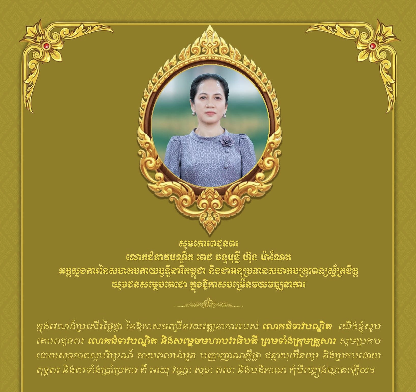 នៅក្នុងវេលាដ៏មង្គលប្រសើរថ្លៃថ្លា នៃឱកាសចម្រើនវយវឌ្ឍនាការរបស់ លោកជំទាវបណ្ឌិត យើងខ្ញុំសូមគោរពជូនពរ លោកជំទាវបណ្ឌិត និងសម្តេចមហាបវរធិបតី ព្រមទាំងក្រុមគ្រួសារ សូមប្រកបដោយសុខភាពល្អបរិបូរណ៍ កាយពលមាំមួន បញ្ញាញាណភ្លឺថ្លា ជន្មាយុយឺនយូរ និងសូមប្រកបដោយពុទ្ធពរ និងពរដ៏ថ្លៃថ្លាទាំងប្រាំប្រការ គឺ អាយុ វណ្ណៈ សុខៈ ពលៈ និងបដិភាណ កុំបីឃ្លៀងឃ្លាតឡើយ។