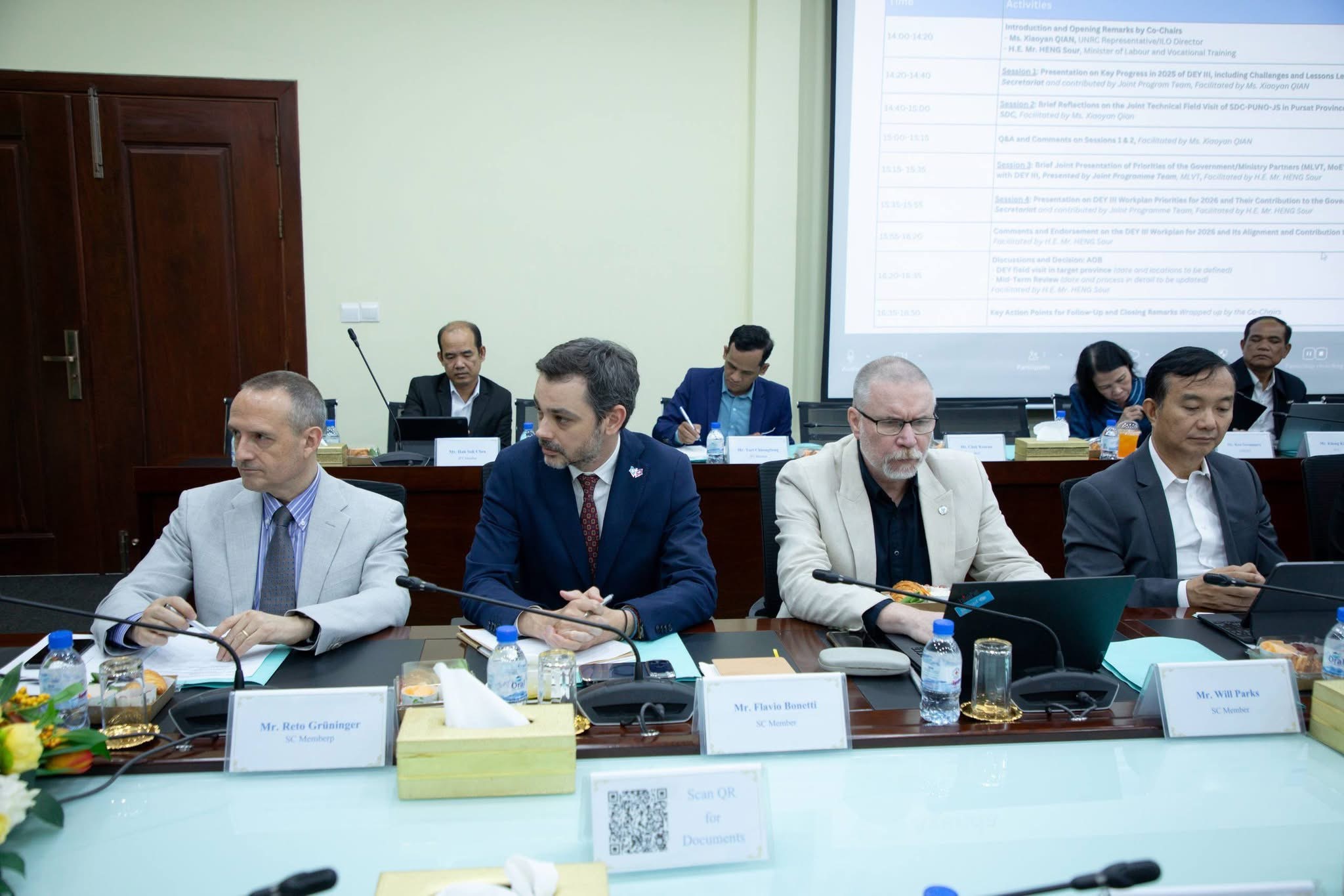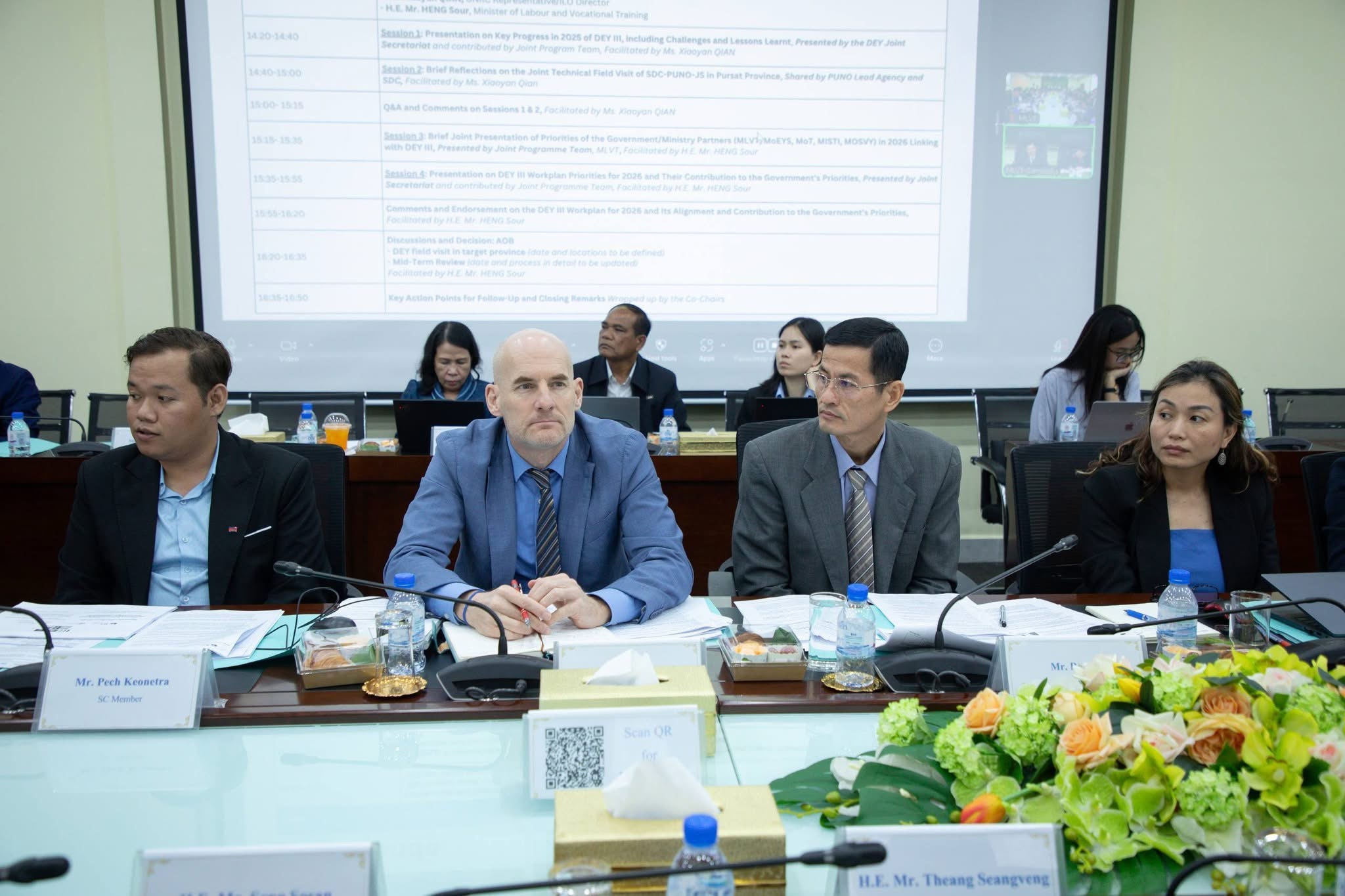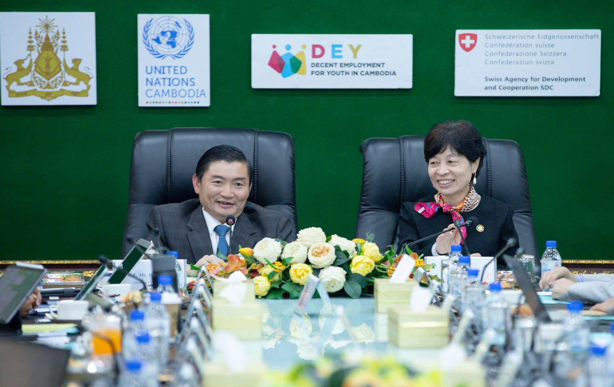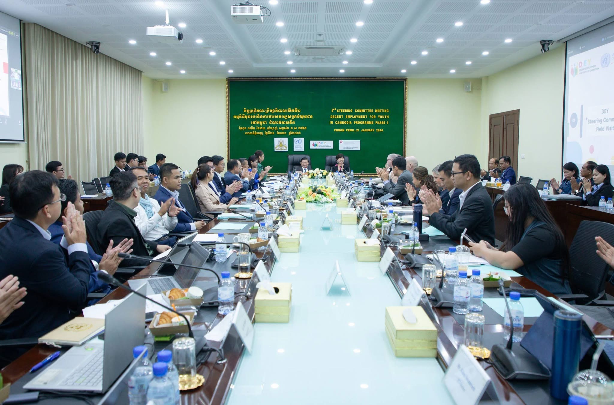 (ភ្នំពេញ)៖ ឯកឧត្តម ហេង សួរ រដ្ឋមន្រ្តីក្រសួងការងារ និងបណ្តុះបណ្តាលវិជ្ជាជីវៈ និងលោកស្រី Xiaoyan Qian នាយិកាការិយាល័យអង្គការអន្តរជាតិខាងការងារ (ILO) ប្រចាំប្រទេសកម្ពុជា ឡាវ និងថៃ និងជាតំណាងអង្គការសហប្រជាជាតិ (UN) ប្រចាំកម្ពុជា បានអញ្ជើញធ្វើជាសហប្រធានក្នុងកិច្ចប្រជុំលើកទី២ របស់គណៈប្រឹក្សាភិបាល នៃកម្មវិធីមុខរបរ និងការងារសមរម្យសម្រាប់យុវជននៅកម្ពុជា ដំណាក់កាលទី៣ (DEY III) នារសៀលថ្ងៃពុធ ទី២១ ខែមករា ឆ្នាំ២០២៦ នៅទីស្តីការក្រសួង។