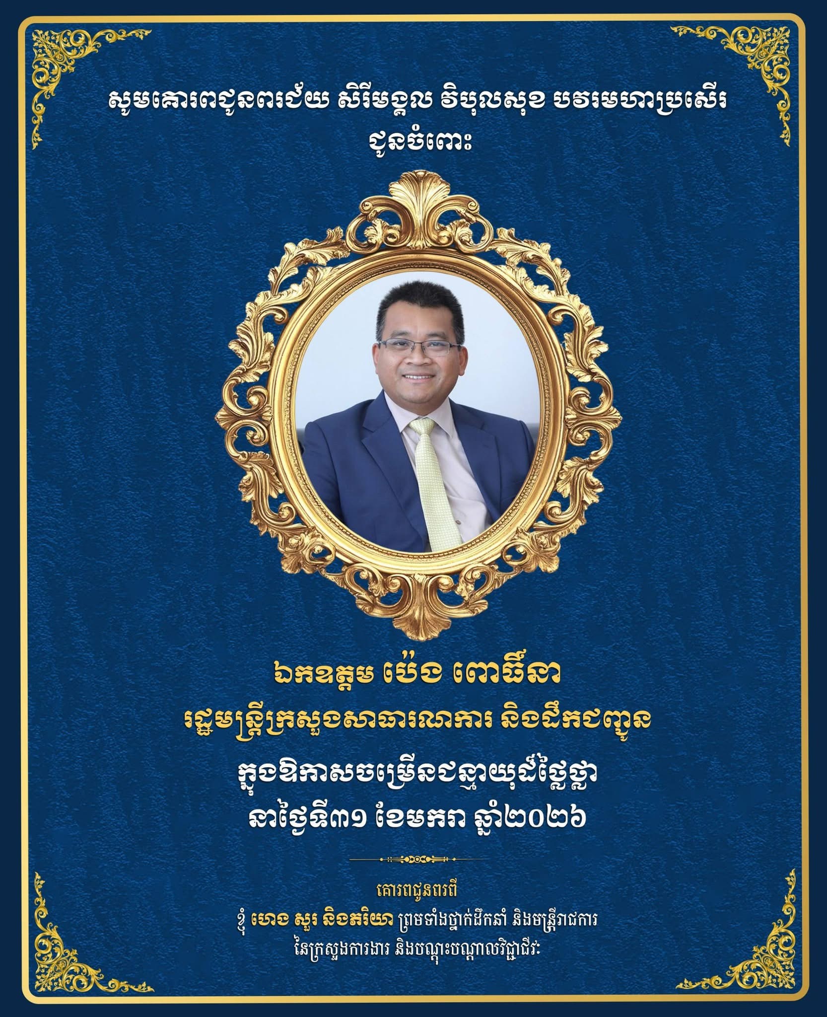 ភ្នំពេញ:ឯកឧត្តម ហេង សួរ និងភរិយា ព្រមទាំងថ្នាក់ដឹកនាំ និងមន្ត្រីរាជការ នៃក្រសួងការងារ និងបណ្តុះបណ្តាលវិជ្ជាជីវៈ សូមប្រសិទ្ធពរជ័យជូនចំពោះ ឯកឧត្តម ប៉េង ពោធិ៍នា រដ្ឋមន្ត្រីក្រសួងសាធារណការ និងដឹកជញ្ជូន ក្នុងឱកាសចម្រើនជន្មាយុដ៏ថ្លៃថ្លា ដែលប្រព្រឹត្តទៅនាថ្ងៃទី៣១ ខែមករា ឆ្នាំ២០២៦។