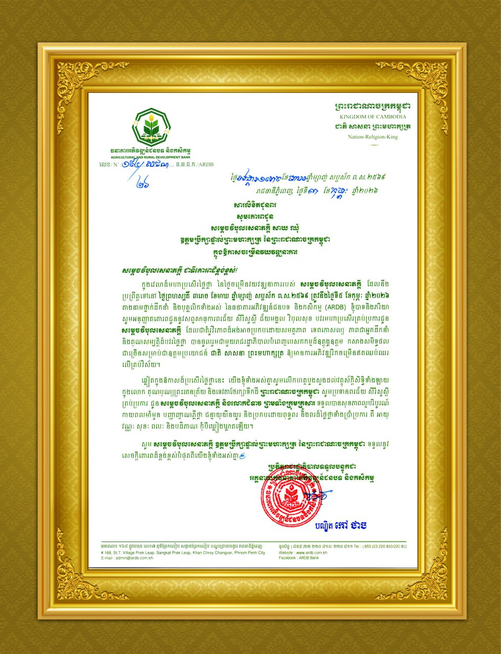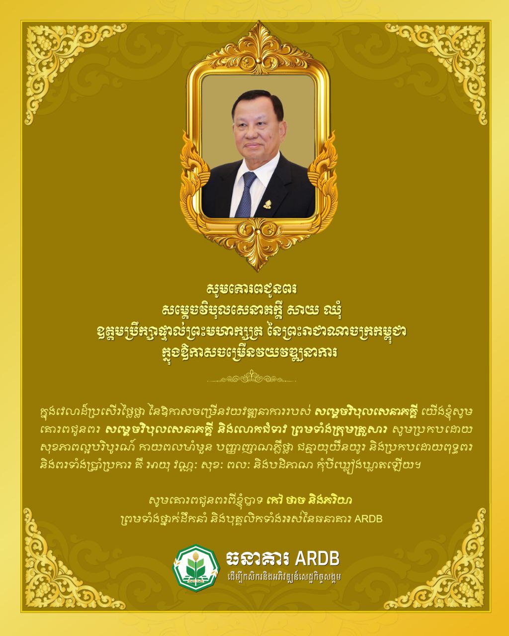 ភ្នំពេញ៖ ឯកឧត្តមបណ្ឌិត កៅ ថាច ប្រតិភូរាជរដ្ឋាភិបាលទទួលបន្ទុក ជាអគ្គនាយកធនាគារអភិវឌ្ឍន៍ជនបទ និងកសិកម្ម ថ្នាក់ដឹកនាំ និងបុគ្គលិក ក្រោមឱវាទទាំងអស់ នៅក្នុងវេលាដ៏មង្គលប្រសើរថ្លៃថ្លា នៃឱកាសចម្រើនវយវឌ្ឍនាការរបស់ សម្ដេចវិបុលសេនាភក្ដី យើងខ្ញុំសូមគោរពជូនពរ សម្ដេចវិបុលសេនាភក្ដី និងលោកជំទាវ ព្រមទាំងក្រុមគ្រួសារ សូមប្រកបដោយសុខភាពល្អបរិបូរណ៍ កាយពលមាំមួន បញ្ញាញាណភ្លឺថ្លា ជន្មាយុយឺនយូរ និងសូមប្រកបដោយពុទ្ធពរ និងពរដ៏ថ្លៃថ្លាទាំងប្រាំប្រការ គឺ អាយុ វណ្ណៈ សុខៈ ពលៈ និងបដិភាណ កុំបីឃ្លៀងឃ្លាតឡើយ។