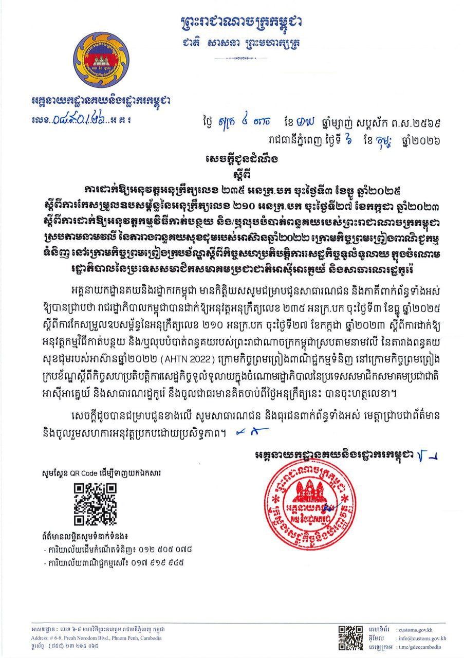 ភ្នំពេញ: អគ្គនាយកដ្ឋានគយនិងរដ្ឋាករកម្ពុជា ចេញសេចក្តីជូនដំណឹង ស្តីពីការដាក់ឱ្យអនុវត្តកម្មវិធីកាត់បន្ថយ និង-ឬលុបបំបាត់ពន្ធគយរបស់ព្រះរាជាណាចក្រកម្ពុជាស្របតាមនាមវលី នៃតារាងពន្ធគយសុខដុមរបស់អាស៊ានឆ្នាំ២០២២ ក្រោមកិច្ចព្រមព្រៀងពាណិជ្ជកម្មទំនិញនៅក្រោមកិច្ចព្រមព្រៀងក្របខ័ណ្ឌស្តីពីកិច្ចសហប្រតិបត្តិការសេដ្ឋកិច្ចទូលំទូលាយ ក្នុងចំណោមរដ្ឋាភិបាលនៃប្រទេសសមាជិកសមាគមប្រជាជាតិអាស៊ីអាគ្នេហ៍ និងសាធារណរដ្ឋកូរ៉េ។