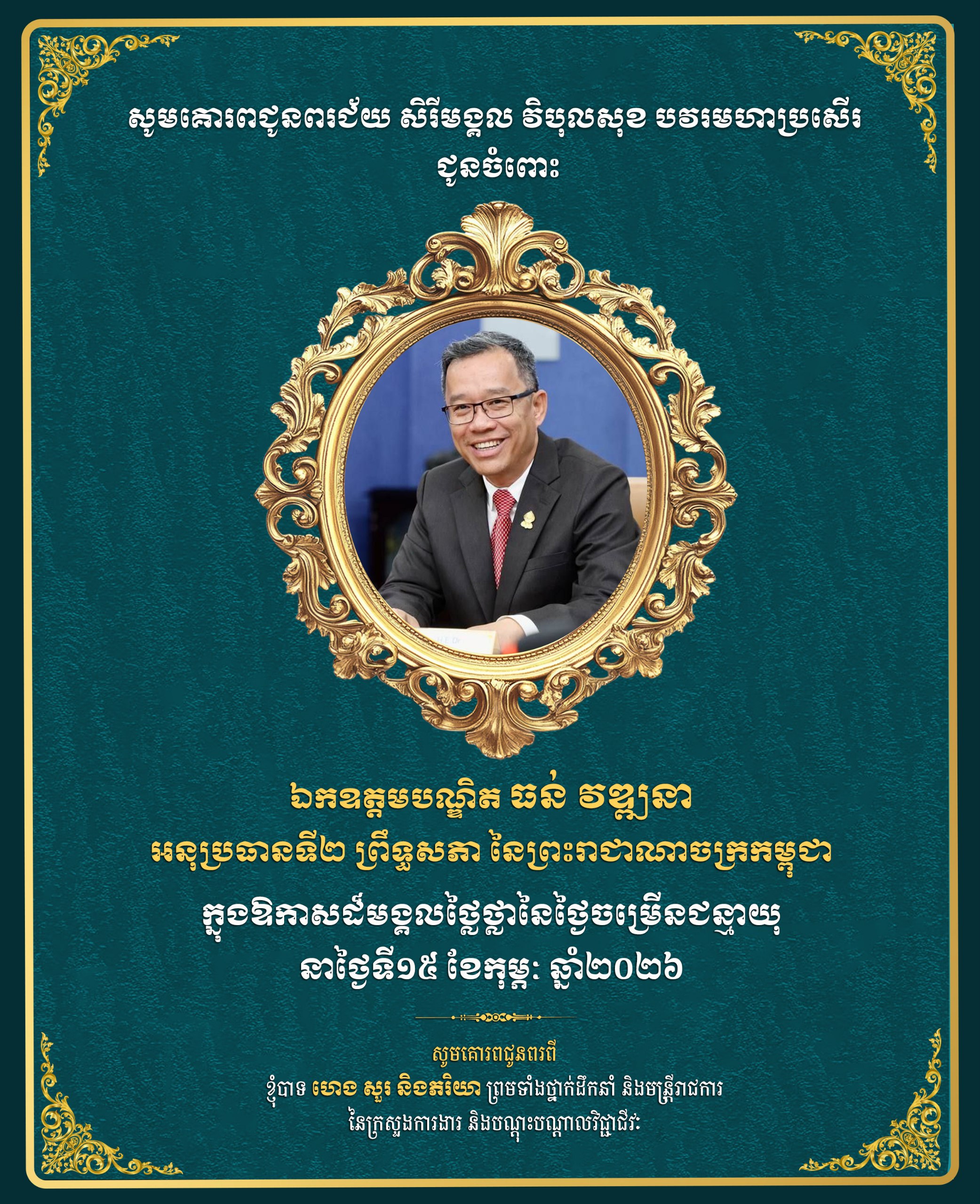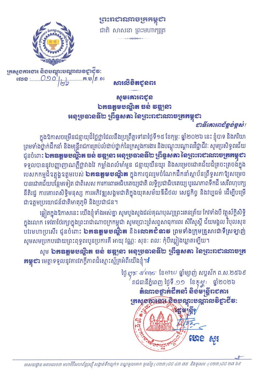 ភ្នំពេញ: ឯកឧត្តម ហេង សួរ និងភរិយា ព្រមទាំងថ្នាក់ដឹកនាំ និងមន្ត្រីរាជការ នៃក្រសួងការងារ និងបណ្តុះបណ្តាលវិជ្ជាជីវៈ សូមប្រសិទ្ធពរជ័យគោរពជូនចំពោះ ឯកឧត្តមបណ្ឌិត ធន់ វឌ្ឍនា អនុប្រធានទី២ ព្រឹទ្ធសភា នៃព្រះរាជាណាចក្រកម្ពុជា ក្នុងឱកាសចម្រើនជន្មាយុដ៏ថ្លៃថ្លា ដែលប្រព្រឹត្តទៅនាថ្ងៃទី១៥ ខែកុម្ភៈ ឆ្នាំ២០២៦។