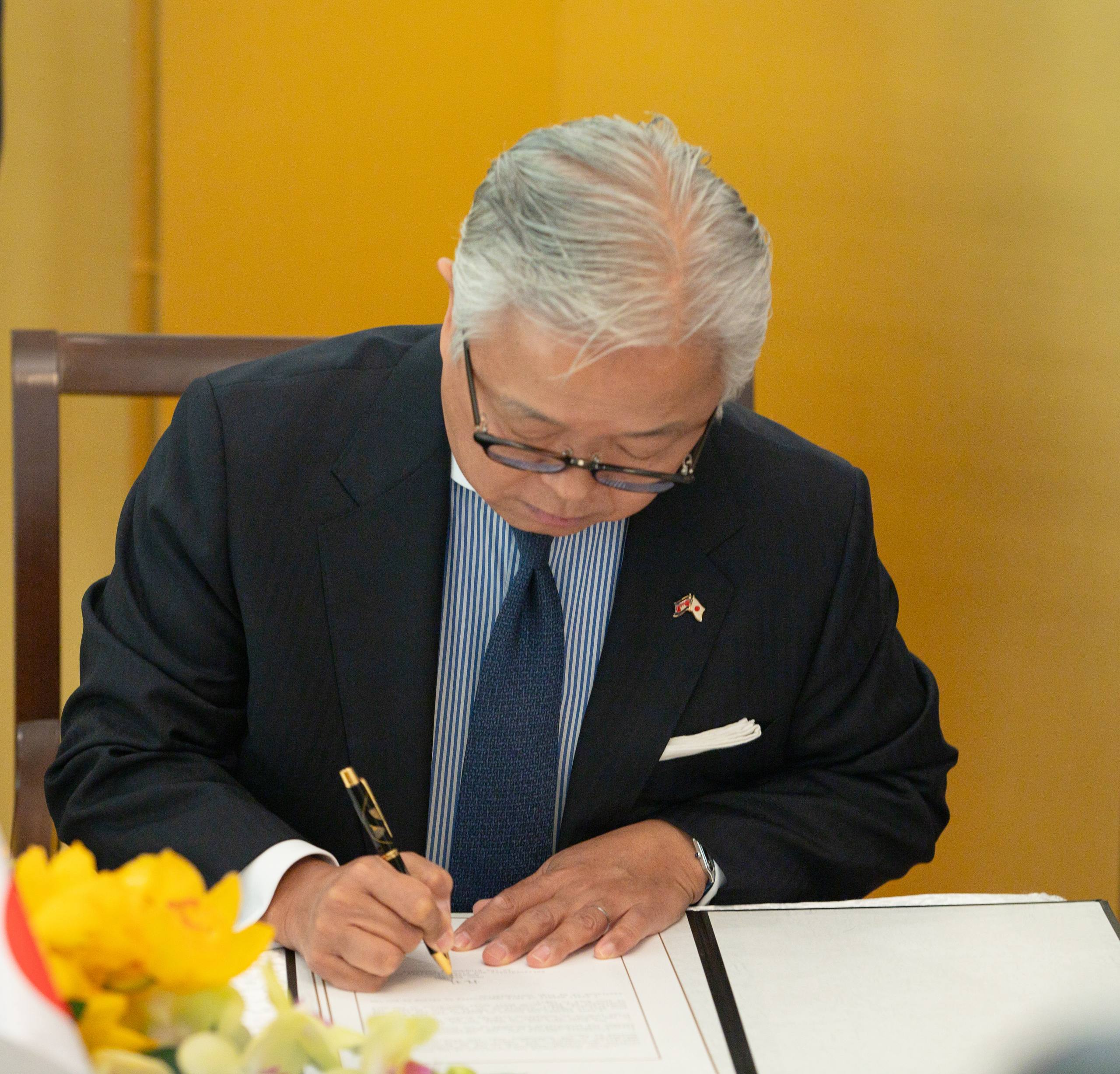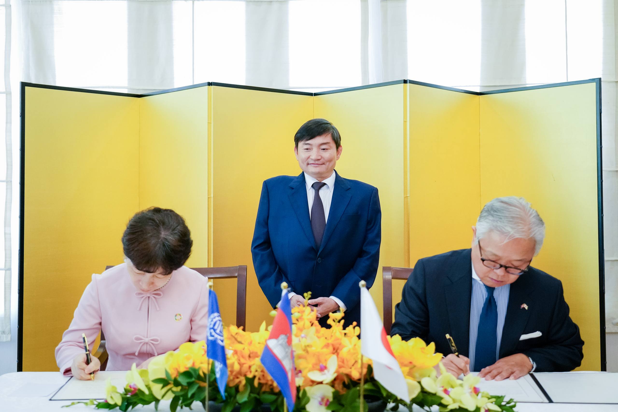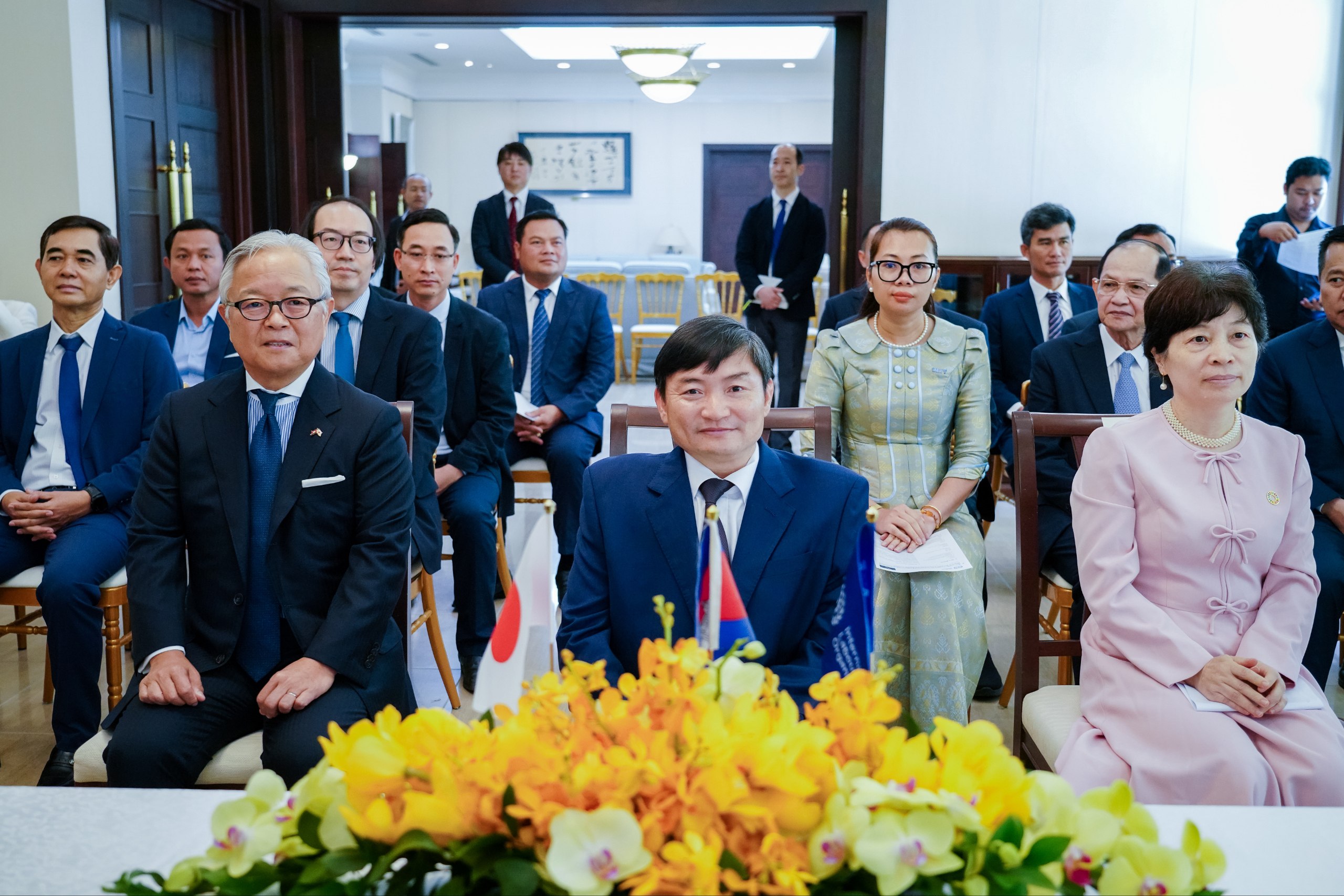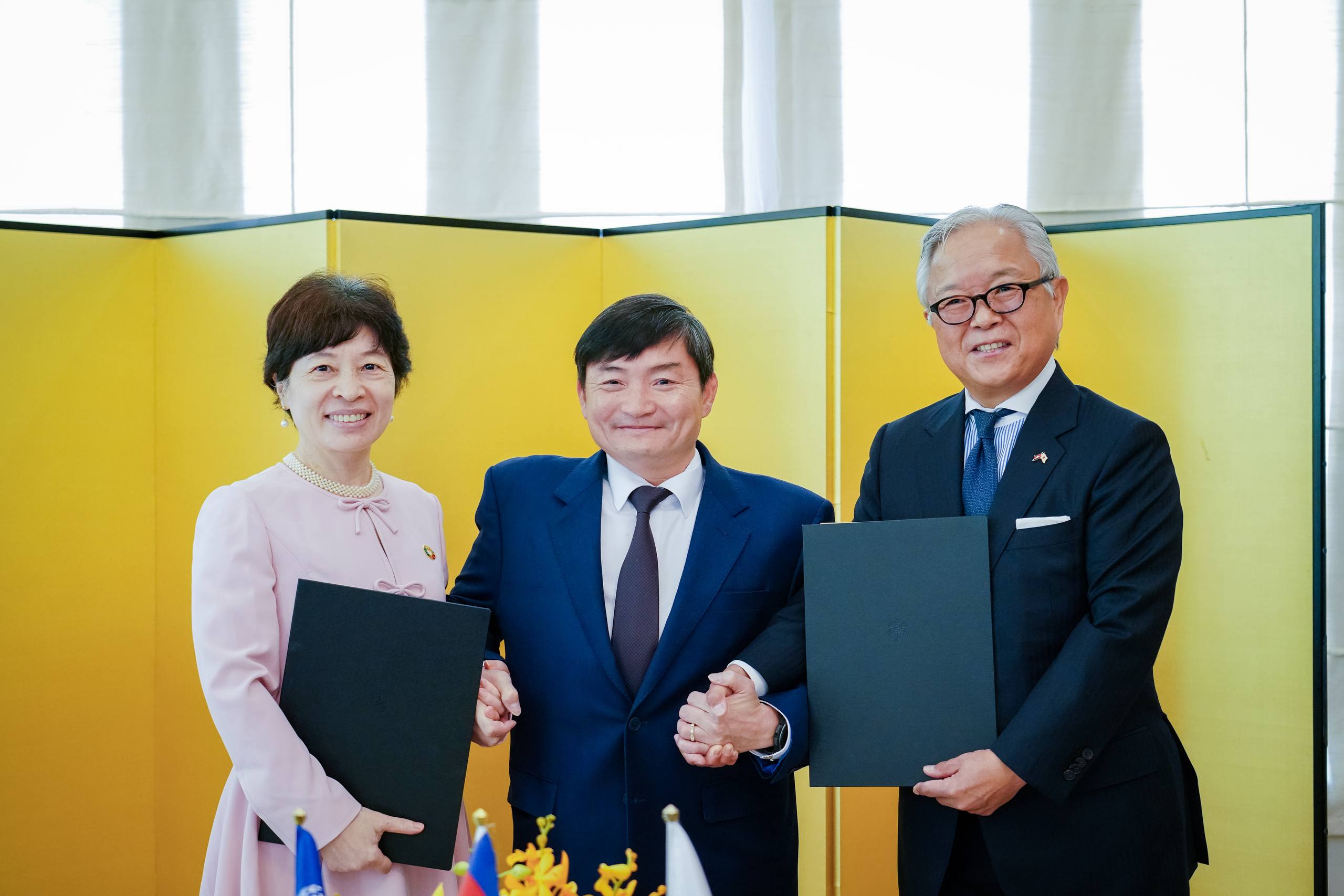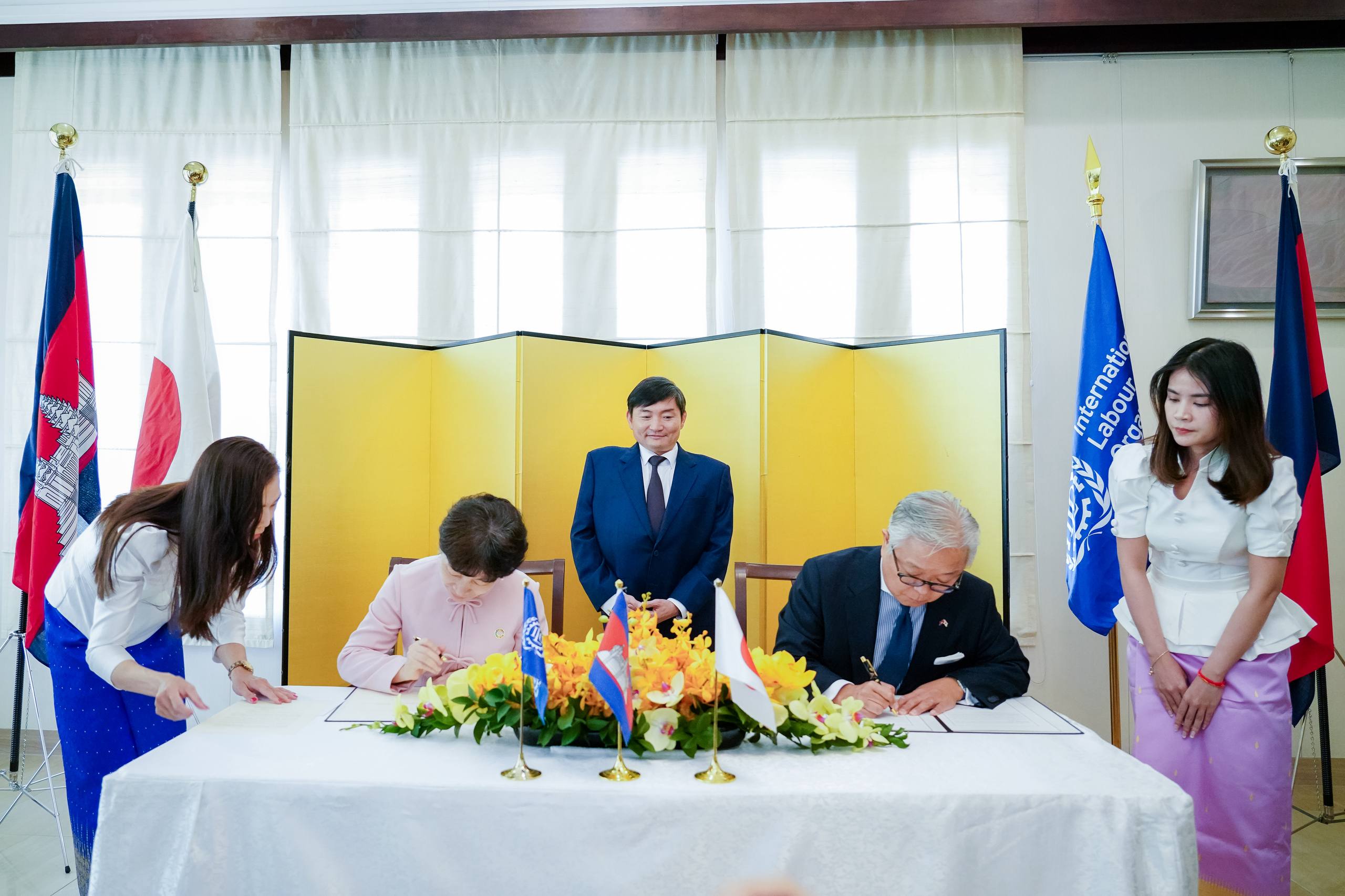 (ភ្នំពេញ)៖ ឯកឧត្តម ហេង សួរ រដ្ឋមន្ត្រីក្រសួងការងារ និងបណ្តុះបណ្តាលវិជ្ជាជីវៈ បានអញ្ជើញធ្វើជាសក្ខីភាពក្នុងពិធីចុះហត្ថលេខាលើគម្រោងស្តីពី «ការលើកកម្ពស់មុខរបរនិងការងារដល់ពលករចំណាកស្រុកត្រឡប់មកវិញ ដែលរងផលប៉ះពាល់ពីជម្លោះព្រំដែន» ដោយឯកឧត្ដម អ៊ូអិណុ អាត់ស៊ូស៊ី (UENO Atsushi) ឯកអគ្គរាជទូតវិសាមញ្ញ និងពេញសមត្ថភាពរបស់ប្រទេសជប៉ុនប្រចាំកម្ពុជា និងលោកស្រី ស៊ាវយៀន ឈាន (Xiaoyan Qian) នាយិកាការិយាល័យអង្គការ ILO ប្រចាំកម្ពុជា ឡាវ និងថៃ នាព្រឹកថ្ងៃទី១៨ ខែកុម្ភៈ ឆ្នាំ២០២៦ នៅស្ថានទូតជប៉ុន។