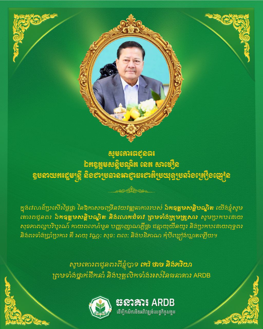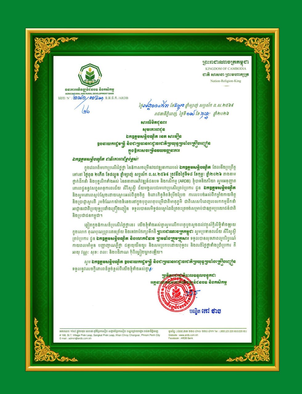 ភ្នំពេញ៖ ឯកឧត្ដមបណ្ឌិត កៅ ថាច ប្រតិភូរាជរដ្ឋាភិបាលទទួលបន្ទុកជាអគ្គនាយកធនាគារអភិវឌ្ឍន៍ជនបទ និងកសិកម្ម (ARDB) និងលោកជំទាវ ថ្នាក់ដឹកនាំ ព្រមទាំងបុគ្គលិកទាំងអស់ ក្នុងឱកាសដ៏មហាឯកឧត្ដមសន្ដិបណ្ឌិត នេត សាវឿន ឧបនាយករដ្ឋមន្ត្រី និងជាប្រធានអាជ្ញាធរជាតិប្រយុទ្ធប្រឆាំងគ្រឿងញៀន ក្នុងឱកាសចម្រើនវយវឌ្ឍនាការនៅ ថ្ងៃពុធ ២កើត ខែផល្គុន ឆ្នាំម្សាញ់ សប្តស័ក ព.ស.២៥៦៩ ត្រូវនឹងថ្ងៃទី១៨ ខែកុម្ភៈ ឆ្នាំ២០២៦នេះ ។